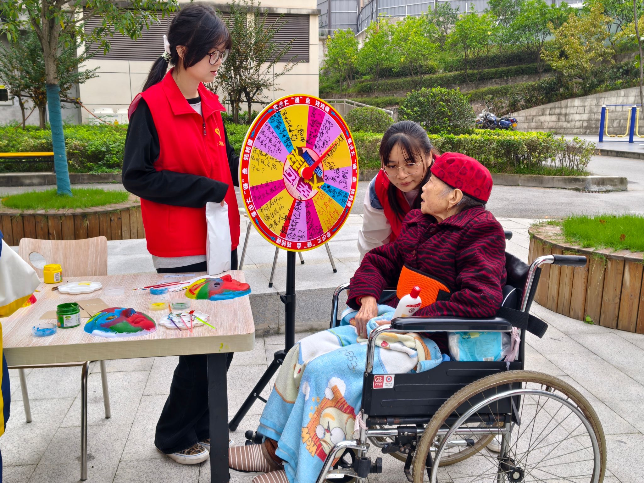活动现场分为"游戏+养生"两大板块,设欢乐套圈、象棋对弈、脸谱绘画、健康知识大转盘、按摩体验、怀旧乐坊六个趣味点位,每点位配备2–3名志愿者,确保为老人提供及时贴心服务。