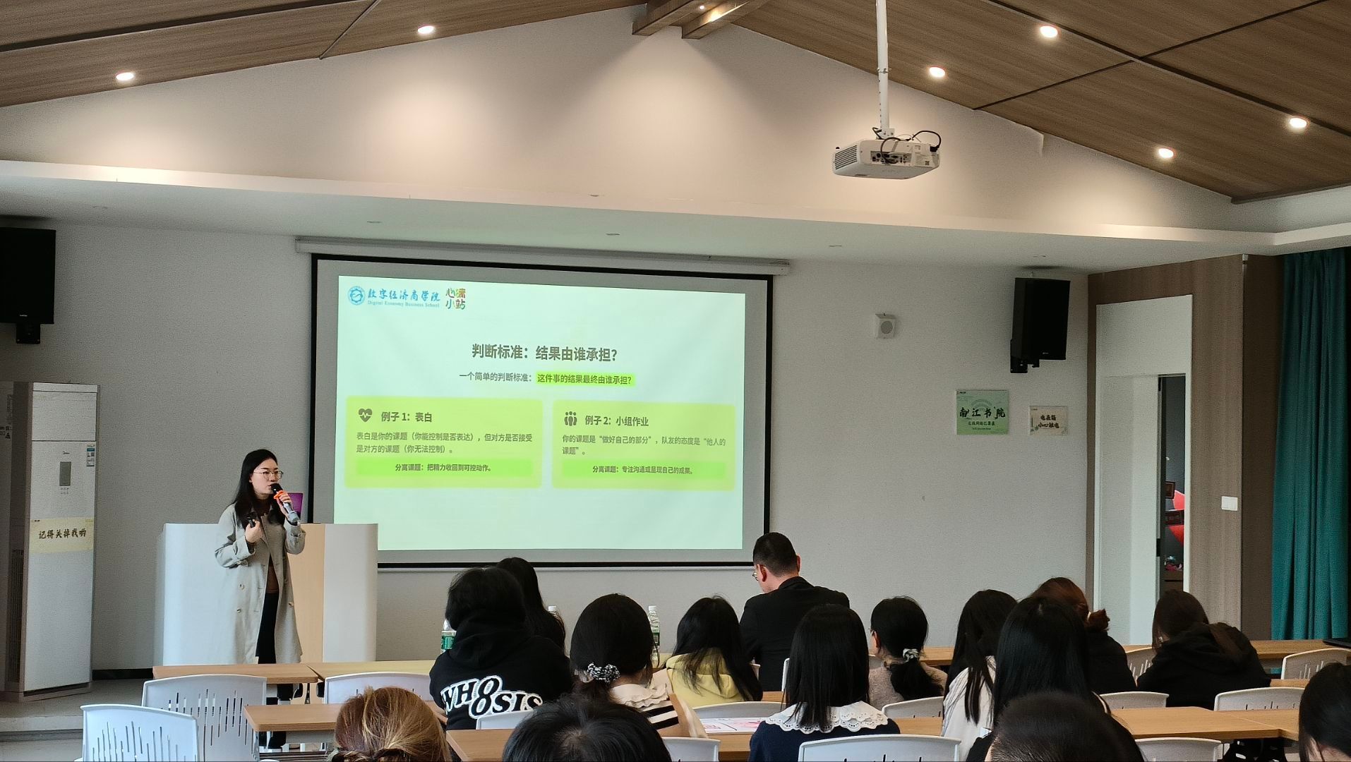 田老师阐明,“讨好≠友善”“拒绝≠冷漠”,并现场示范沟通话术:“我很理解你需要帮忙,但这次我手头有作业截止,实在抽不出时间,你可以问问其他同学”“我也想和大家选同一门课,但我更想尝试自己感兴趣的方向,之后我们可以互相分享笔记”。通过“温和表达立场+明确需求说明”,帮助学生掌握边界建立技巧,避免“委屈自己、勉强他人”的交往模式。