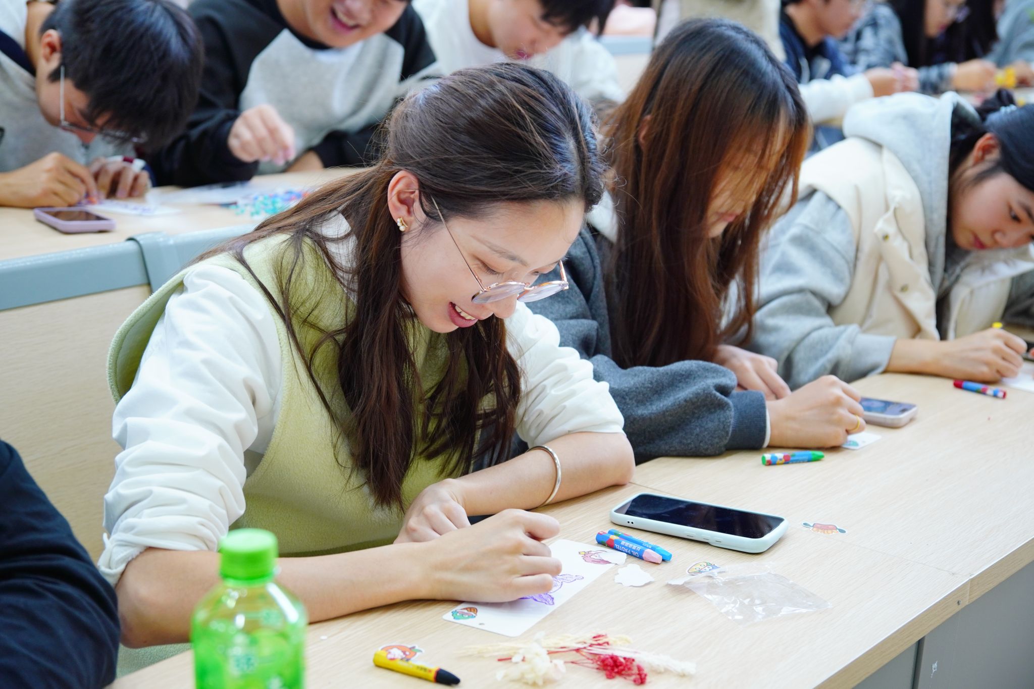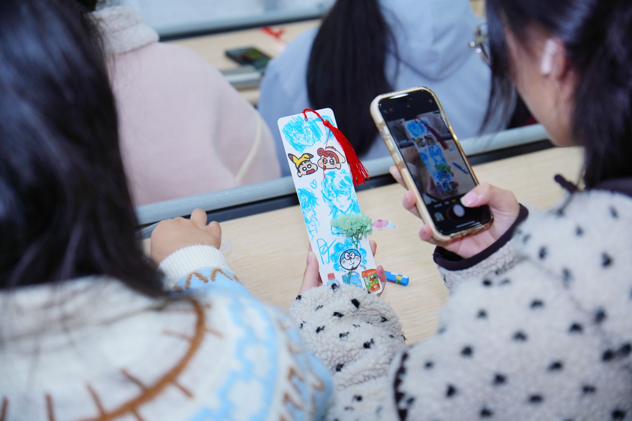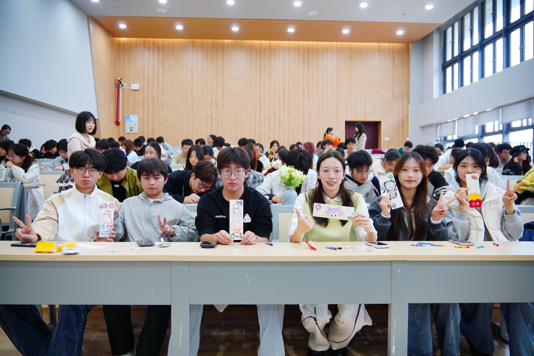 “方寸流光”书签DIY与“情感图谱”巨型画布创作环节,为学生提供实践性与沉浸感兼具的艺术表达空间。学生发挥创意,裁纸、绘图、题字,在书签上方寸之间融合传统美学与现代设计。