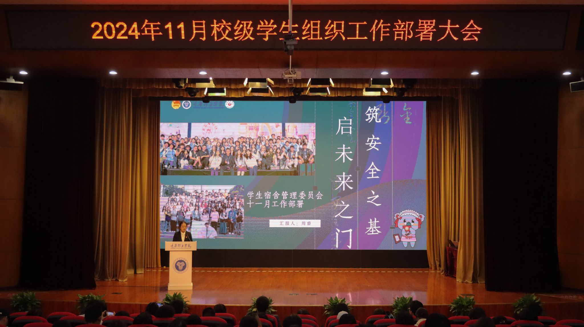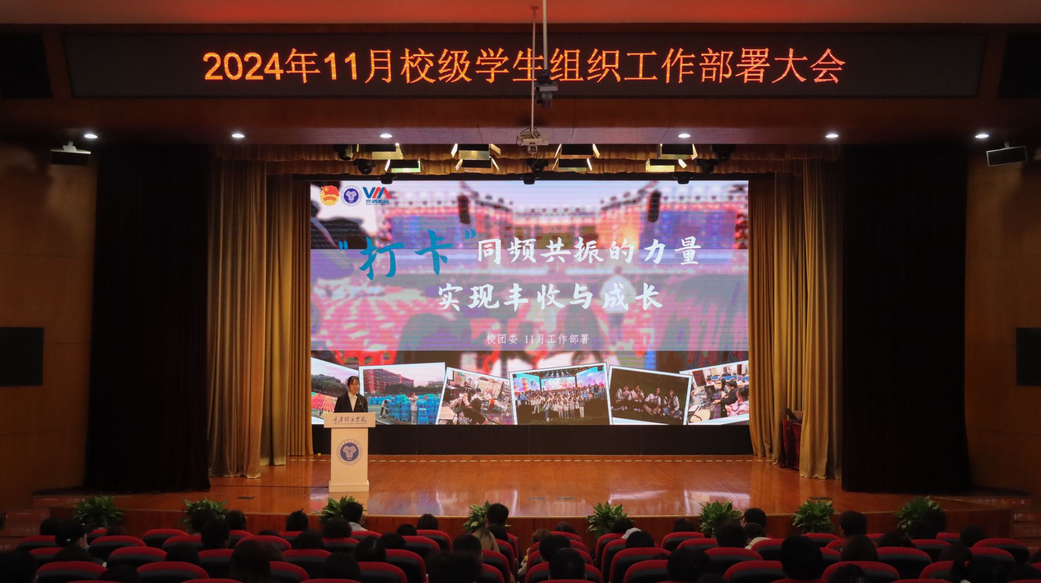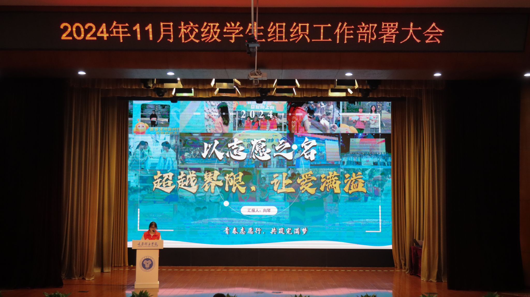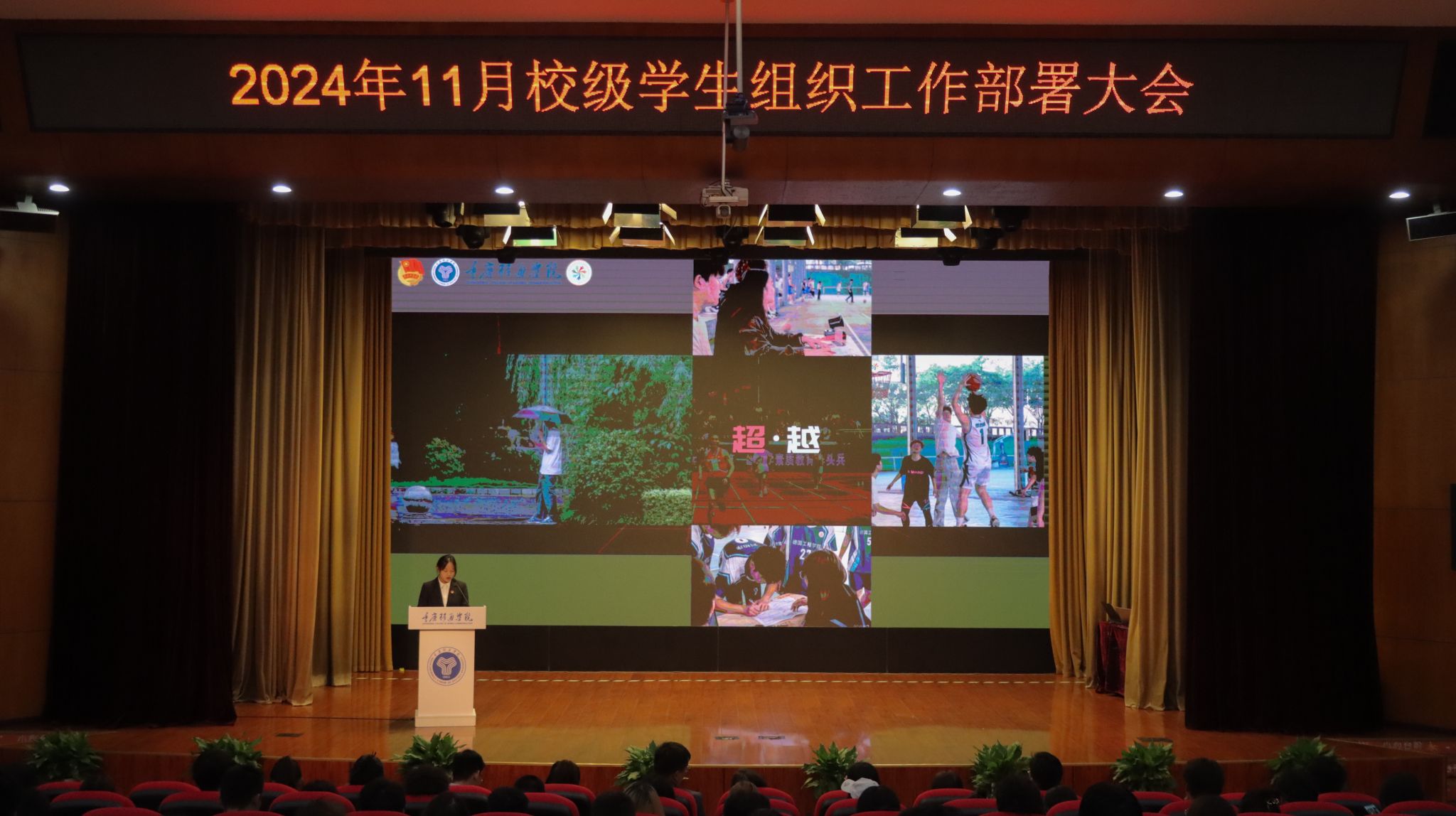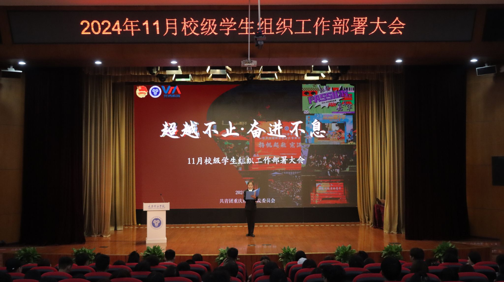 为紧扣学年工作指引,增强学生组织的凝聚力与创新力,提升完满教育发展活力。合川校区校团委于11月6日中午12:20,在下里巴人剧场举行《超越不止·奋进不息》——11月校级学生组织工作部署大会。校、院两级学生组织指导老师及学生代表共400余人出席参与。希望各学生组织干部以超越为目标,以奋进为动力,在各自的领域内发挥职能,不断追求卓越,突破自我,勇攀高峰。超越永无止境,奋进永不停歇!为完满教育奉献更优质的服务,打造更精彩的活动!
