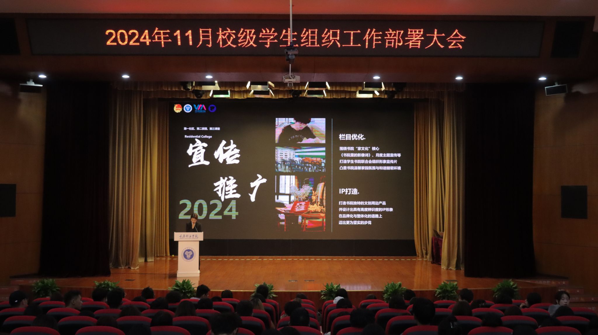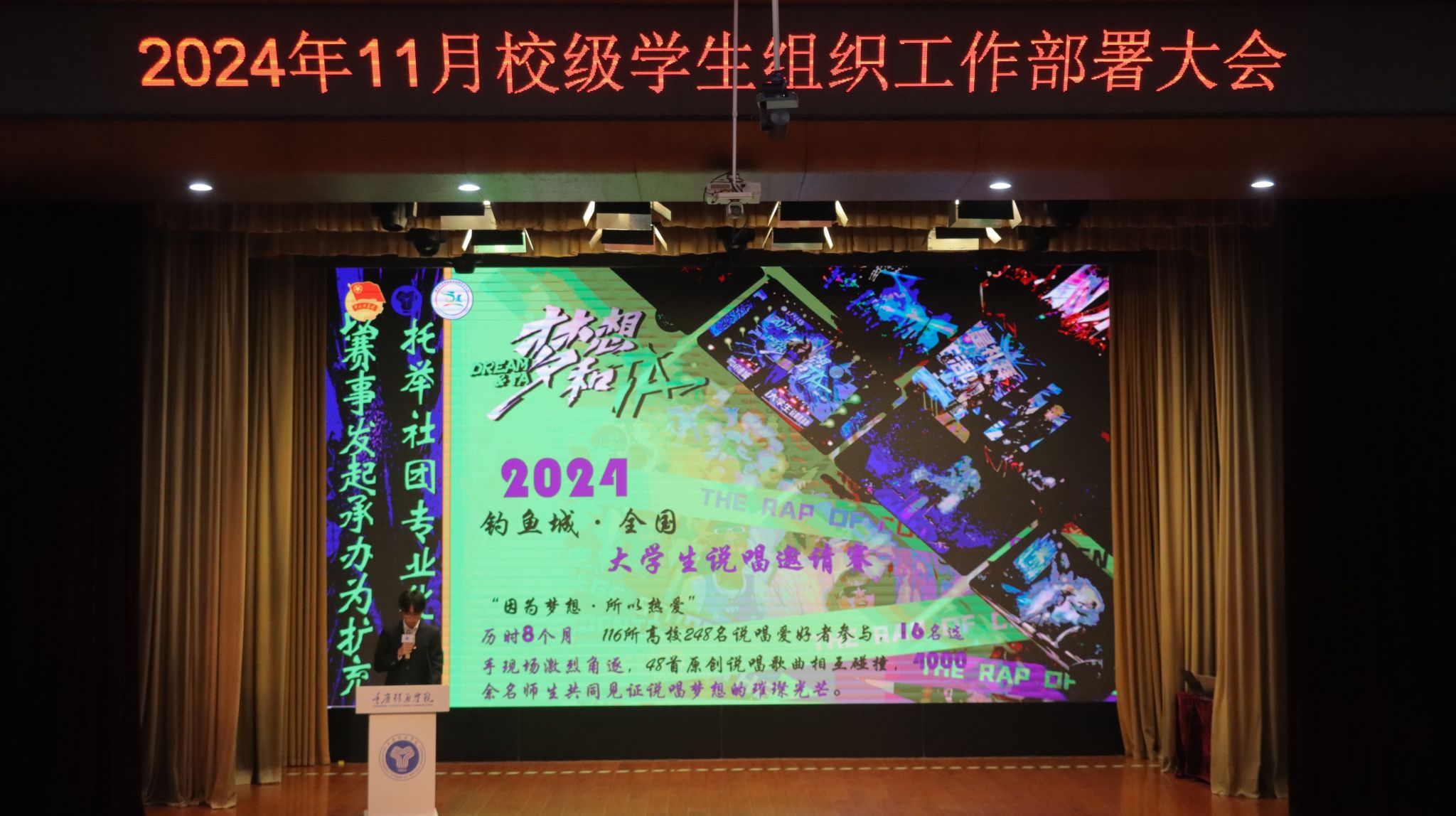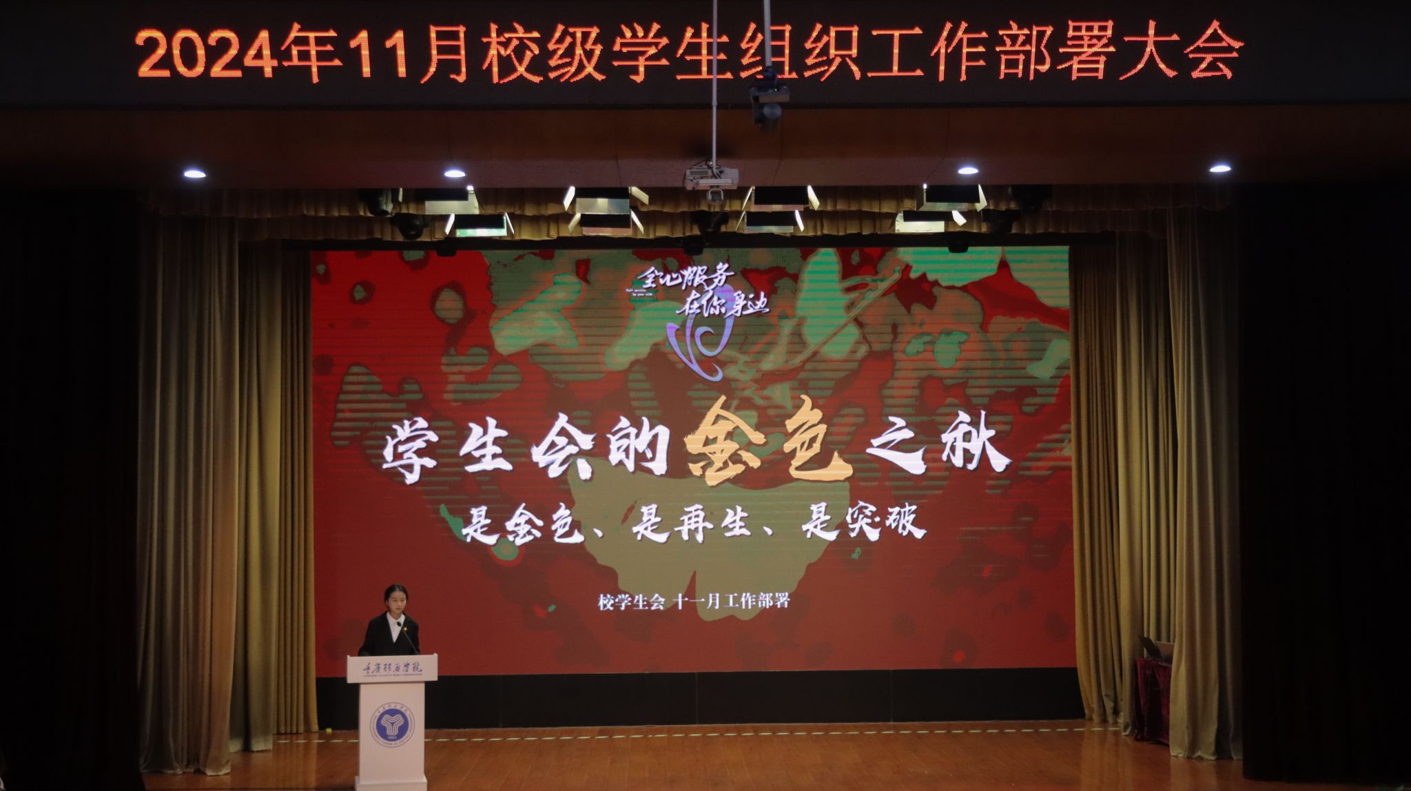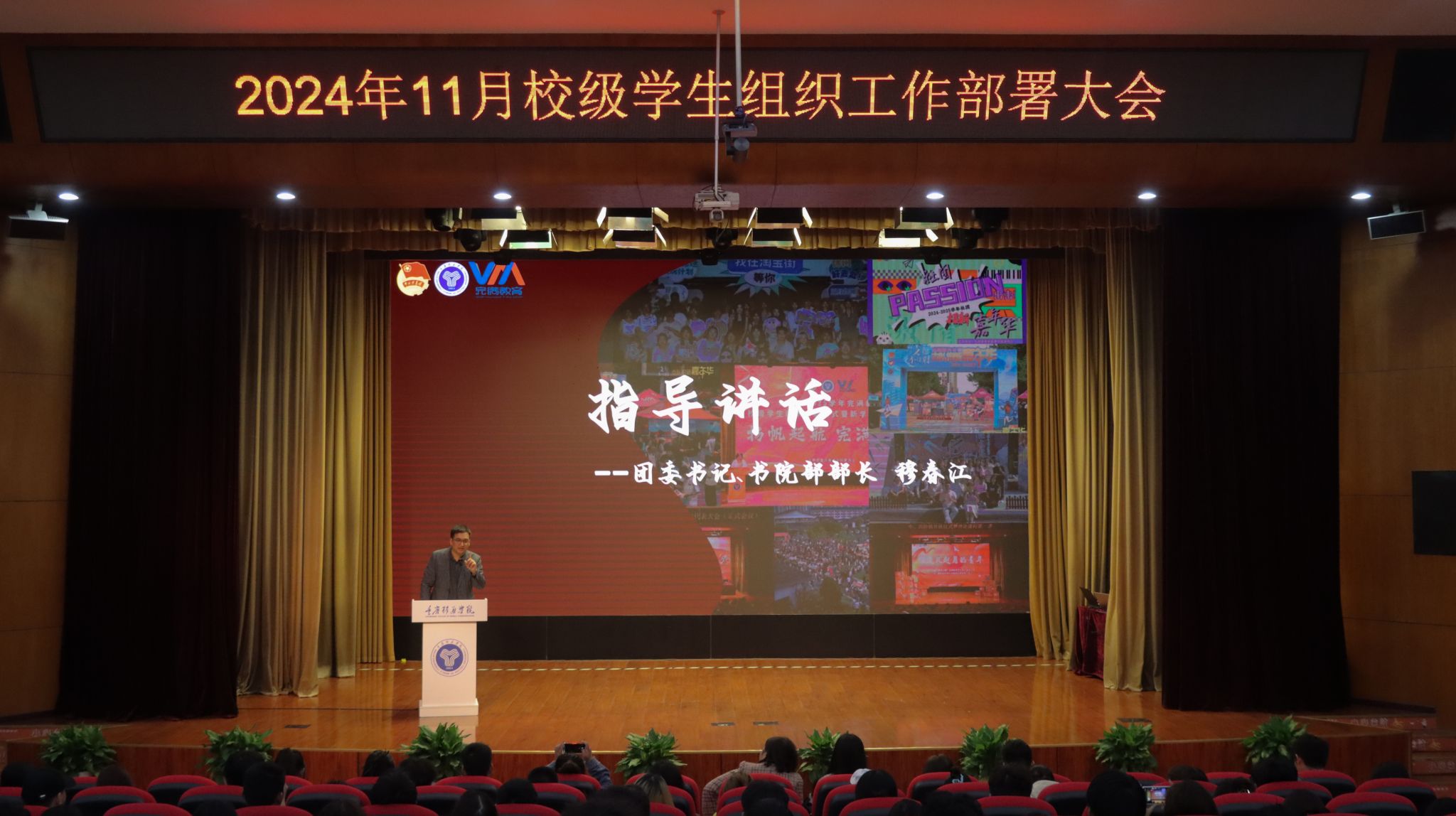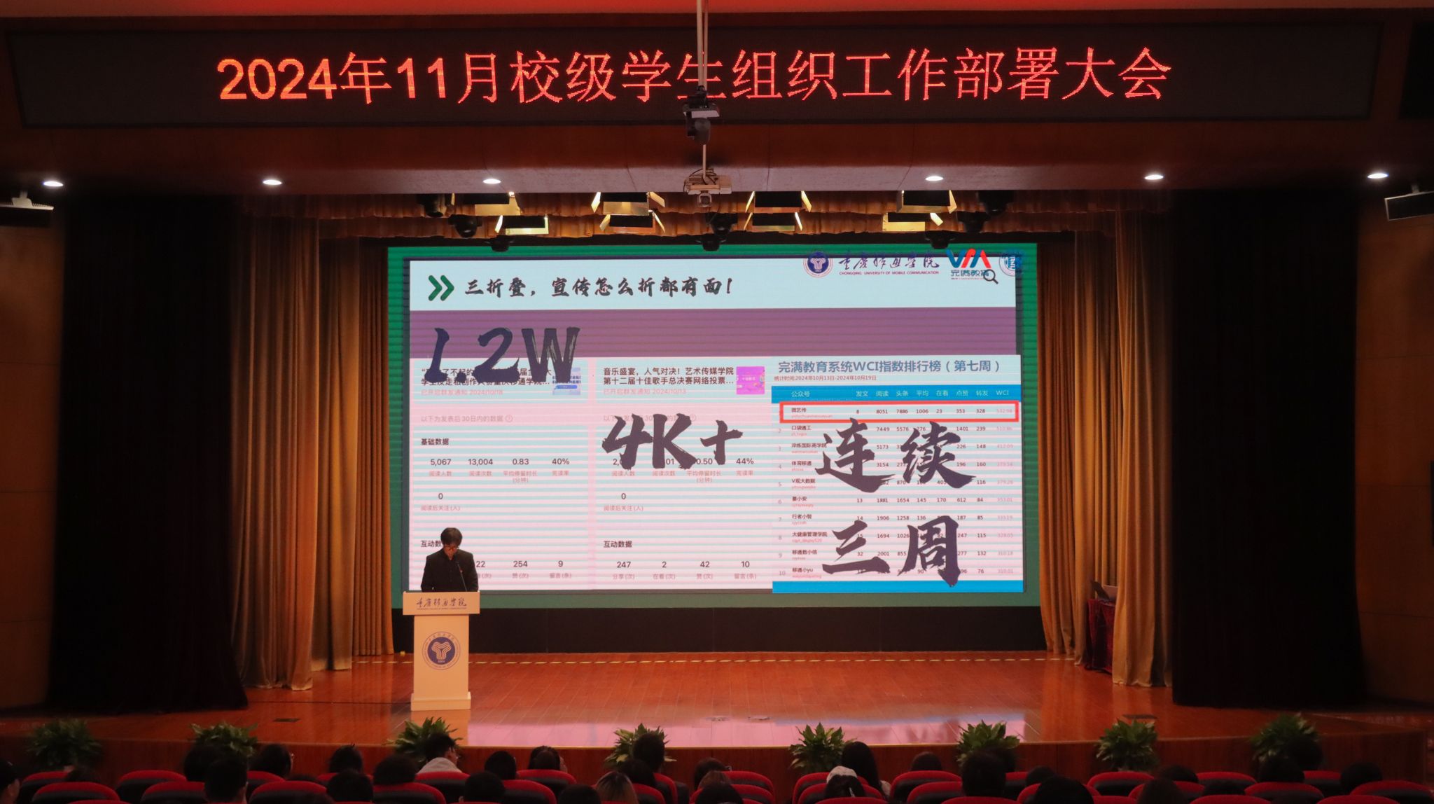 为紧扣学年工作指引,增强学生组织的凝聚力与创新力,提升完满教育发展活力。合川校区校团委于11月6日中午12:20,在下里巴人剧场举行《超越不止·奋进不息》——11月校级学生组织工作部署大会。校、院两级学生组织指导老师及学生代表共400余人出席参与。希望各学生组织干部以超越为目标,以奋进为动力,在各自的领域内发挥职能,不断追求卓越,突破自我,勇攀高峰。超越永无止境,奋进永不停歇!为完满教育奉献更优质的服务,打造更精彩的活动!