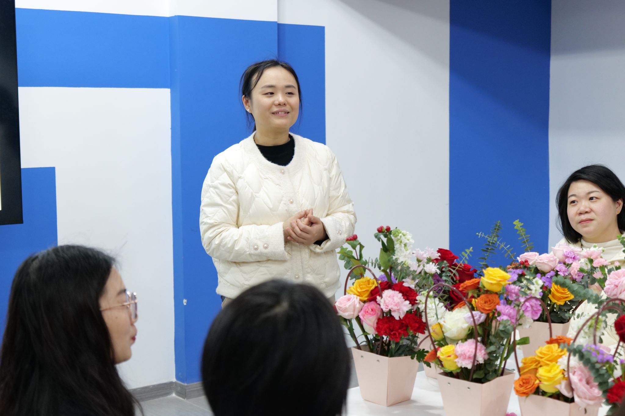 插花,赋予空间以生命与情感的艺术。在插花完成后,学员和老师们逐一上前领取花束共同投票选出一名“花王”,随后邀请“花王”获得者廖进老师向在场的学员和老师们介绍自己的创作灵感、花材选择以及设计构思,同时提到插花对心灵疗愈的益处。在分享环节中促进了彼此间的交流互动,提升情绪管理能力和心理健康水平。最终,刘薇唯副院长在总结发言中温馨指出:“插花艺术以其独有的魅力让人产生喜悦的感觉,希望大家能够如花一样度过缤纷绚烂的每一天。”随着她的话语落下,本次女生节插花活动圆满地画上了句号。