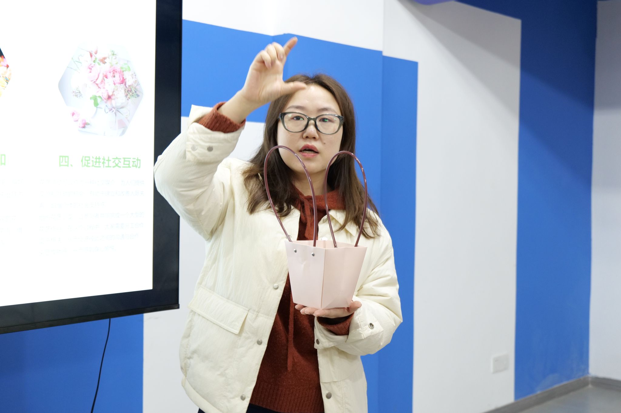 游戏结束后,心理健康中心兼职老师梁倩进行花艺疗愈小课堂并讲解插花的基本步骤,强调插花应注重色彩与形态的和谐搭配,并根据空间与环境调整作品风格。通过老师的指导,学员们不仅掌握了插花技巧,更学会了如何用心去感受花艺之美。