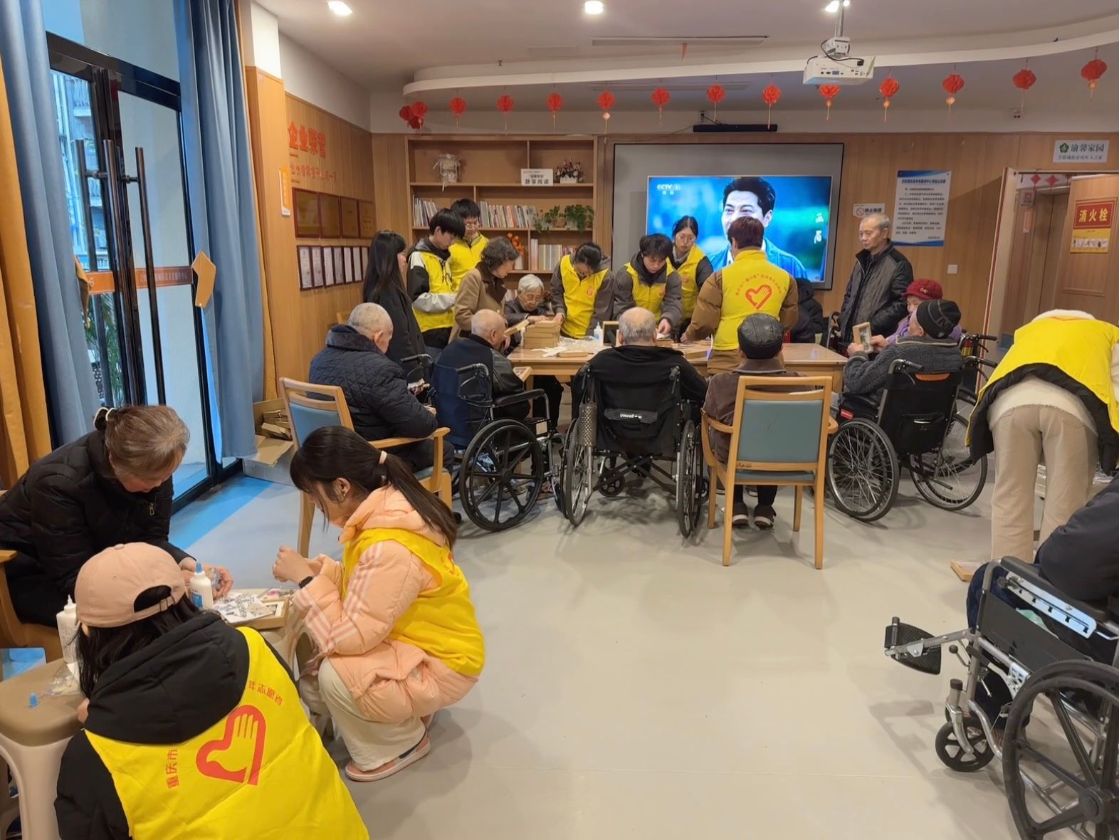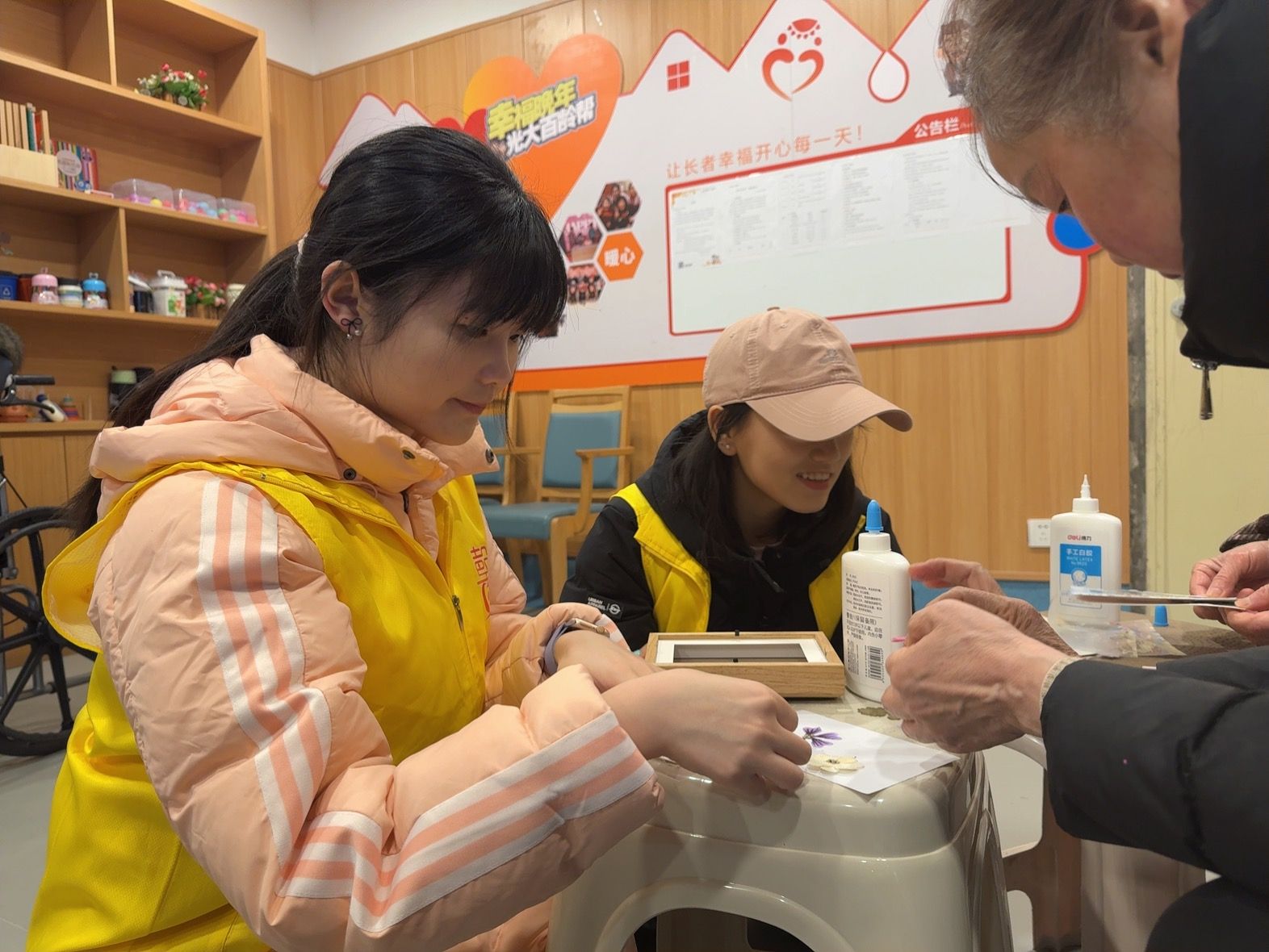 春风和煦,馨小青志愿服务支队携手校内招募的学生志愿者,共同踏上了一段充满爱心与温暖的旅程,开展了一场别开生面的压花制作活动,为养老中心的残障人士们带去了欢乐与陪伴。下午15时,一踏入服务站,志愿者们就受到了工作人员和残障人士们的热情欢迎。在简短的开场介绍后,支队长详细讲解了压花制作的活动流程和意义,强调了安全注意事项和尊重每一位参与者的重要性。志愿者们认真聆听,满怀期待地准备开始这次特殊的志愿服务之旅。活动室内,压花材料在纸板上铺展成斑斓色块。志愿者们化身“艺术助梦人”,她们半跪指导轮椅老人展开个性化创作。