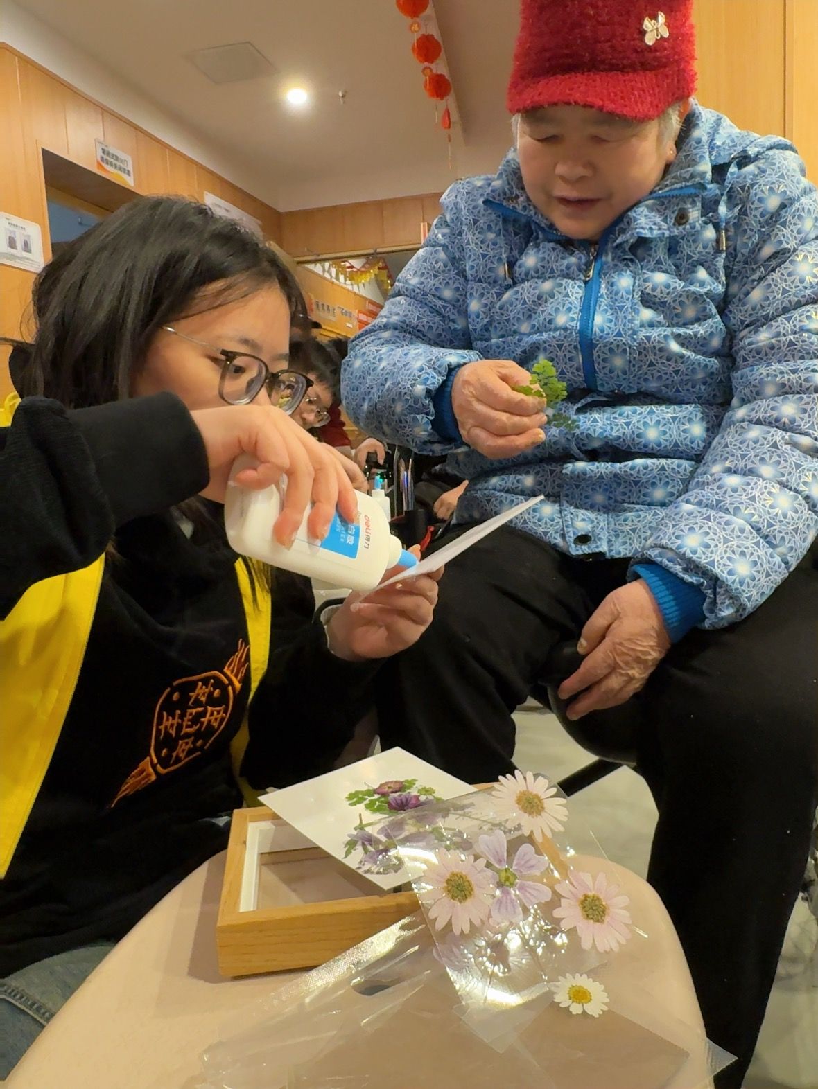 随着活动的正式开始,志愿者们一对一地与养老中心的残障人士结对子。他们耐心地指导着如何挑选花瓣、如何压制、如何搭配颜色,每一个步骤都充满了细心与关爱。残障人士在志愿者的帮助下,纷纷展现出了自己的创造力和想象力,一朵朵美丽的花朵在他们的手中被压制成了一幅幅独一无二的压花作品。活动现场充满了欢声笑语,氛围温馨而融洽。在制作过程中,志愿者们不仅传授了压花技巧,还倾听了残障朋友们的生活故事,分享了自己的成长经历。这种温馨氛围让彼此之间的距离拉得更近,也让志愿者们更加深刻地体会到了志愿服务的价值和意义。