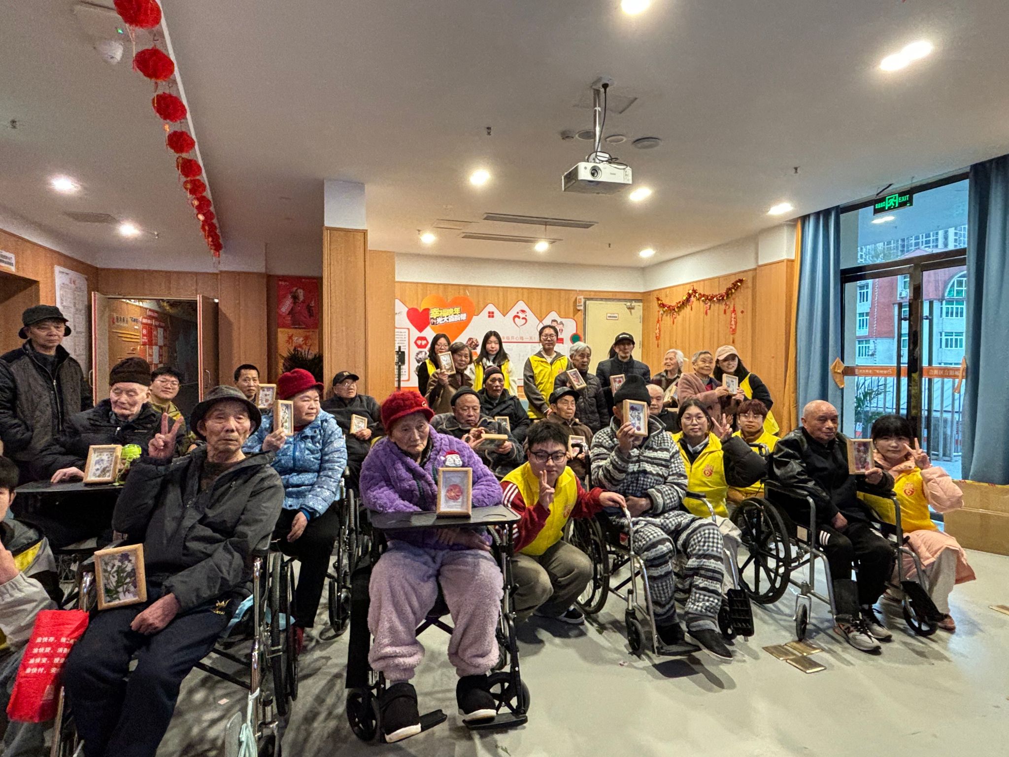 两个小时的创作中,30幅独具匠心的压花相框渐次绽放,志愿者握着他们的手指感受纹理走向,把干花夹进相框夹层,留下了这份珍贵的记忆。它们在残障人士手里投放细碎光影,皱纹里亦顿时绽开涟漪般的笑,恍若那些曾被岁月褶皱的生命,正透过艺术重新舒展绽放的纹理。最后,大家齐聚一堂,共同合影留念。镜头前,每一张笑脸都洋溢着幸福和满足,这份温暖和快乐将永远定格在这一刻。活动结束后,支队长代表“馨小青”助残青年志愿服务专项支队向养老服务中心的工作人员和残障老人们表示了衷心的感谢。