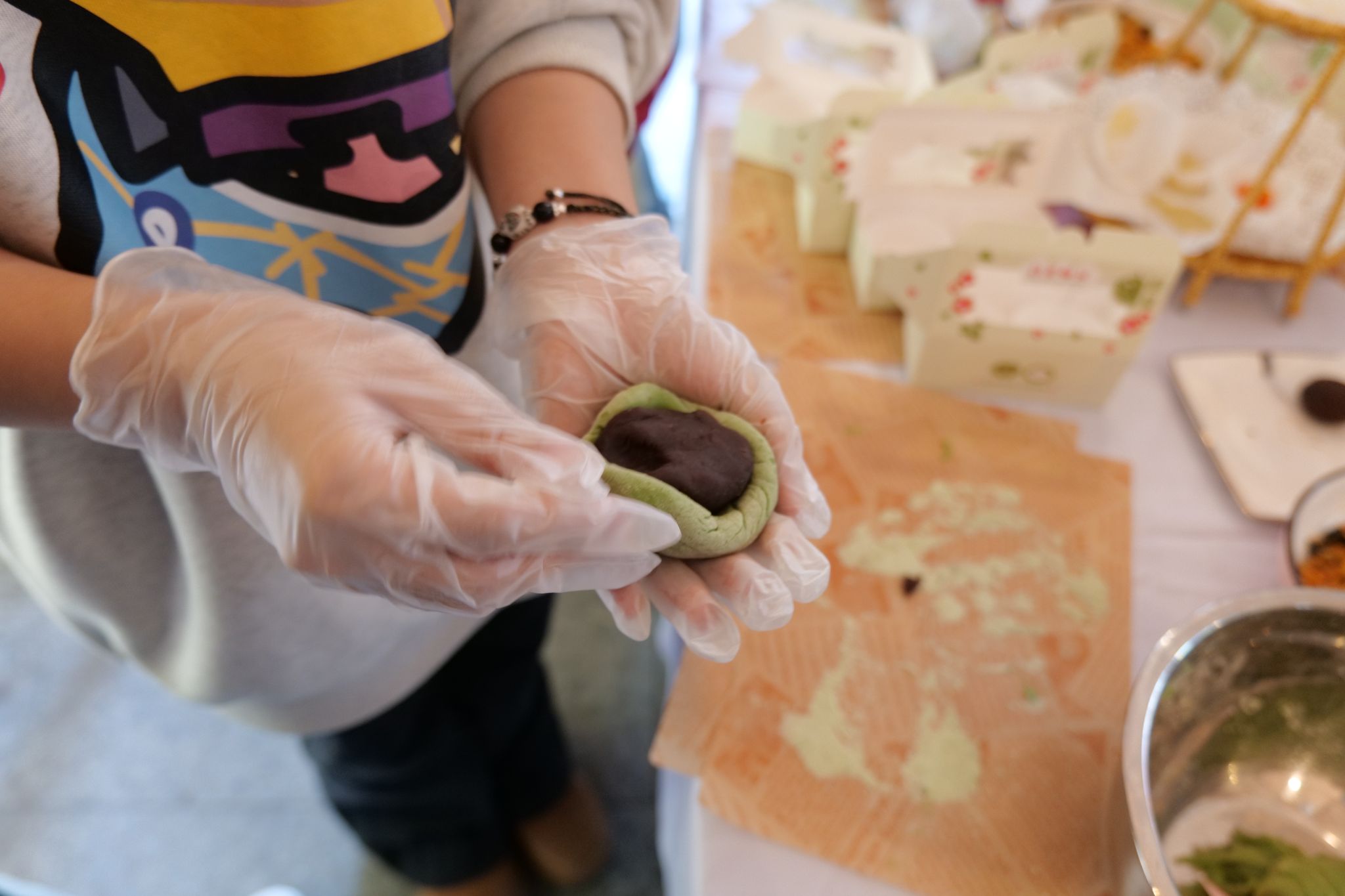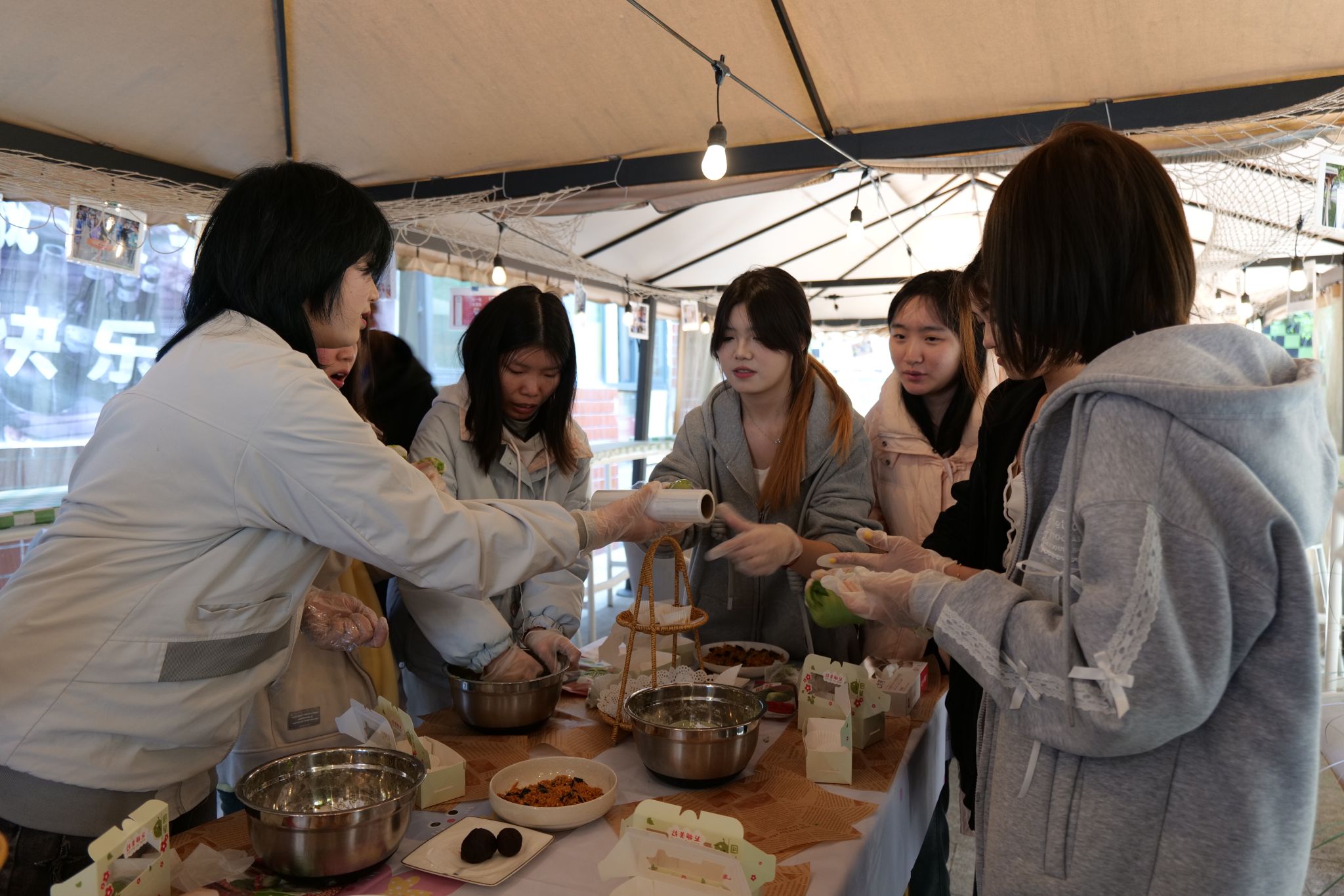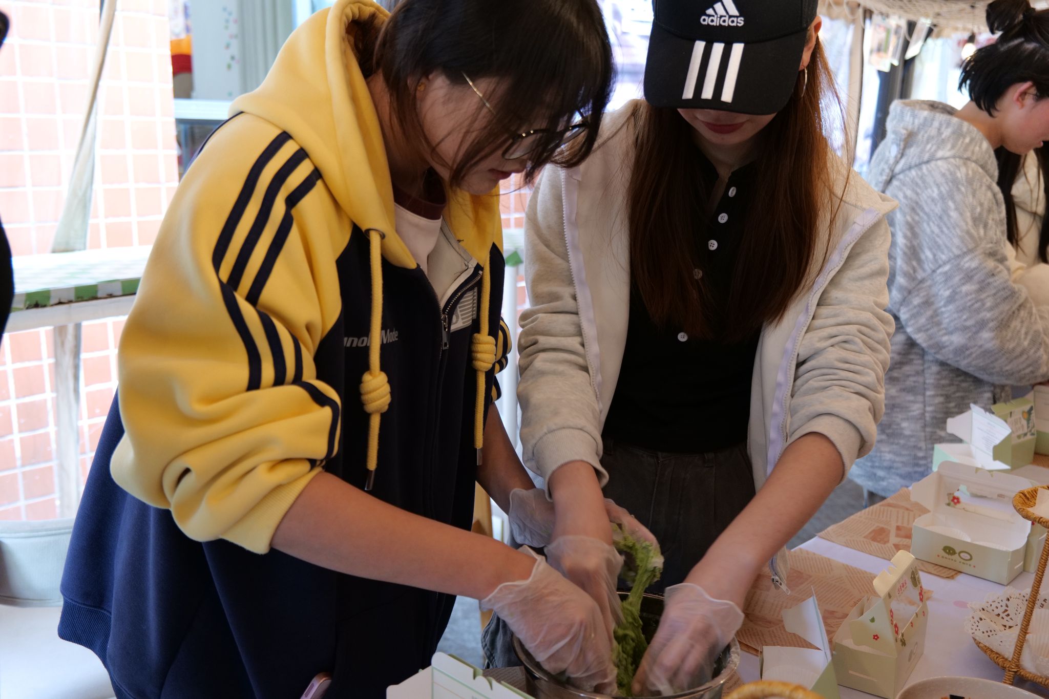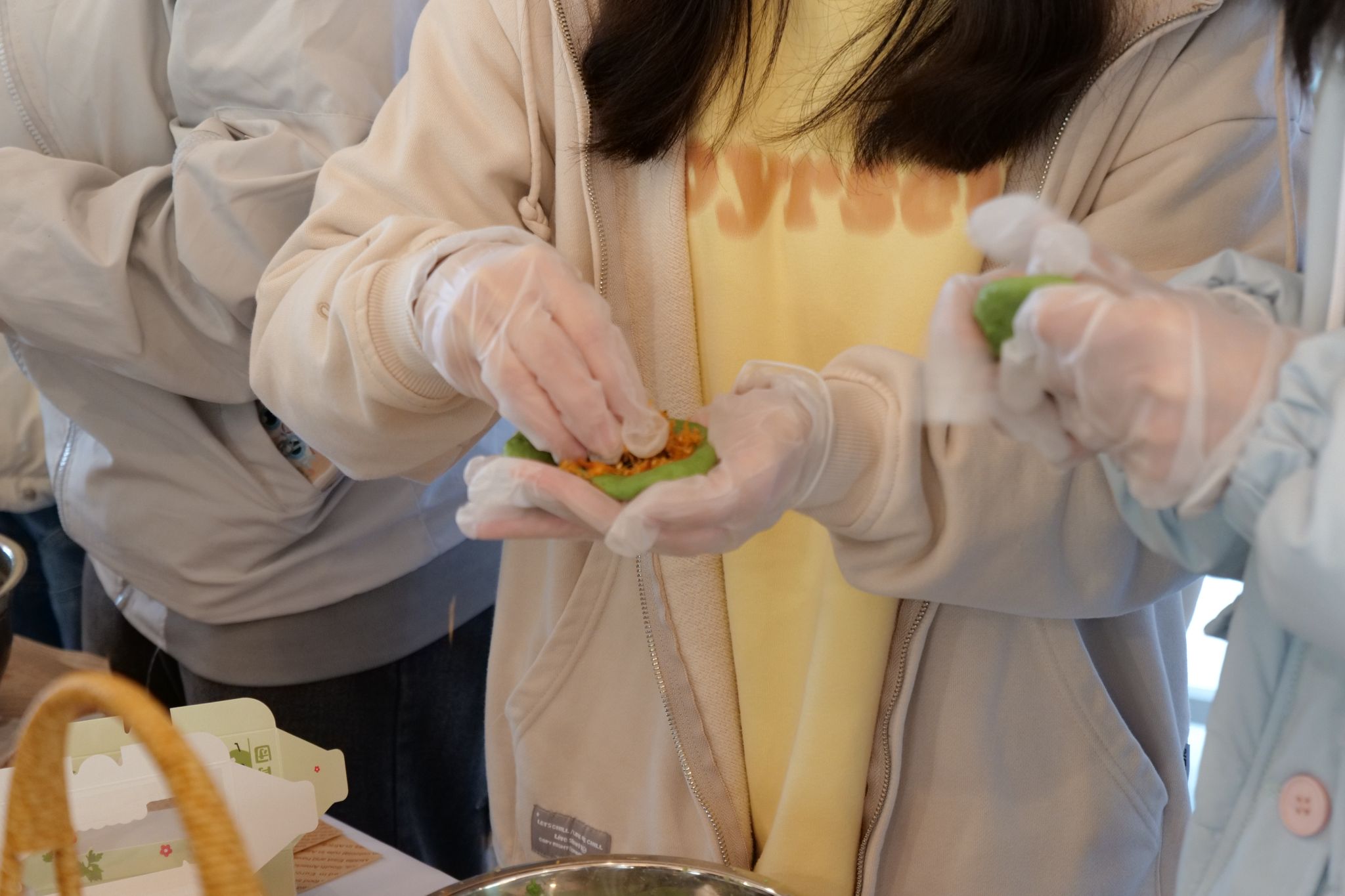 桌上早已摆放好新鲜肉松、糯米粉、红豆沙等原料,学员们在指导下开启了制作之旅。学员间自发结成互助小组,共同感受着面团在掌心流转出的江南春雨般的韵律。揉面环节最考验手上功夫,不少学员第一次接触艾草面团,或加水过多导致粘手,或揉搓不够影响口感。成功掌握技巧的学员积极分享揉搓面团的小窍门,经过大家的不断尝试,许多学员揉面动作逐渐娴熟起来,早已成功的学员也积极帮助其他手法略微生疏的学员揉面。揉进青团的不仅是春日馈赠,更是对传统的温柔叩问,那些关于生命轮回的密码,早已在指尖相触的温度里悄然复苏。