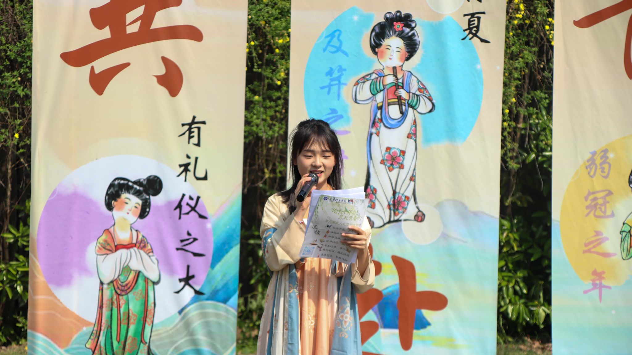 春日暖阳倾洒,广场仿若一幅古韵画卷。身着汉服的学子们衣袂飘飘,尽显风华。活动伊始,主持人何程燕以激昂的语调介绍成人礼的深厚渊源,强调其传承传统文化的重要意义,让在场师生对接下来的仪式充满期待。随后,华韵汉服协会的指导老师李凤勤登台致辞。李老师的话语情真意切,为这场活动奠定了庄重而又温馨的基调。