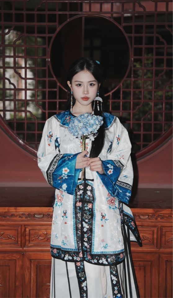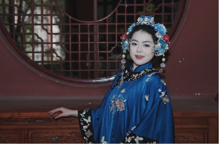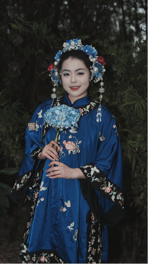 走秀结束后,颁奖环节紧张而激动人心。评委们依据服装造型、走秀表现、对新国潮主题的诠释等多个维度进行严格评审。最终,4号选手卢冉凭借出色发挥荣获本次大赛一等奖。她身着晚清时期的清汉女装,服装上绣制的花卉、蝴蝶等图案精美绝伦,色彩搭配和谐且富有层次感。造型方面,其头戴以蓝色花朵为主,搭配红色花朵、珍珠、宝石等的华丽头饰,整体风格古典优雅、端庄秀丽,完美诠释了中式传统美学韵味。