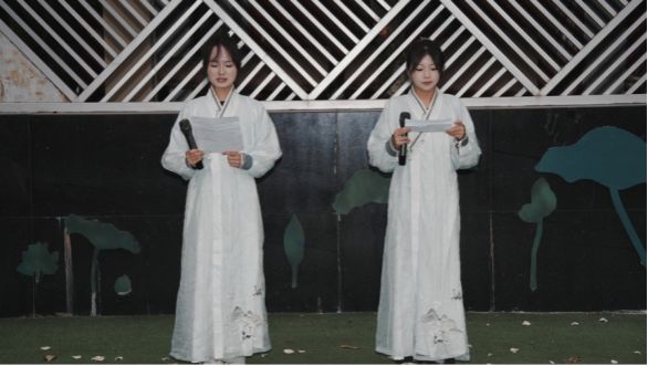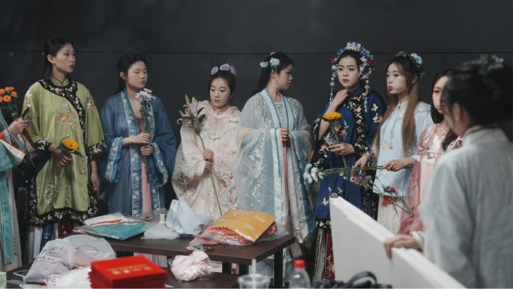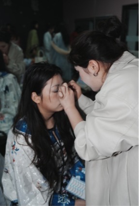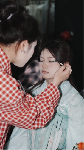 活动开始前,现场呈现出一片忙碌而有序的景象。由学生组成的造型师团队提前就位,以新国潮元素为灵感,将传统东方色彩与现代美妆技法巧妙融合,精心为模特打造妆容。李聪老师也鼓励选手对传统发髻造型进行创新改良,通过点缀古风发簪或娇艳鲜花,让每一个发型细节都尽显传统文化与现代时尚的融合魅力。