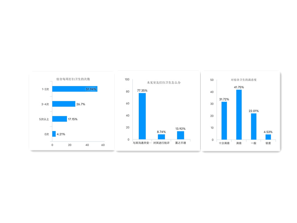 对在一些关键性问题如“宿舍每周打扫卫生的次数”、“未见室友打扫卫生怎么办”以及“对自己宿舍卫生的满意度”等调查发现,我校学生宿舍卫生情况大部分较好,83%的同学对现有宿舍的满意度达到满意及以上,大多数宿舍每周都能维持至少1-2次卫生打扫频率,大部分同学会选择提醒随意摆放物品或不及时清洗衣物的同学做好自我卫生。当然,此次调查也发现了一些问题,如仍有小部分宿舍的卫生情况令人堪忧,部分同学在寝室卫生状态较差时会碍于同学的情面选择默不作声而放任这种不利于宿舍干净整洁的情况的存在等。