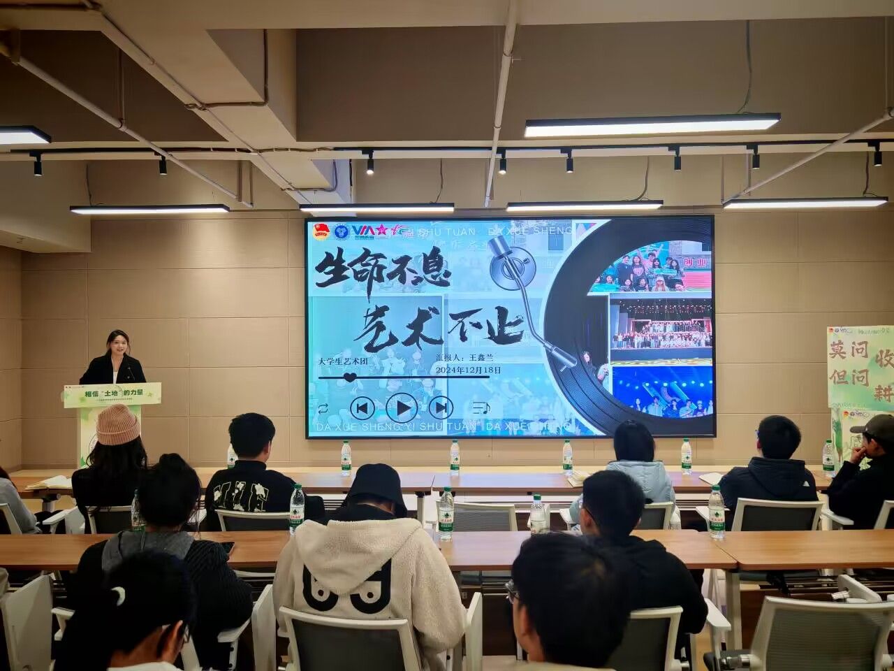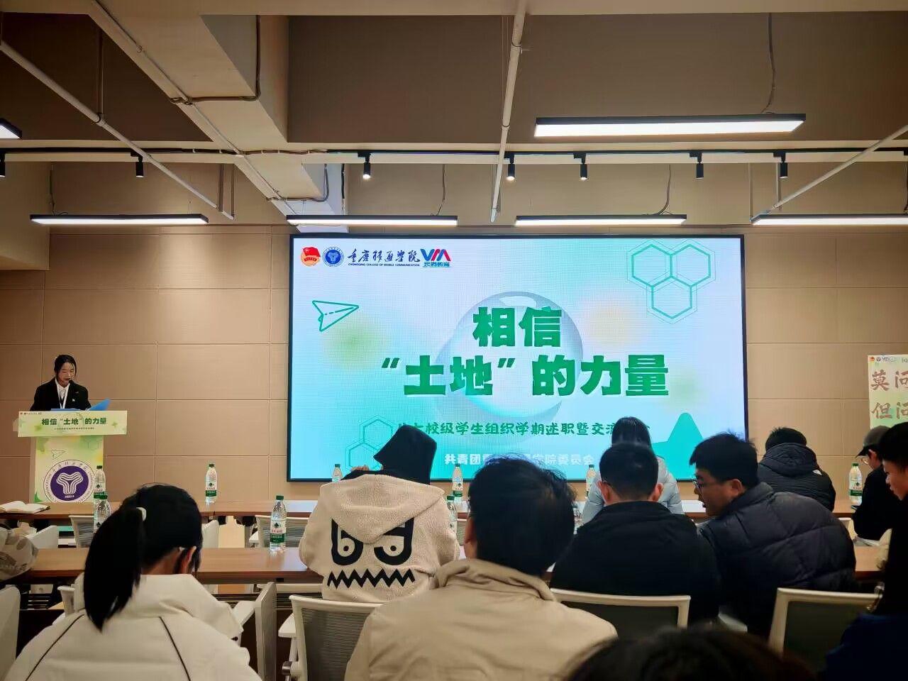 活动伊始,由八大校级学生组织主席团成员通过述职报告回顾总结工作,既是对本学期校级学生组织努力的总结,也是对自身不足的反思,明确今后的目标与规划。会议现场,嘉宾席坐满了来自各校级学生组织指导老师,经过一个半小时的精彩展示,各组织呈现了他们最完满的风貌。在这片土地上,我们始终团结一心,共同面对挑战,携手并进,成功克服了重重困难,让每一个目标都得以扎根、茁壮成长!