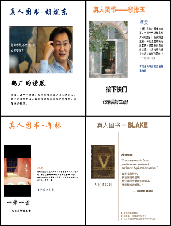 紧接着,“移通版真人图书馆”活动正式开始。王可欣老师首先对“真人图书馆”来源做了介绍。真人图书馆是一种阅读理念,该理念源于丹麦哥本哈根。读者“借”一个活生生的人,与其交谈,读人这本书,从而获得更多的知识。接下来,王可欣老师向大家展示了本次的4本“真人图书”,分别是《李伦玉:按下快门,记录美好生活》、《冉林:一荤一素,无法忘却的美食》、《杨娅玮:BLACK:VERGIL》、《胡煜东:鹅厂的诱惑》。每位“真人图书”都先行精心制作了关于“自己这本书”的封面,并在活动现场向大家进行了展示。参会的同学根据书名描述和书的目录,各自选择自己感兴趣的真人图书,自由“借阅”,与其进行交流。