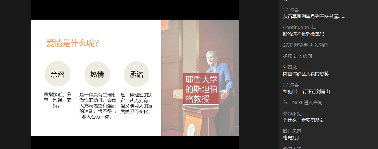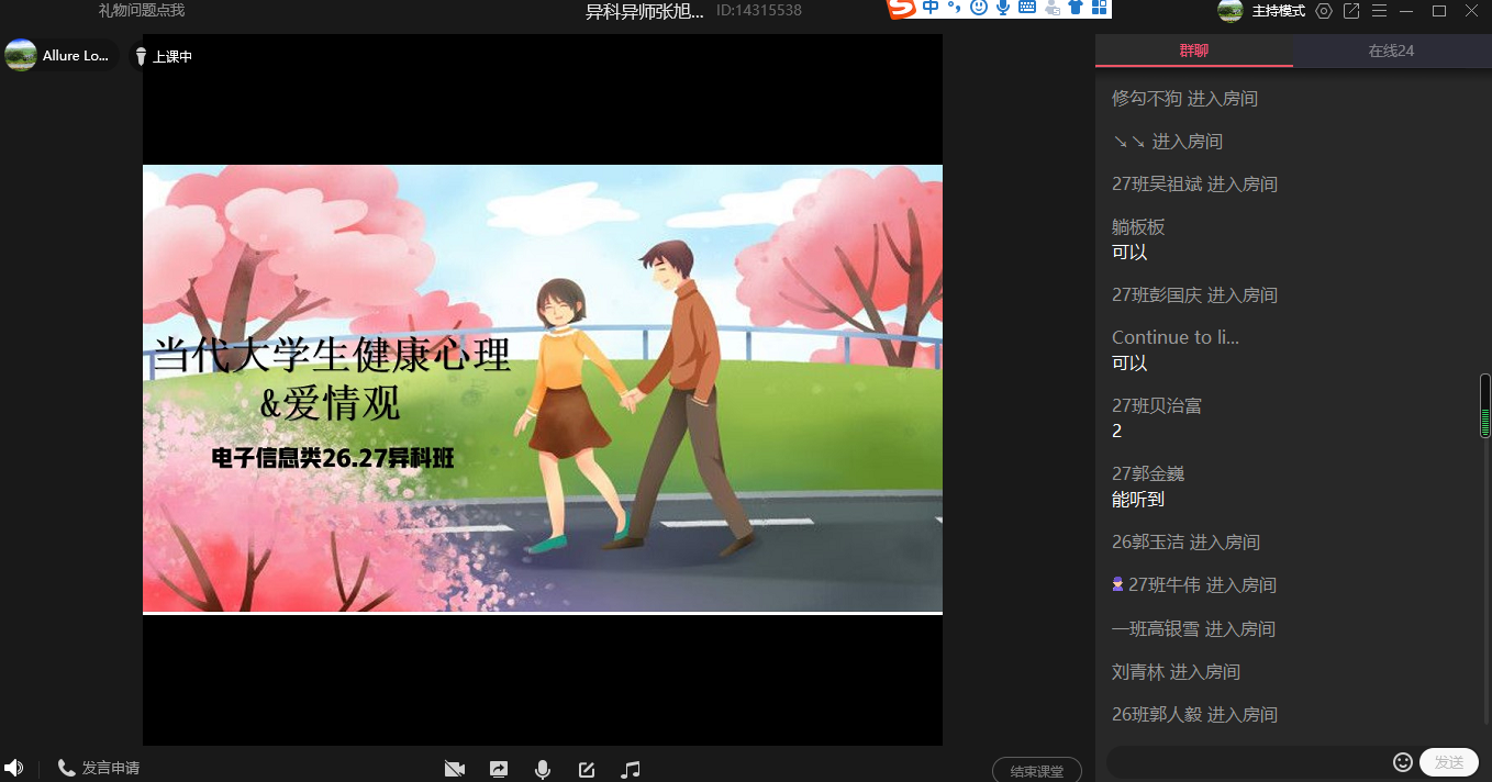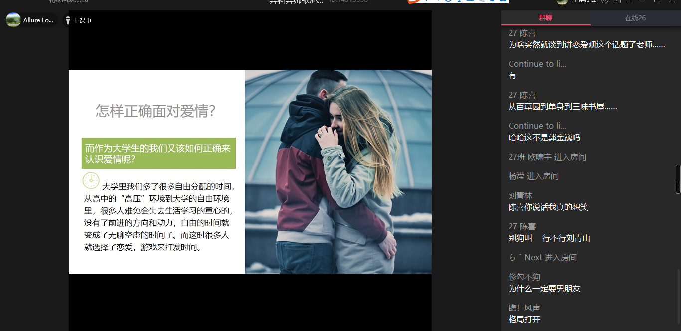 为帮助学生建立、发展健康的恋爱关系,及时有效关注学生内心需求,引导大学生树立正确的恋爱观,助力大学生健康成长。5月26日下午,合川校区学生处张旭老师为电子信息类26、27异科班学生开展线上“当代大学生健康心理&爱情观&大咖阅读”分享会。