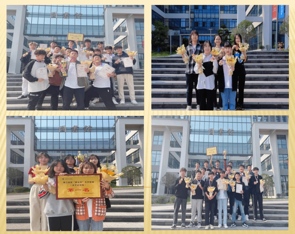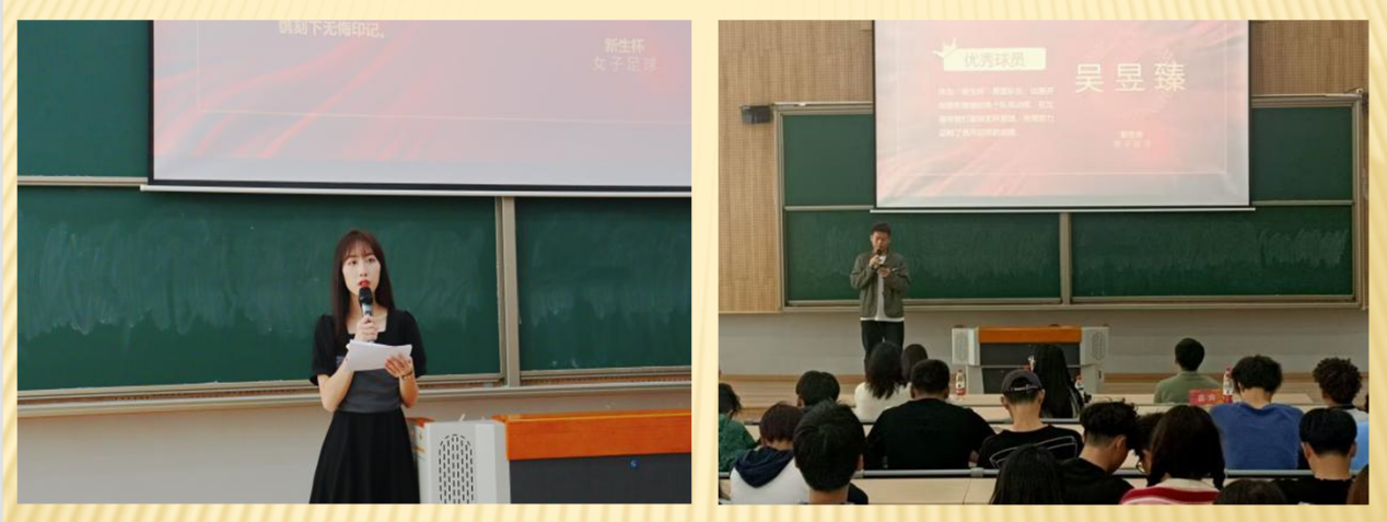 在热烈的掌声中,迎来了“新生杯”的冠军队伍——它们分别是由温雅晴、王娟、刘秋月、余艳玲、张小丫组成的“新生杯”联赛女子足球队和由李峰、蔡金廷、何懂鑫、吴昊、罗文强、蹇小东、李会鹏、姜杰、江燚、陈健、王阳、吴昱臻、耿昌杰组成的“新生杯”联赛男子篮球队。王国树副院长和周俊老师为他们颁奖,并对获奖队员表达了充分的肯定和真诚的祝福。