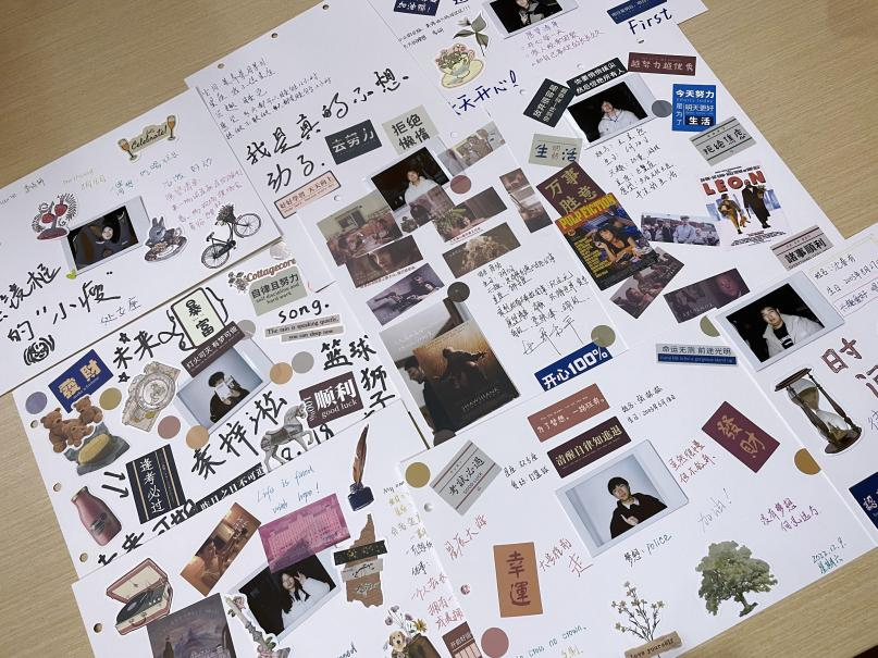 随后谭老师要求同学们将自己照片贴在卡纸上,利用材料发挥自己的创造力和艺术的审美能力,制作一本精美的专属同学录。同学们非常沉浸地投入到对同学录的制作当中,即使是男生也对自己的同学录进行了精心的设计,用各种贴画和字体的装饰将一张白纸变成了一份彰显着个人特色的同学录。同学们在同学录里写上了自己的小秘密,写上了自己想对老师说的话,也写上了自己的未来愿望。这本同学录上还有很多的空白,但是在下学期谭老师将会带领着35位异科班的同学把它填满,也会在之后的时间里制作更多的同学录,让它成为本异科班的专属记忆。