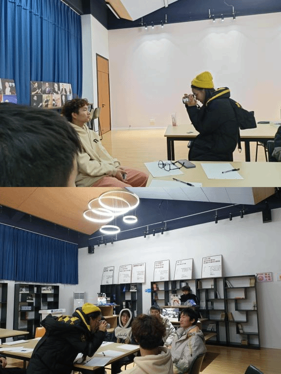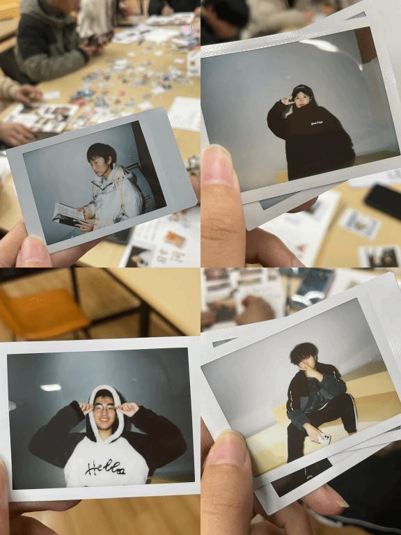 在大咖阅读活动之后,谭老师拿出来了自己准备的拍立得、白色卡纸、彩笔、贴画等同学录 的制作材料。谭老师首先用拍立得给每一位同学拍了照片,起初要求同学们拍照的时候,大家都表现得很拘谨和羞涩,但是在谭老师的带领下同学们都慢慢地放开了自己,开始找各种的道具来排pose,留下来非常多有趣的照片,师生的情谊也在轻松愉快的氛围下建立了起来。