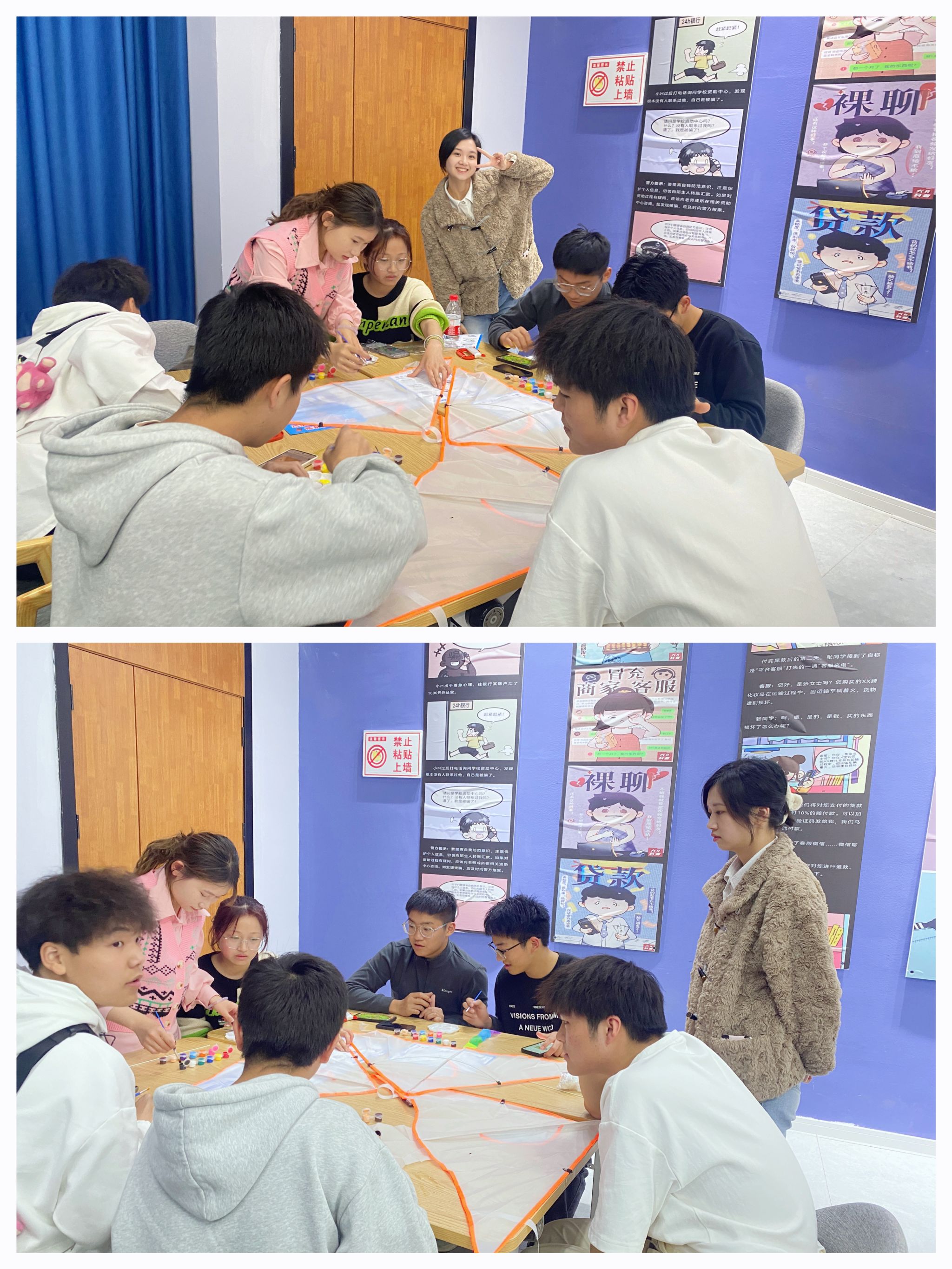 风筝是由古代汉族劳动人民发明于中国东周春秋时期,至今已2000多年。相传墨翟以木头制成木鸟,研制三年而成,是人类最早的风筝起源。因此,在本次活动开始之前,通信与信息工程学院2022级电子信息志向1班异科导师刘雪影由风筝文化讲解引出本次活动。在经历我们的风筝趣味文化抢答题之后完成分组。希望可以借此打破同学与同学,同学和老师、参与者和课程的隔阂。将风筝情境进行导入,将团队分为若干个小组。团队配置一名“风筝顾问”,发放画笔材料及任务书及注意事项等说明。