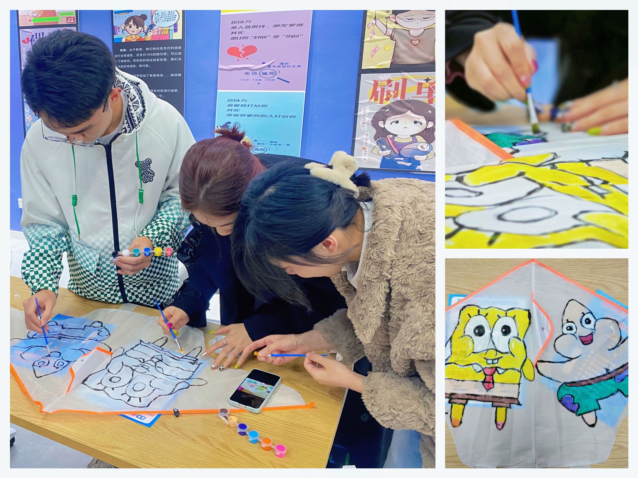 我们给每个小组都安排了一个情节,希望大家在理解情节的基础上来对风筝进行绘画创作。任务解读完成后,大家对于本次创作已经初具构思了。小小画笔在风筝上尽情地舞动,同学们充分发挥自己的想象,认真描绘着自己的梦想,涂上绚烂的色彩,把春天的鲜活跃然筝上。