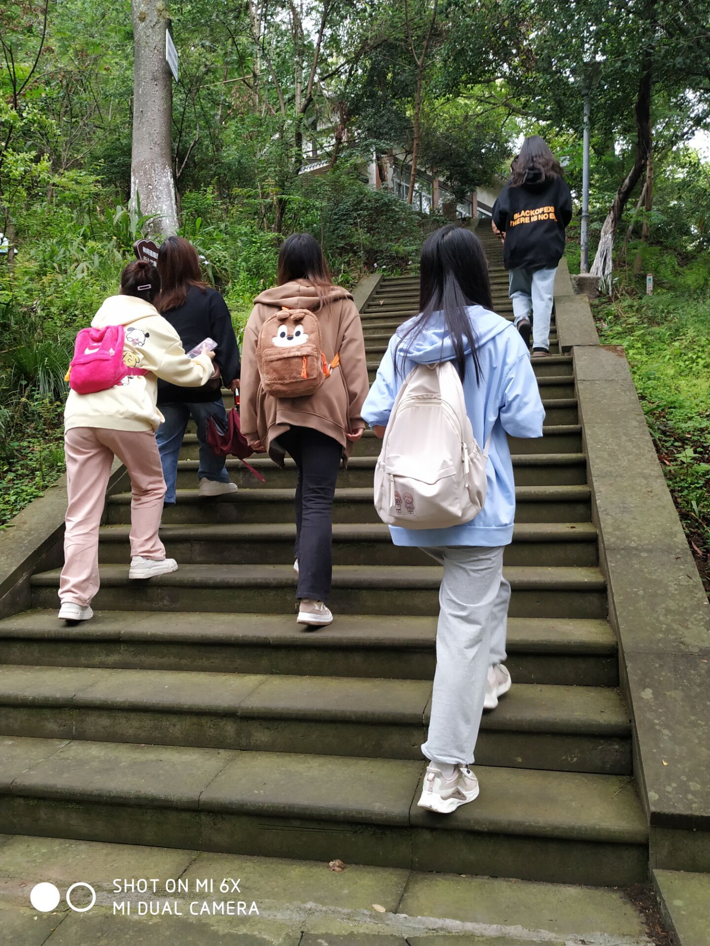 沿着长长的小路,走在长满青苔的台阶上,吹着微微的凉风,听着树林里时不时传来的鸟鸣。我们来到了山上的一个美丽的亭子,在亭中我们坐下听着鸟儿此起彼伏的歌声,享受着风儿轻轻地抚摸脸庞。