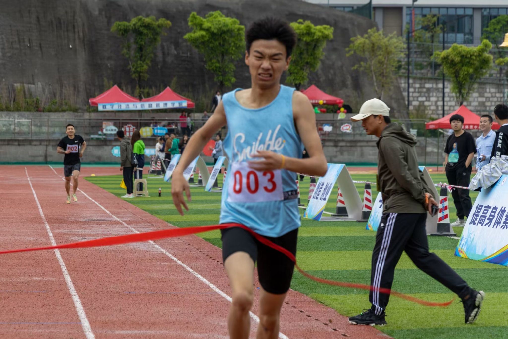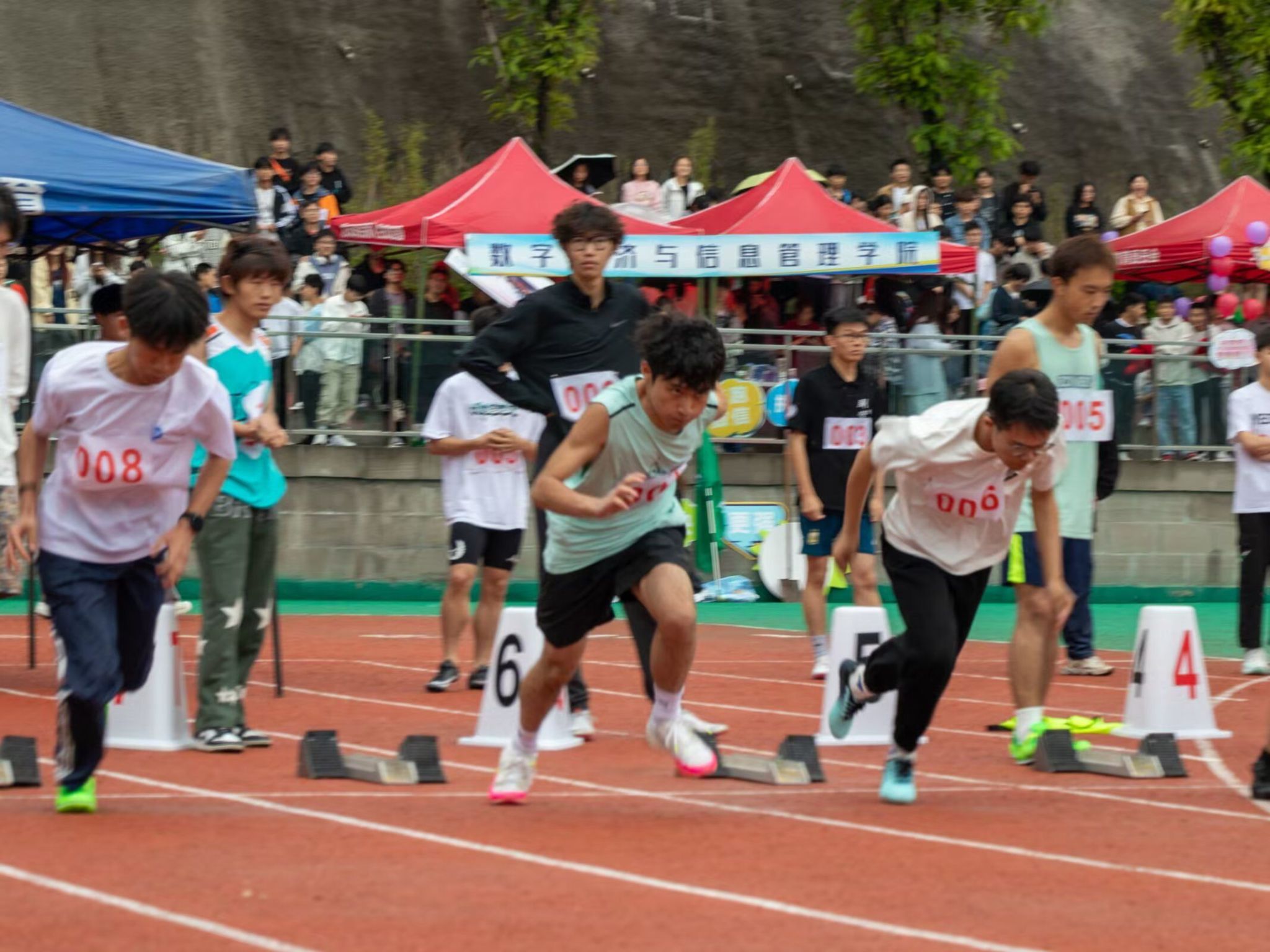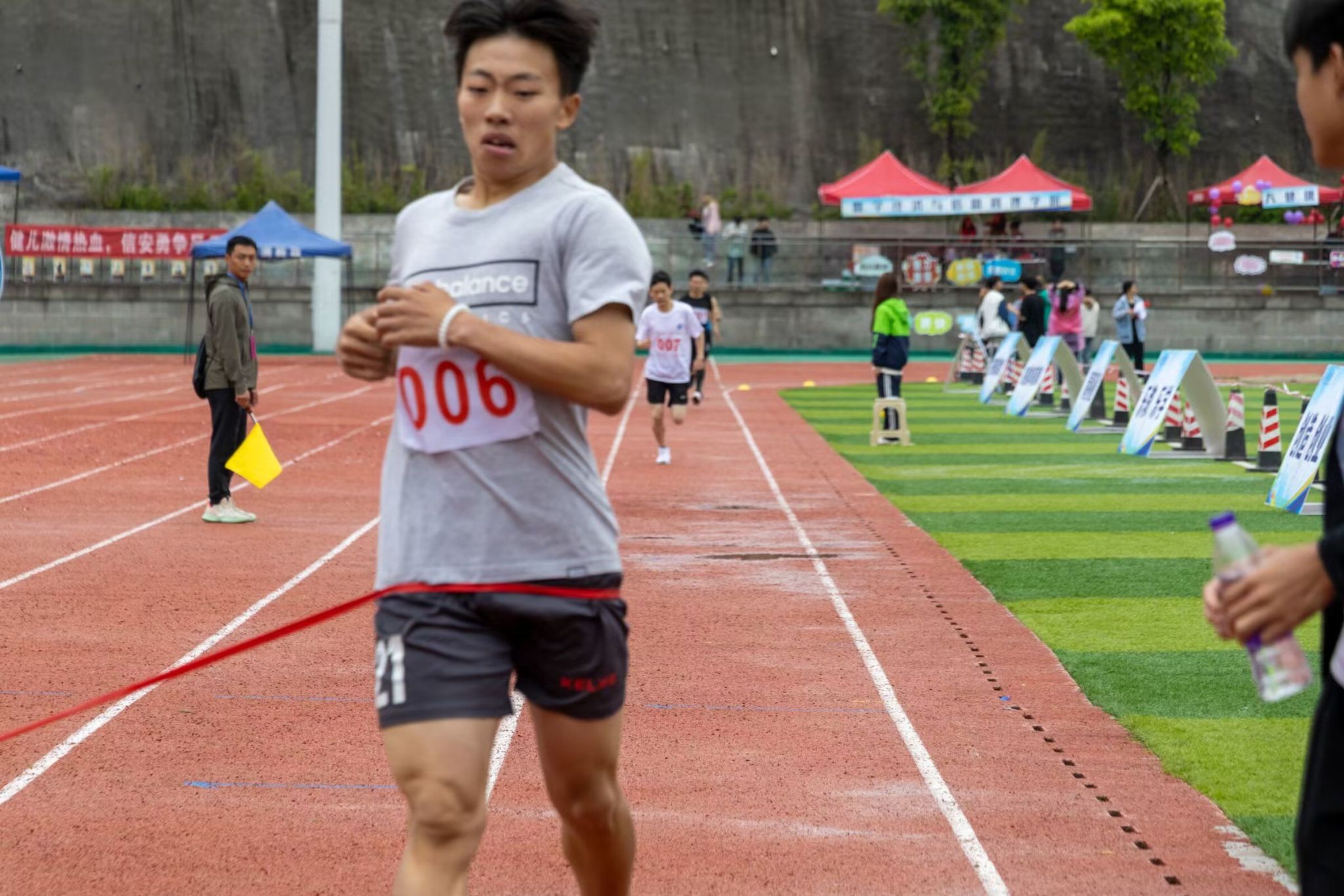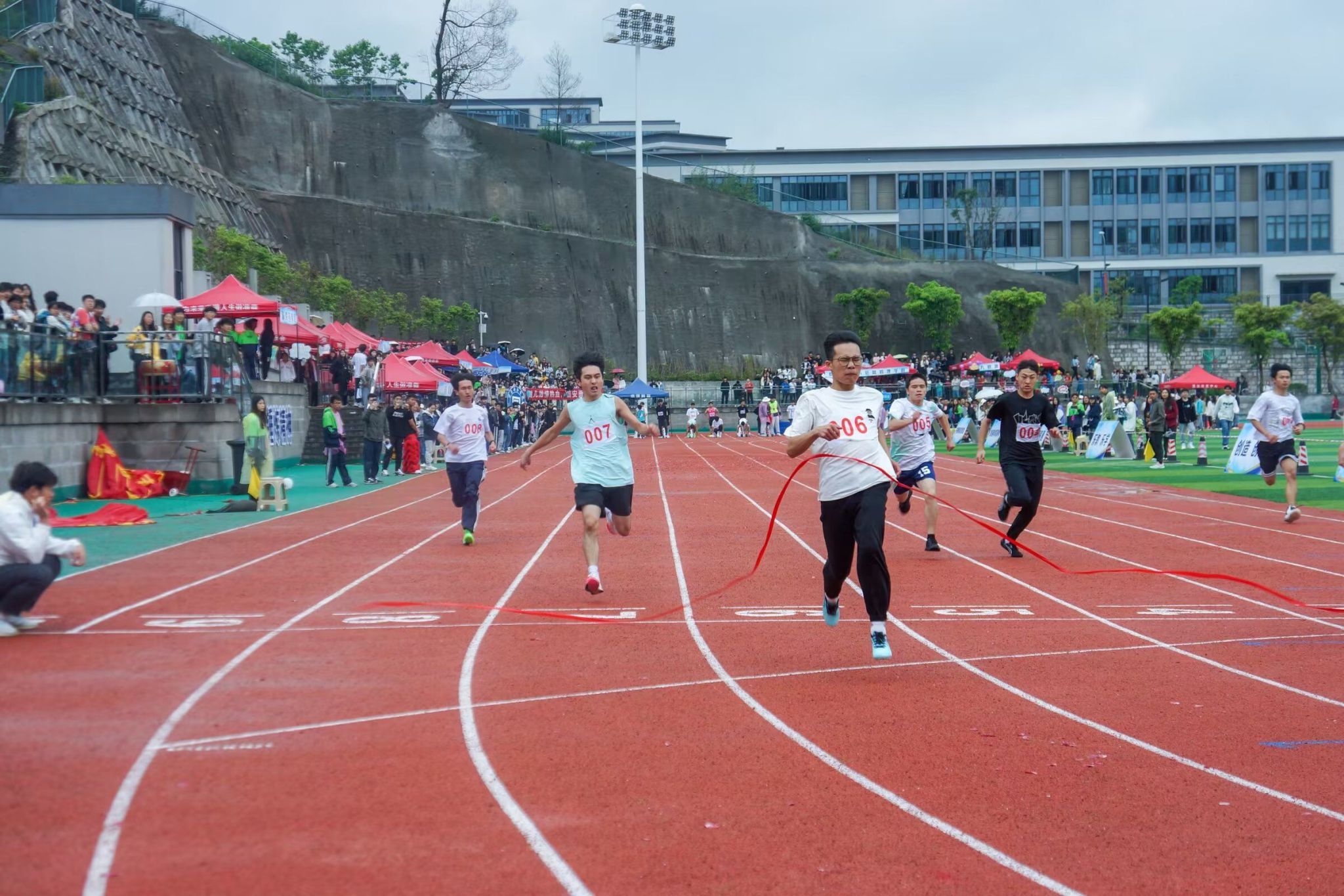 在微微湿润的跑道上,尽情挥洒着你们的汗水,台上的呐喊是对你们拼搏的肯定,奔跑是耐力与意志的检验,超载自我,而挑战自我是你们的目标,当从他人身边倏忽而过时,将赢得同学们的欢呼。