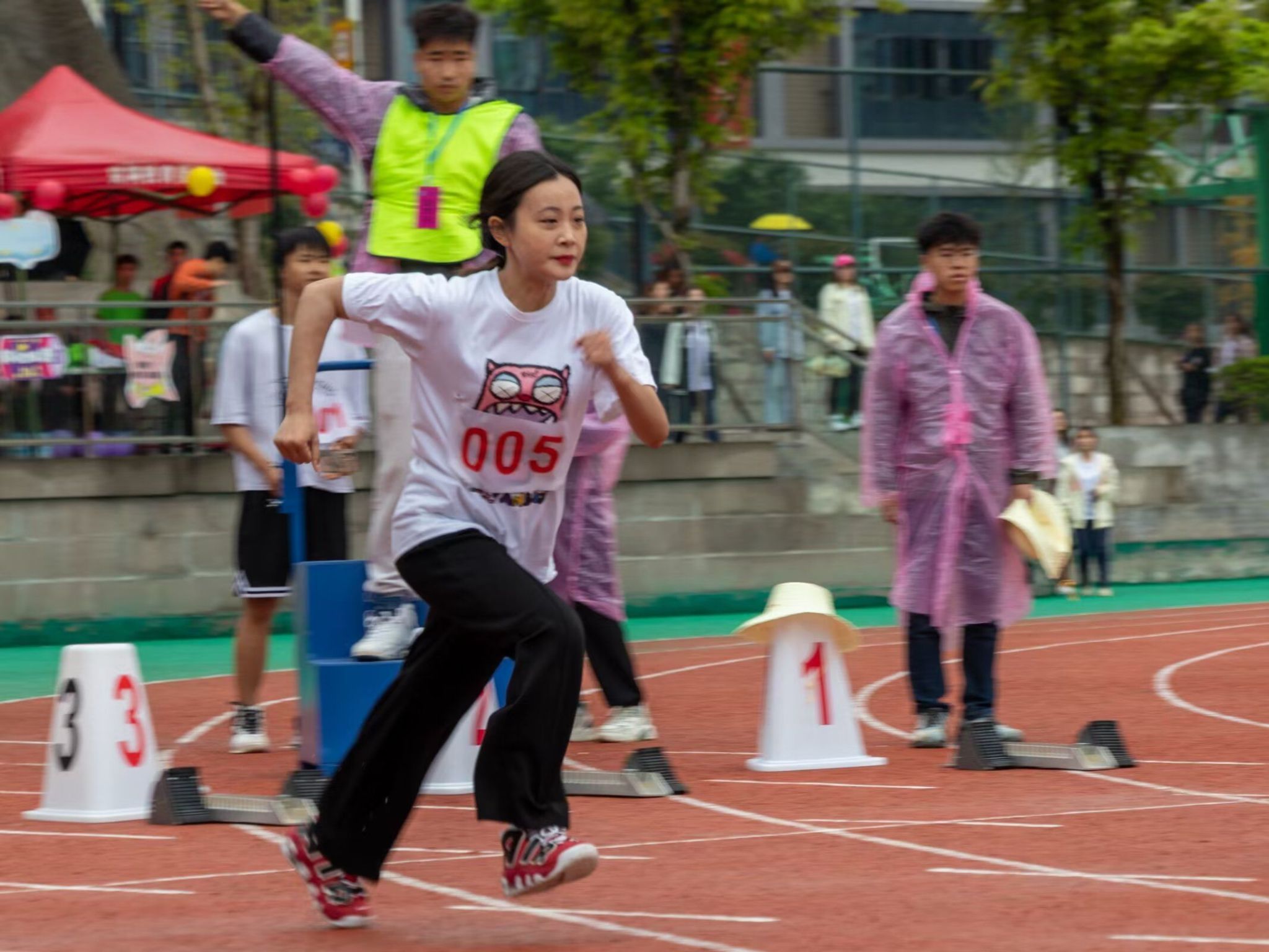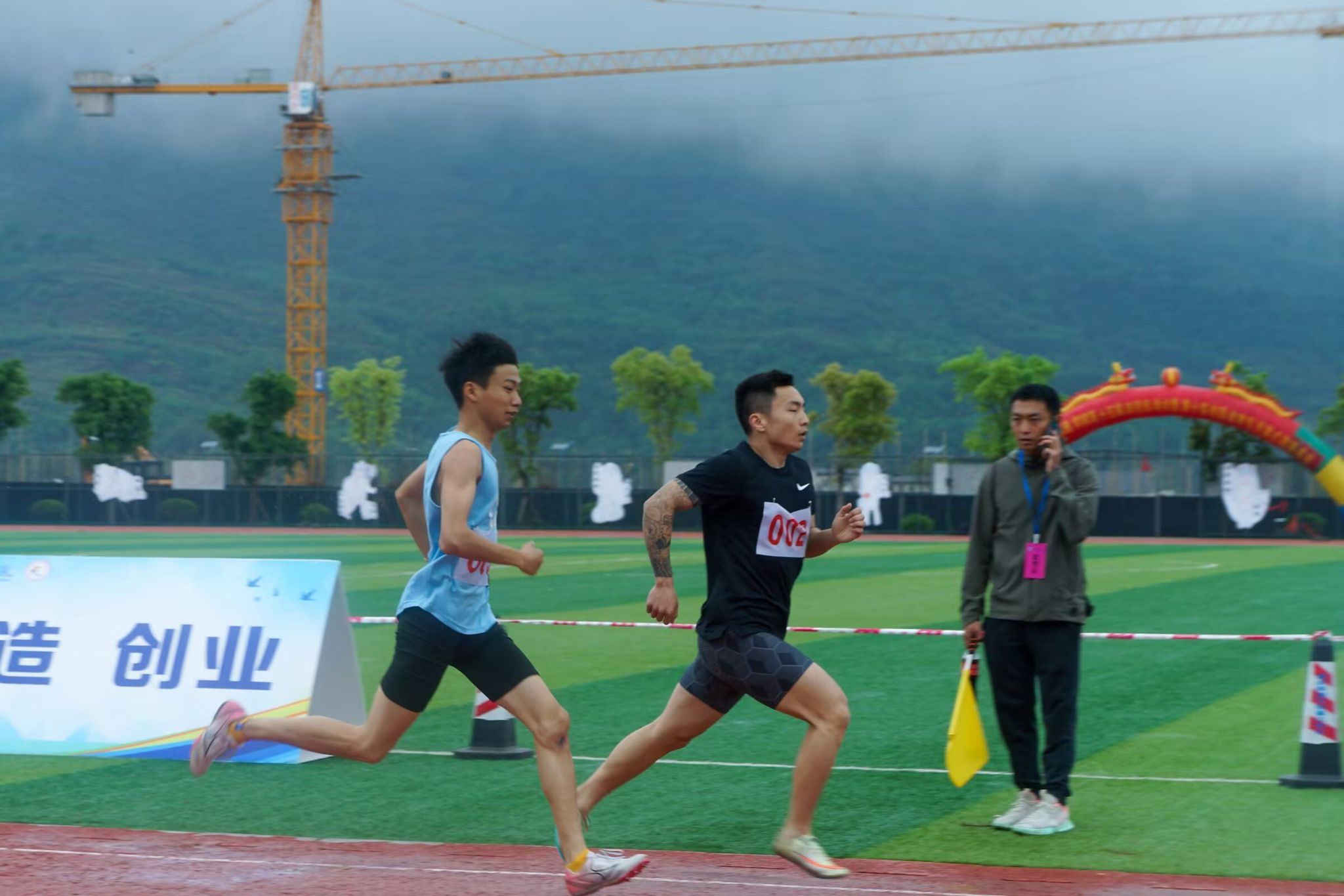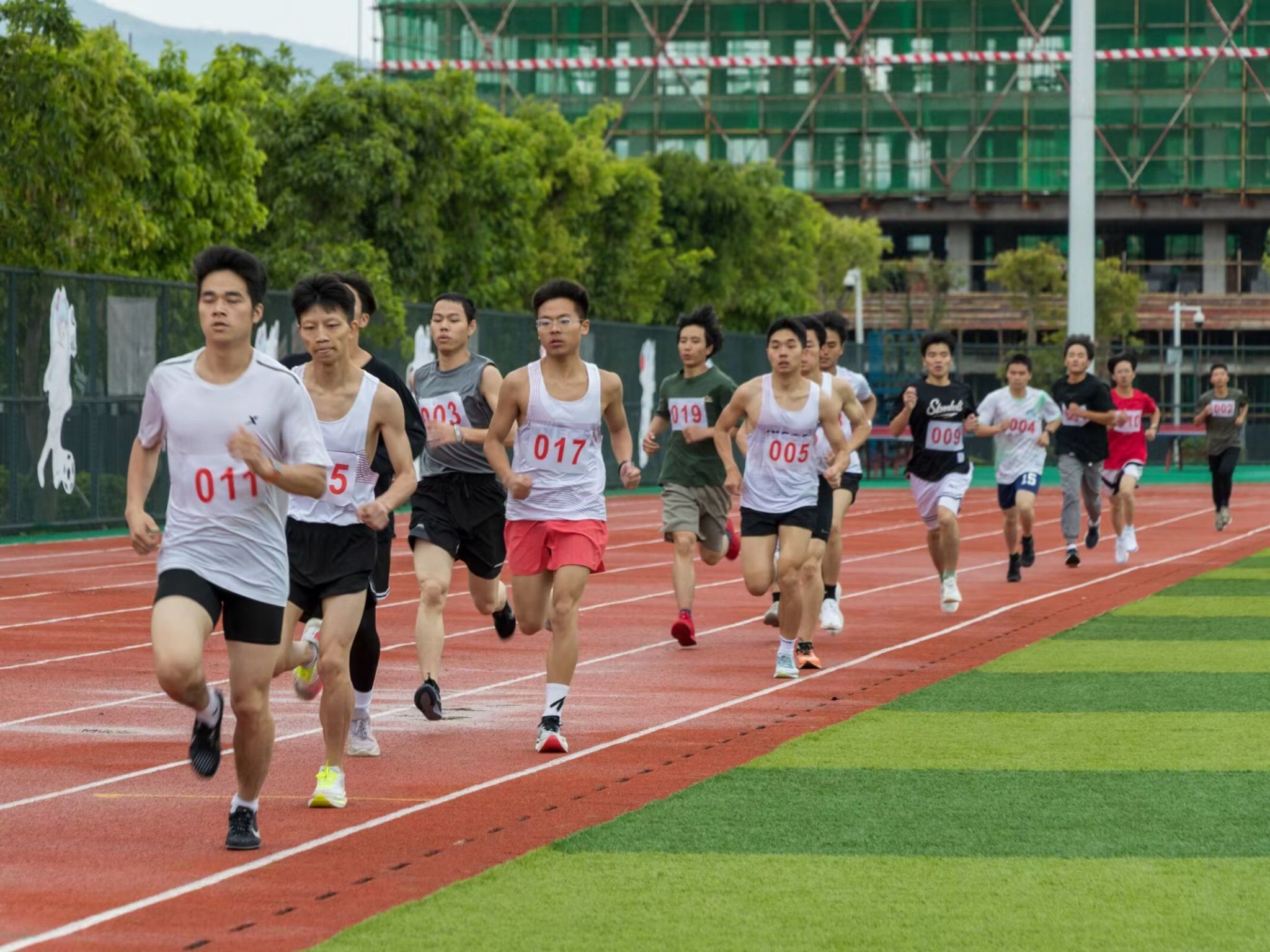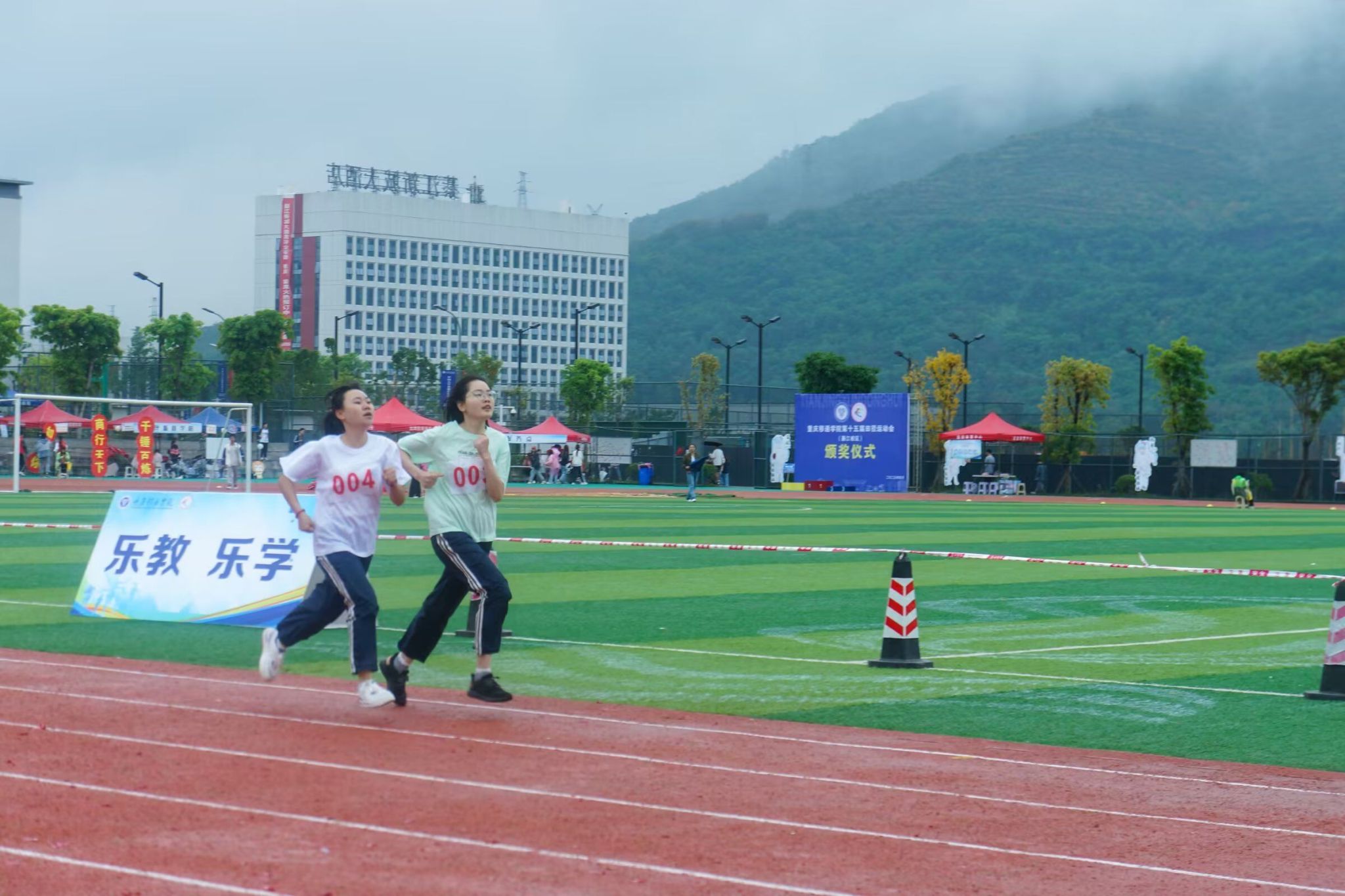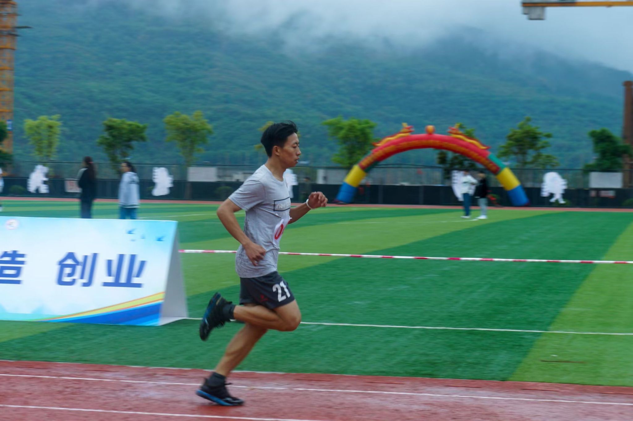 在微微湿润的跑道上,尽情挥洒着你们的汗水,台上的呐喊是对你们拼搏的肯定,奔跑是耐力与意志的检验,超载自我,而挑战自我是你们的目标,当从他人身边倏忽而过时,将赢得同学们的欢呼。