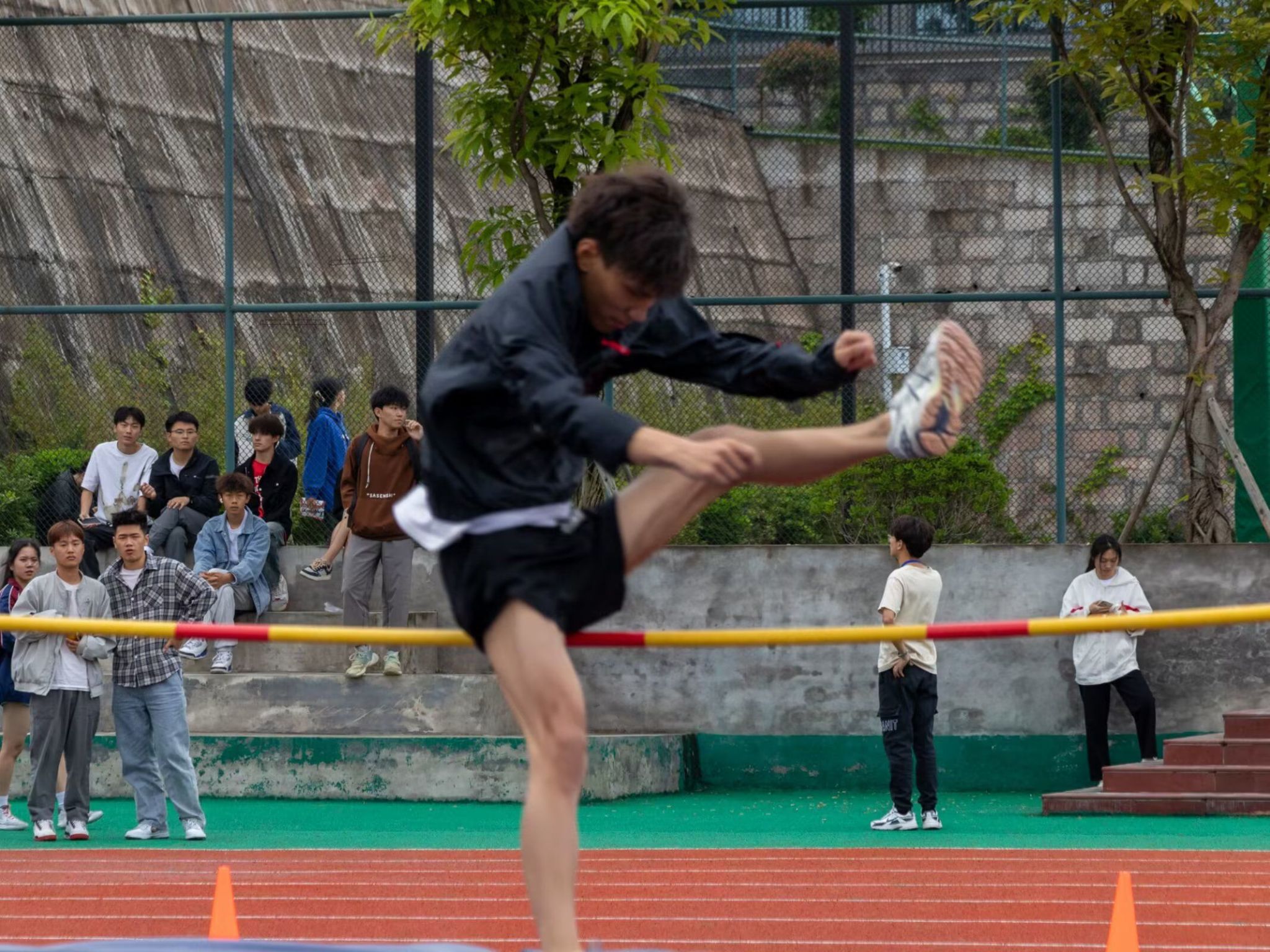 身体一跃,在空中划出一道完美的弧线,迅速沉身,收脚过。这每一次跳,都是挑战,是超越。