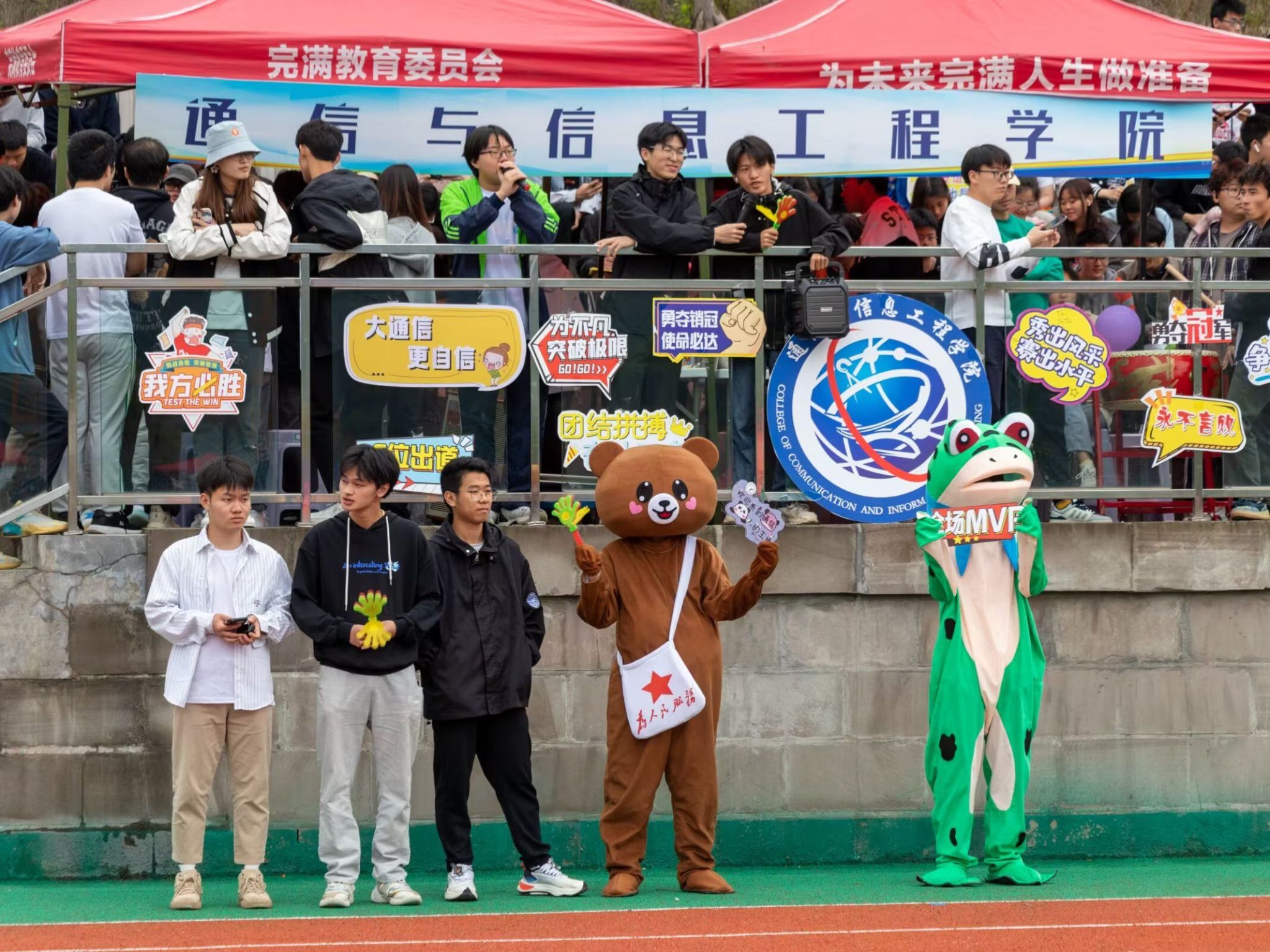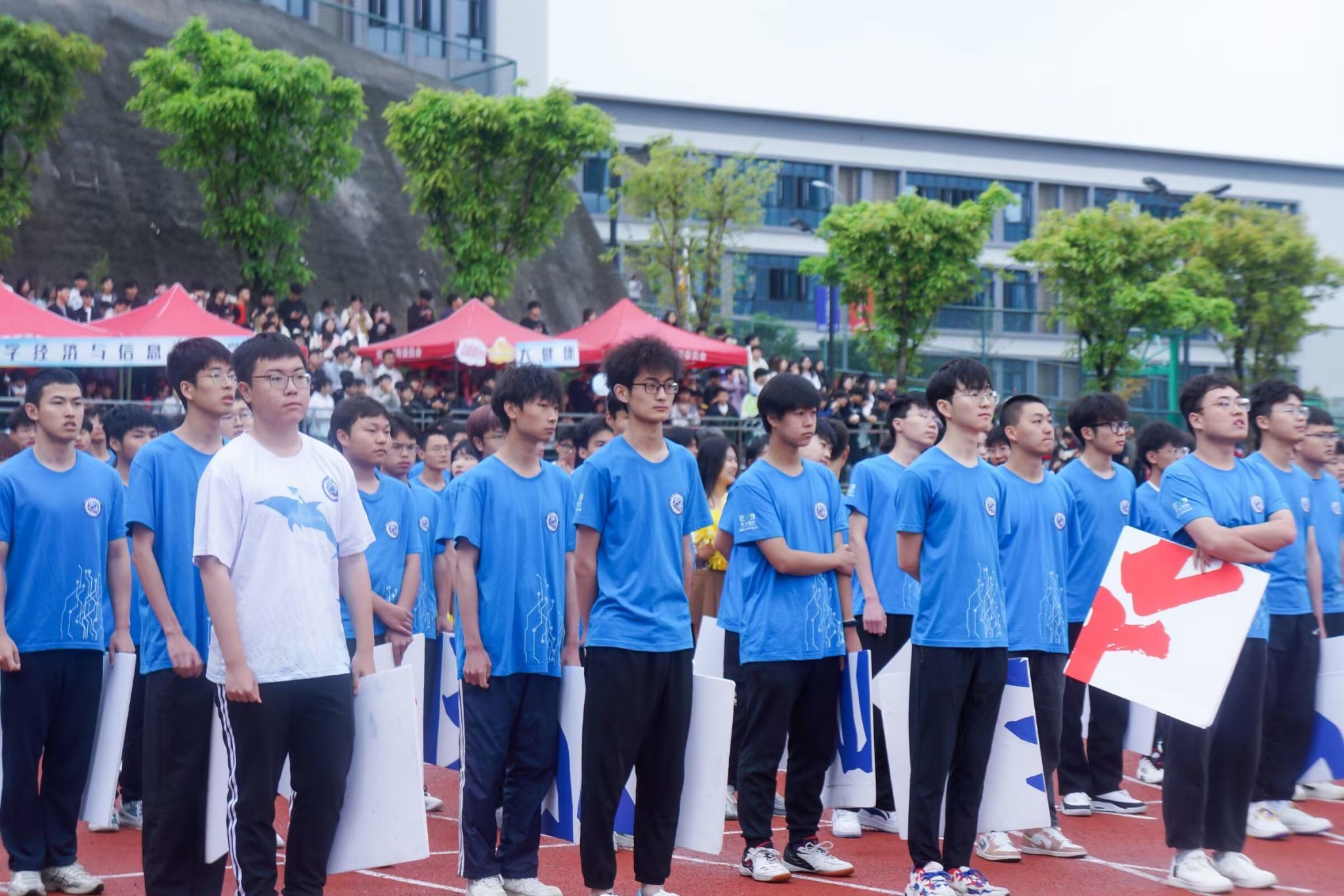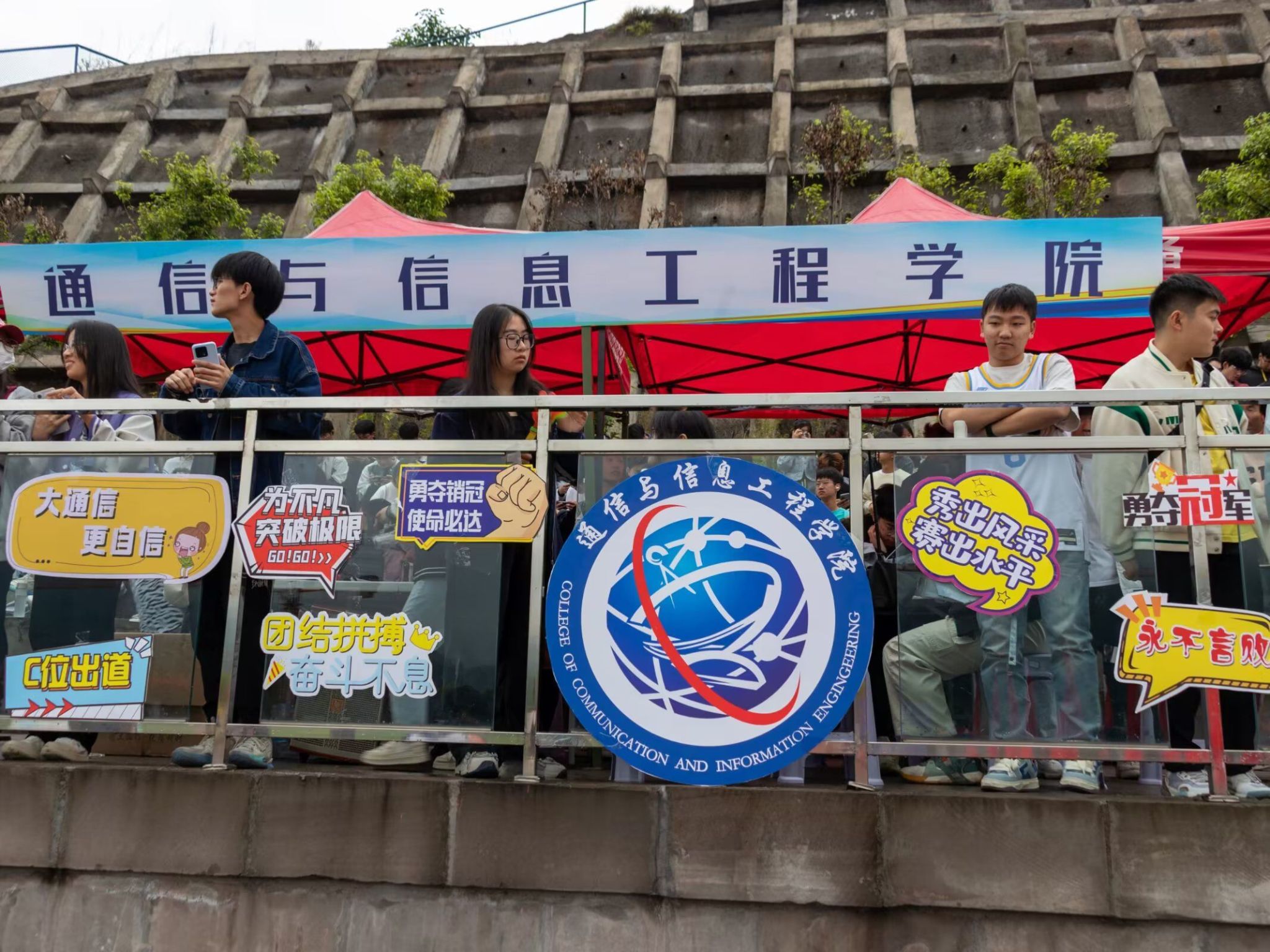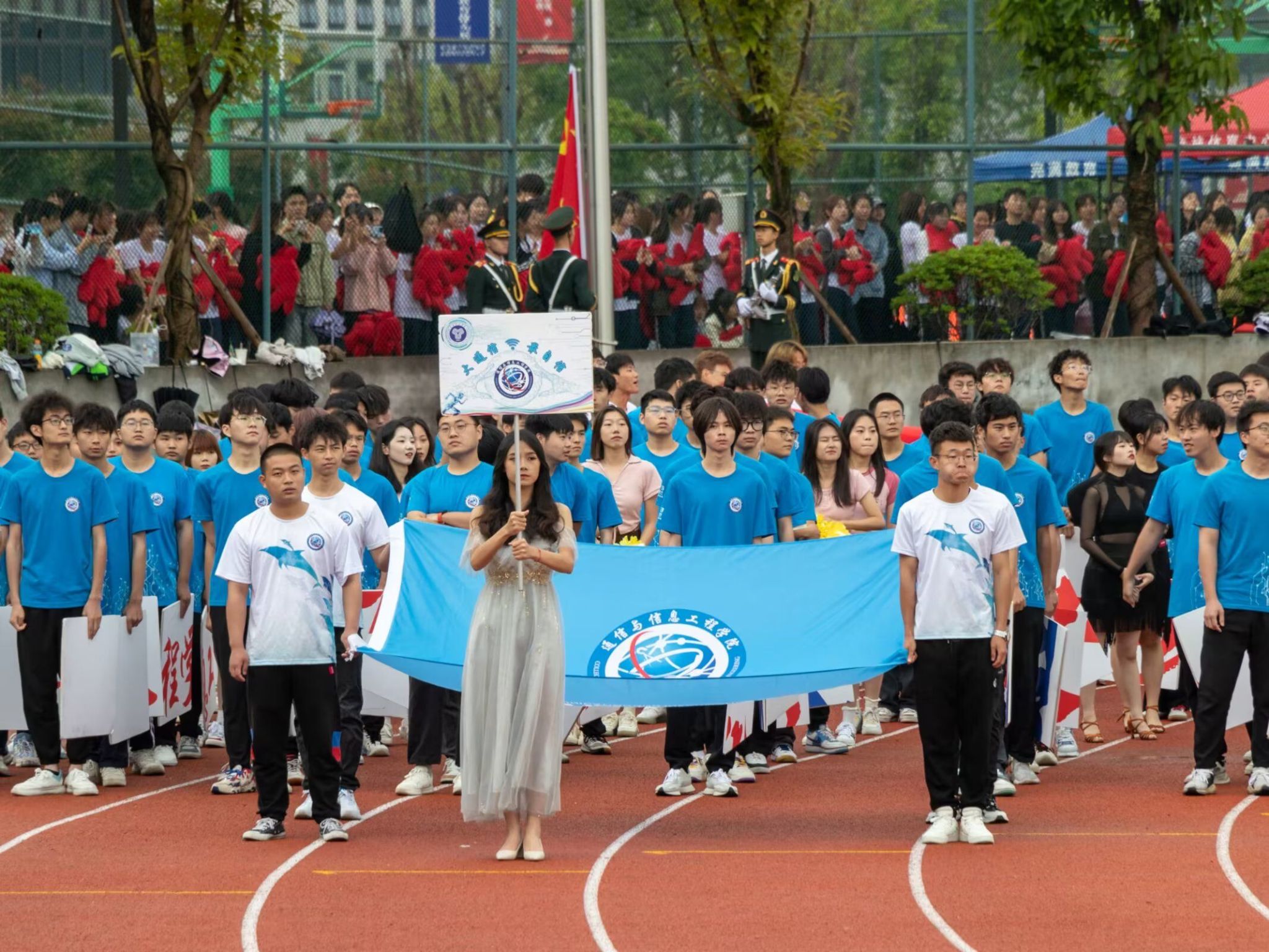 在这天高气爽的日子里,第十五届田径运动会开幕式顺利召开。阴雨绵绵也抵挡不住同学们的热情。通信与信息工程学院的方阵代表们精神抖擞,《静待花开》的小仙女们优雅端庄,还有观众席上的同学们也在高声呐喊,运动健儿们整装待发,群雄乍起,英雄谁属?让我们拭目以待吧!