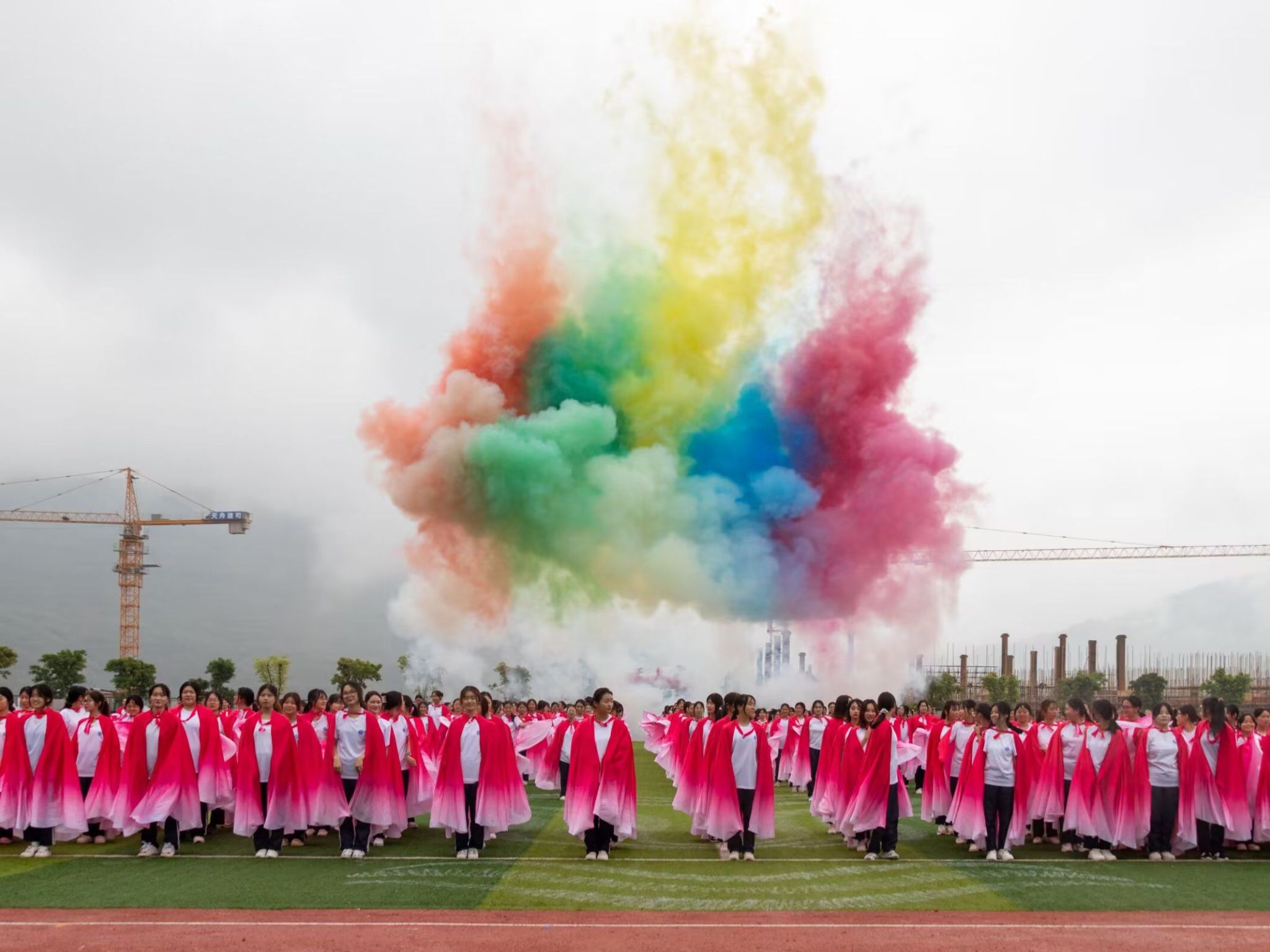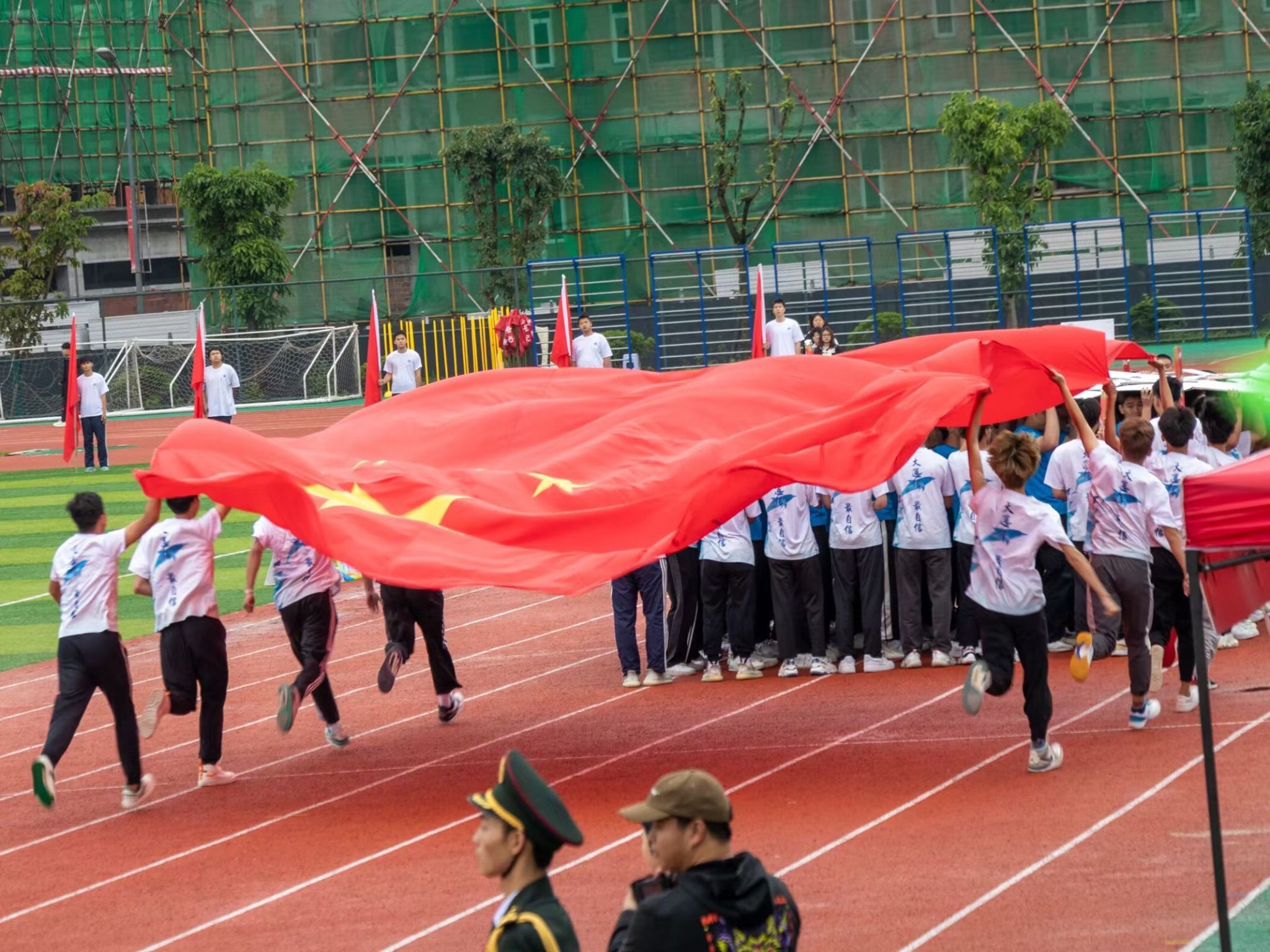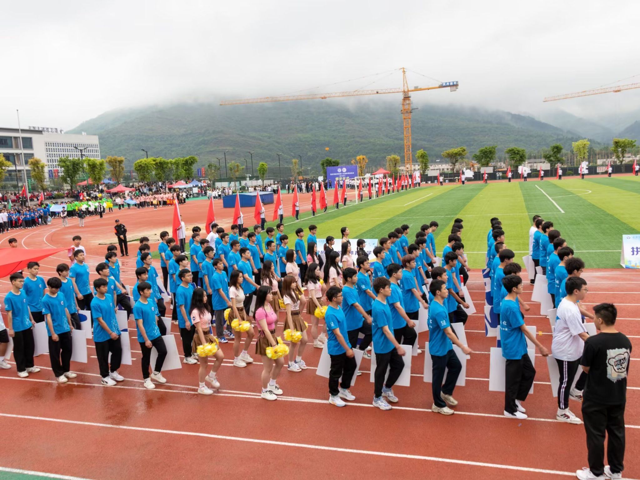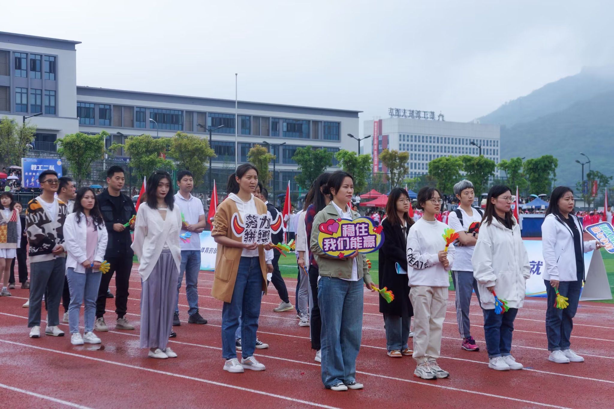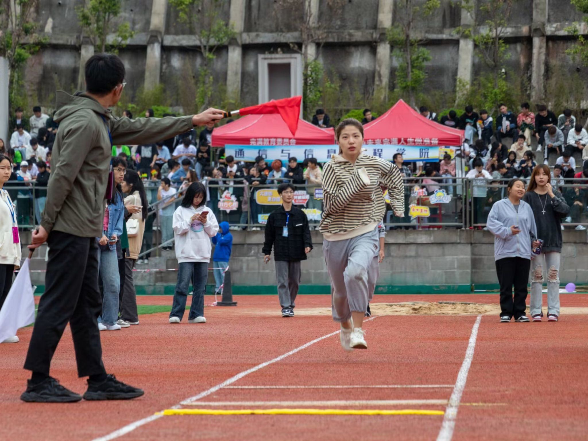 在这天高气爽的日子里,第十五届田径运动会开幕式顺利召开。阴雨绵绵也抵挡不住同学们的热情。通信与信息工程学院的方阵代表们精神抖擞,《静待花开》的小仙女们优雅端庄,还有观众席上的同学们也在高声呐喊,运动健儿们整装待发,群雄乍起,英雄谁属?让我们拭目以待吧!