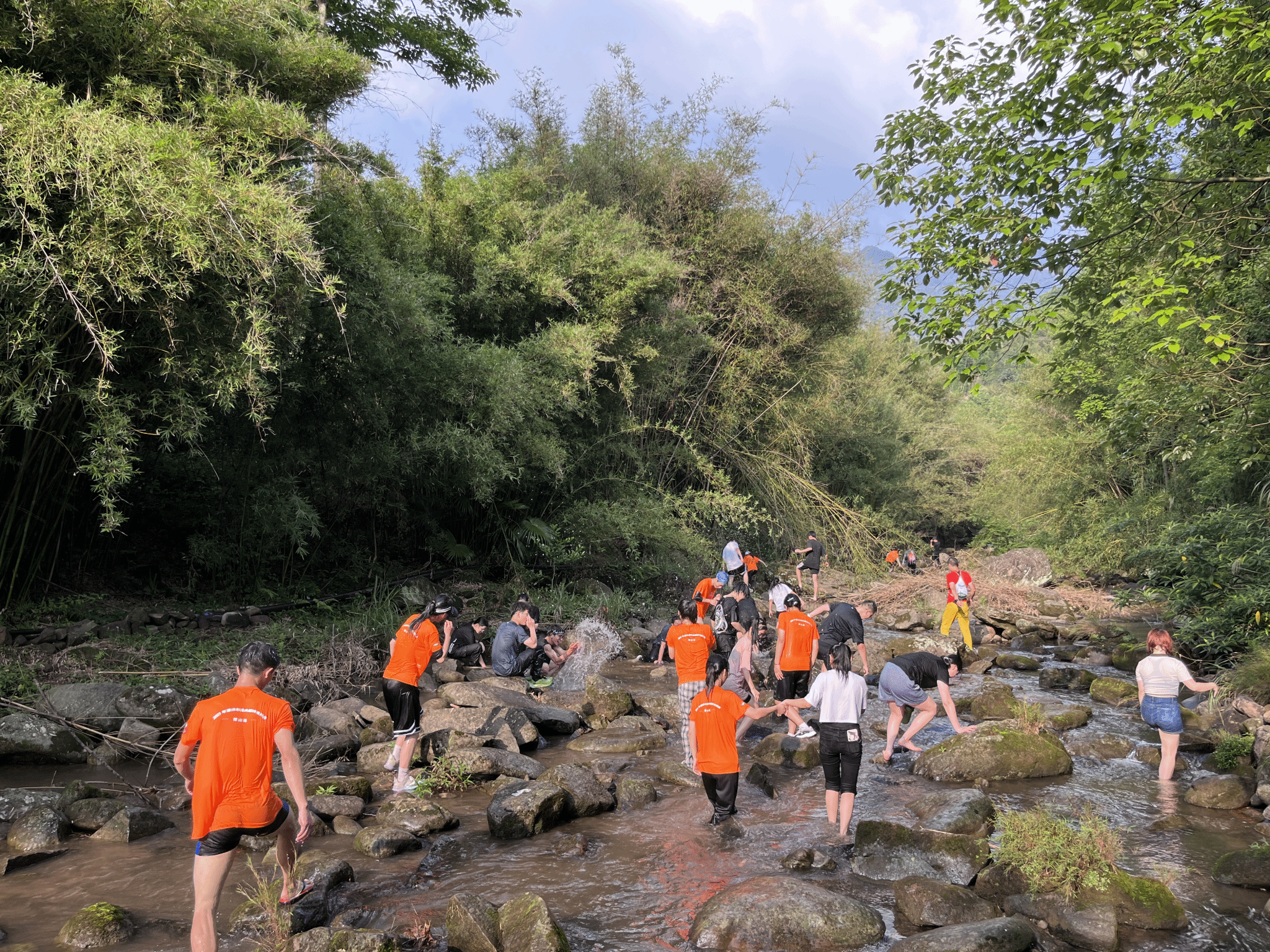 溯溪,也称之为沿溪径徒步,指的是沿着溪流从上游向下游或从下游到上游的徒步活动,它是集体育、旅游、休闲于一体的大众户外运动。本次活动地点线路难度低属于沿溪径最低限度徒步,同学们们沿着小溪逆流流而上,流水声伴着蝉鸣,悦耳动人,大家纷纷放松起来,与老师们一起寻找儿时的欢乐——抓螃蟹、打水仗,一路欢笑一路前行。在这里,老师和同学们可以抛开学业和工作,在山野里感受自然的平静、纯净与美妙,在阳光与小溪中放松身心、尽情享受。活动中,同学们们热情高涨,一片欢声笑语。