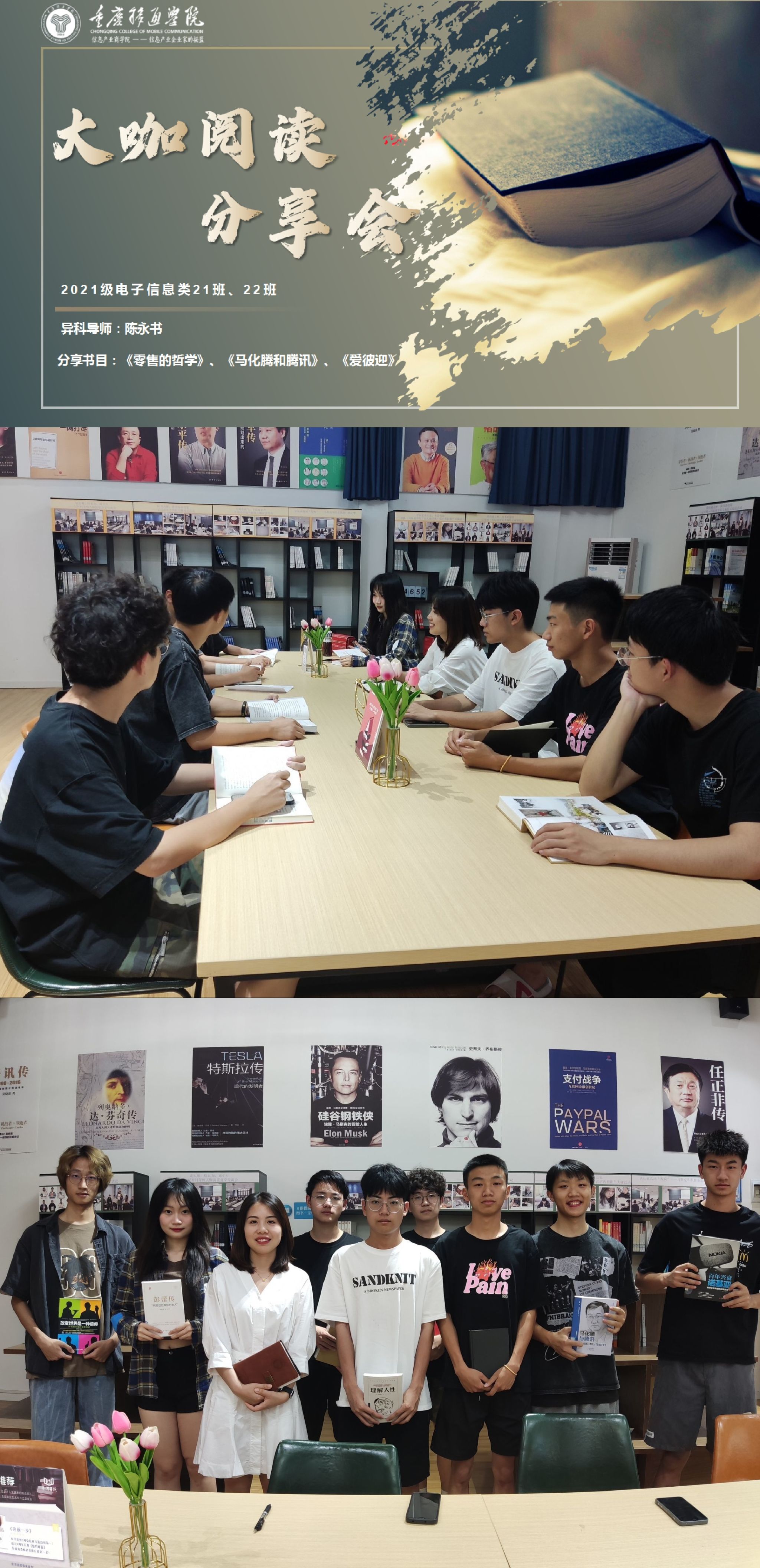 为丰富学生校园生活,进一步引导同学们养成良好的读书习惯,培养同学们的商科思维与眼界。5月17日下午,在异科导师陈永书的带领下,通信与信息工程学院2021级电子信息类21班、22班在綦河书院二号楼昭明·大咖阅读中心开展了一月一读的大咖传记阅读分享会。