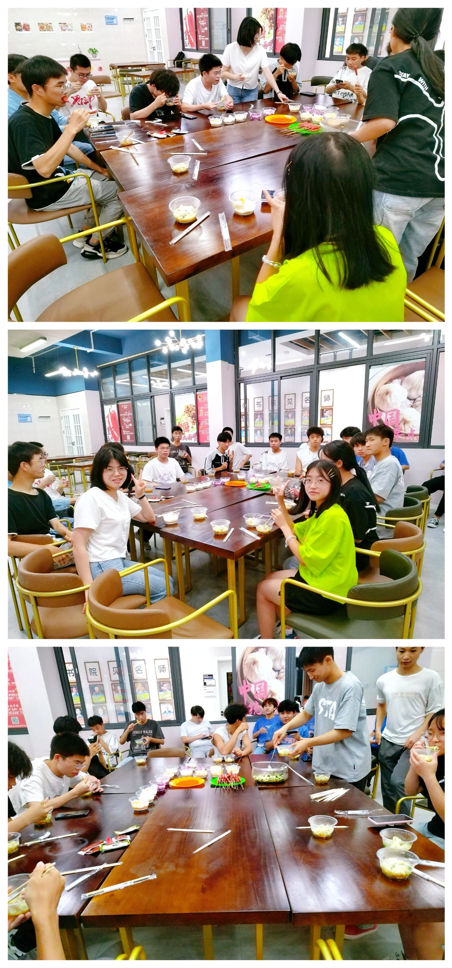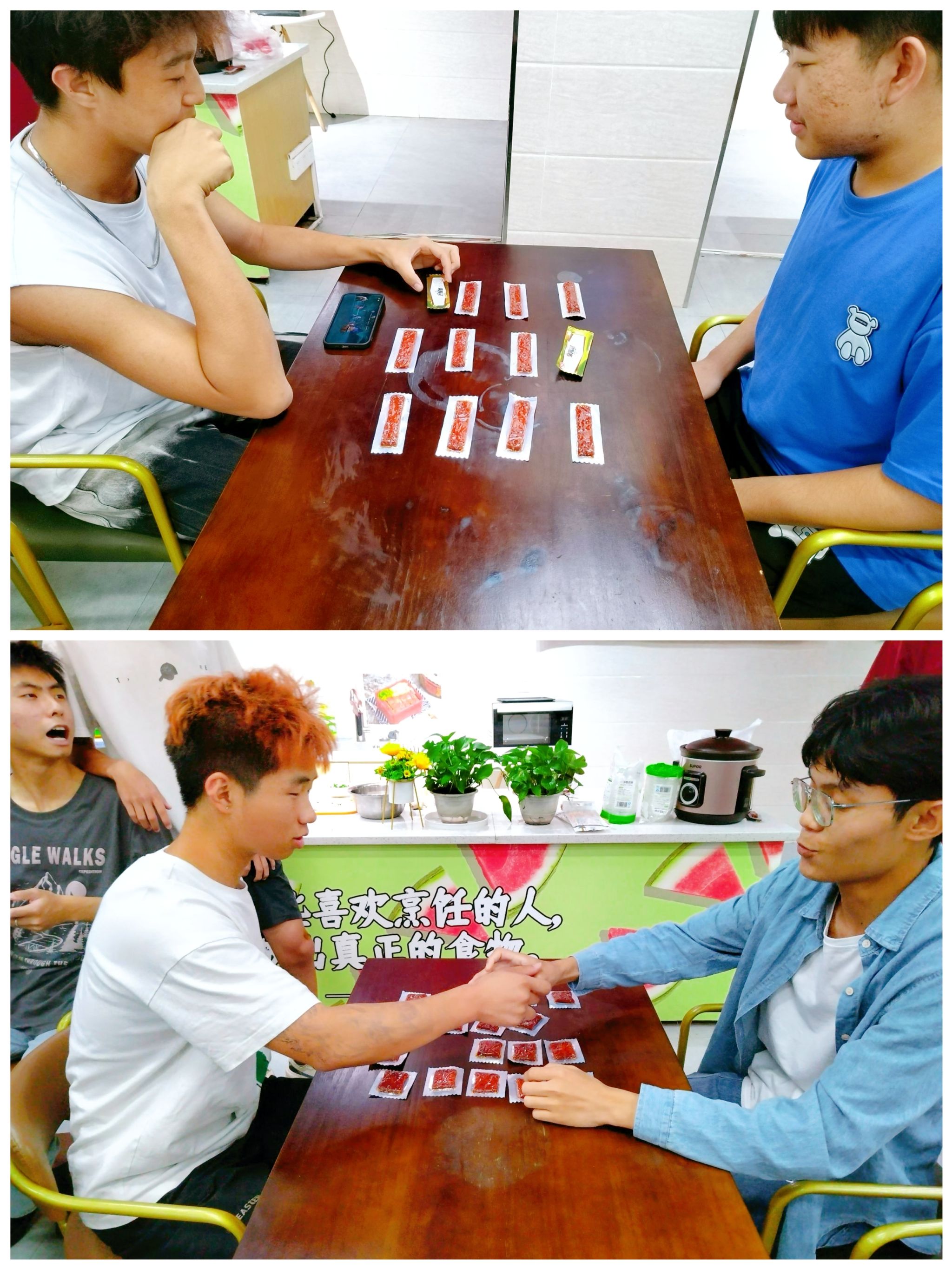 为了确定美食制作的分工,大家设置了翻牌游戏,游戏规则是各个小组派出一位代表,由代表来进行翻牌,翻到相同颜色的零食则制作同一种食物。制作的食物选择共有两种,一是水果捞和烤肠,二是包抄手。