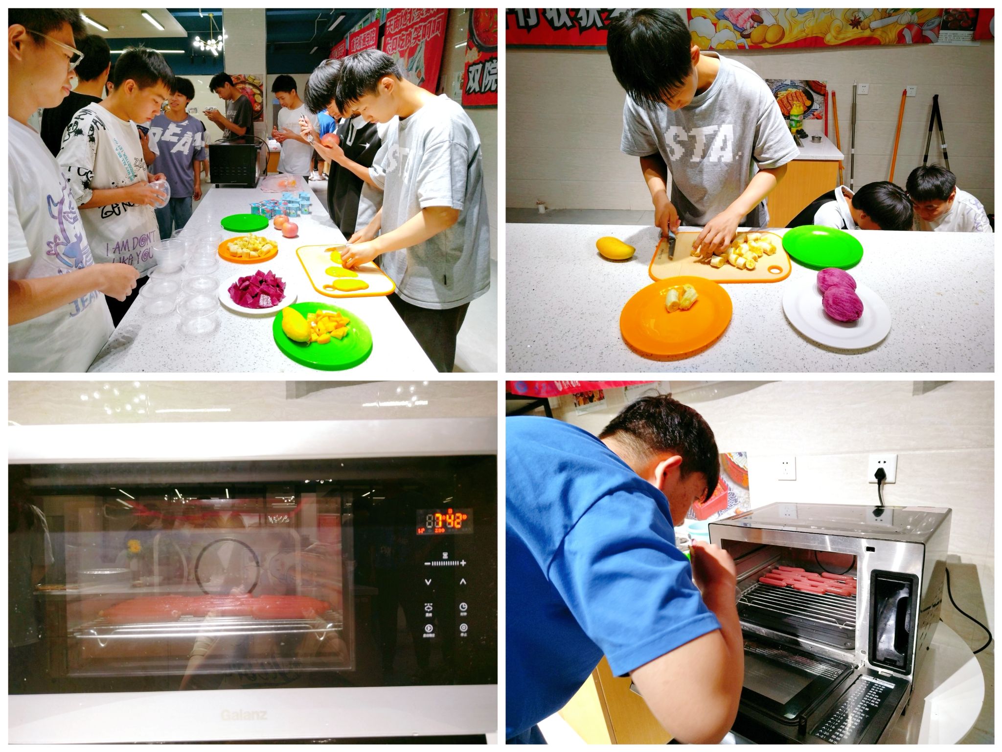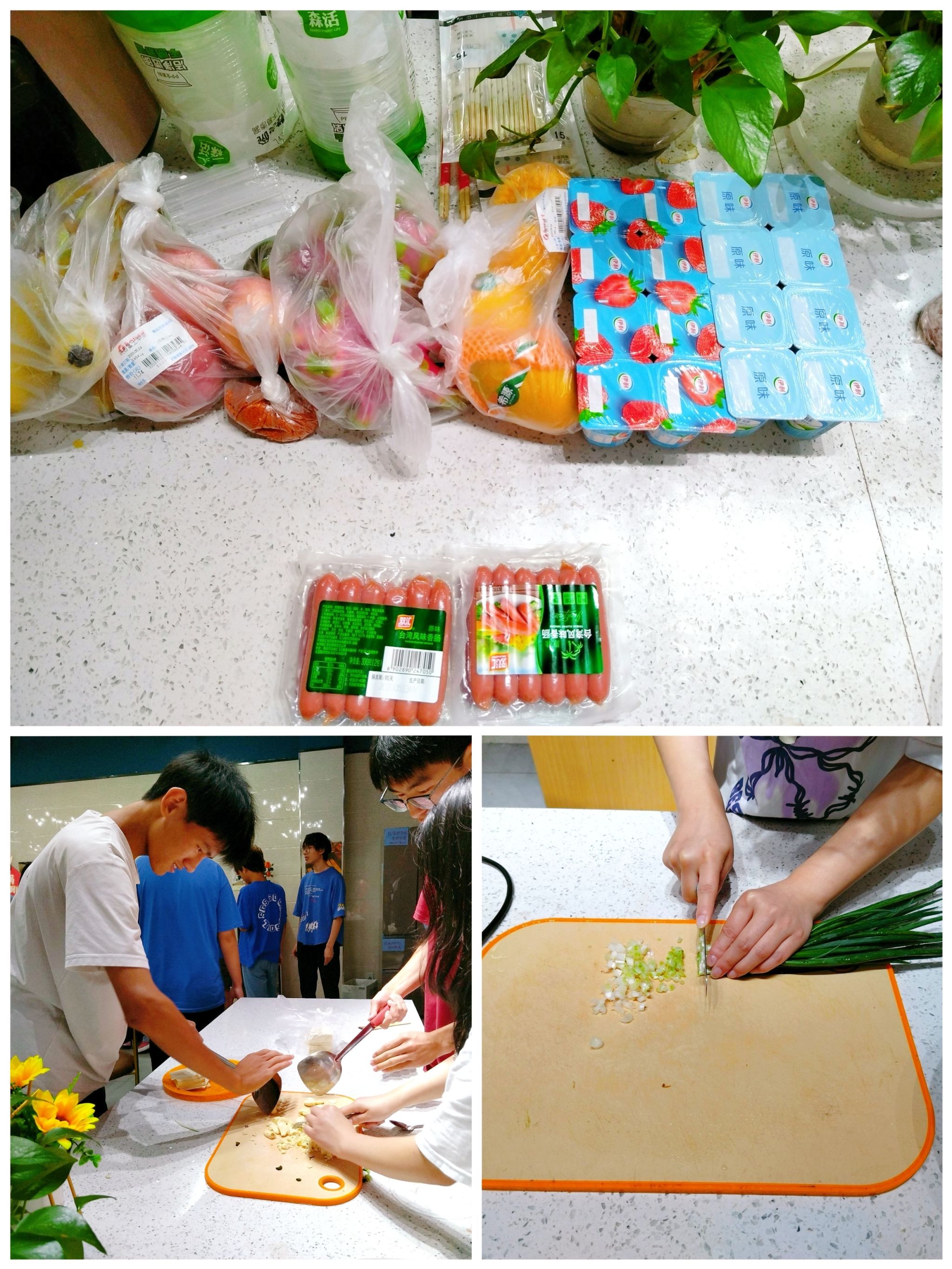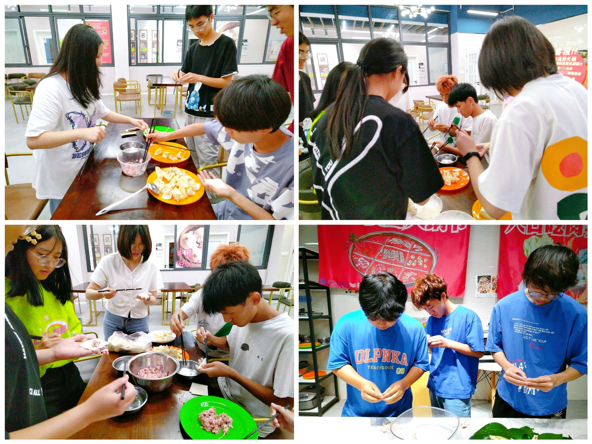 翻牌游戏结束后,大家都选好了即将要制作的美食。第一组和第三组选择水果捞和烤肠,每一位成员都纷纷拿到对应的食材,开启了美食制作之旅:第一组成员洗好水果,并把水果切成小块放入餐具中,最后倒入酸奶;第二组成员把火腿肠准备好,放入烤箱里进行烘烤。第二组和第四组选择包抄手,大家将抄手皮和猪肉馅准备好,开始包起抄手来。现场其乐融融,大家都沉浸在制作美食的快乐中。