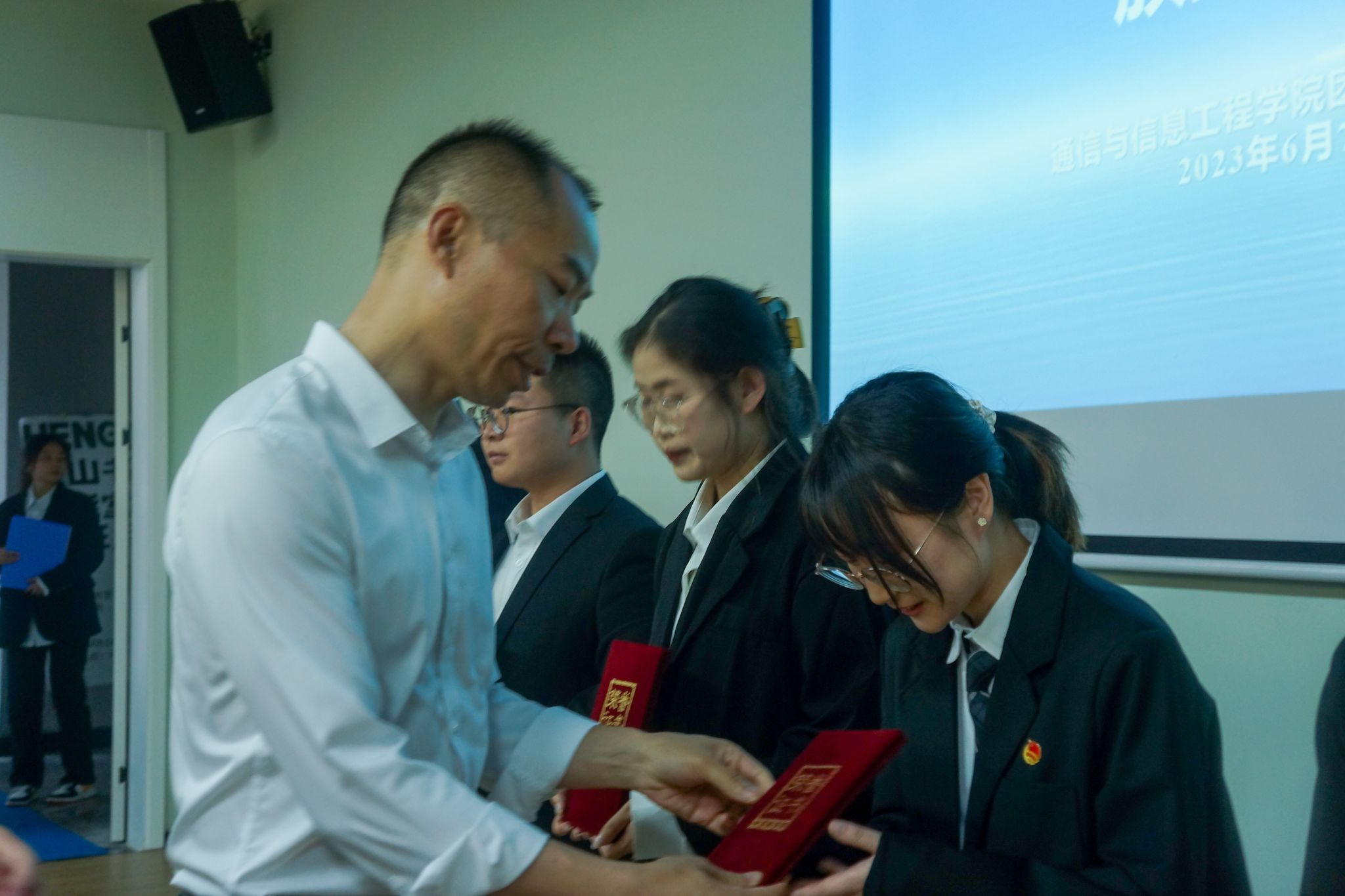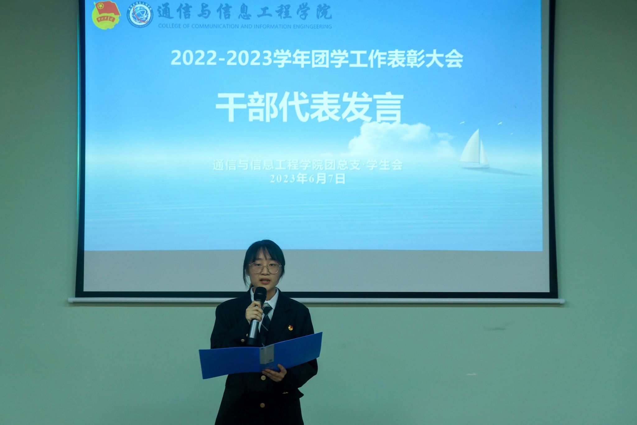 笑容中带着泪花,是总结也是离别。在老师们的见证下,优秀干部干事的名单结果已公示。在大家的掌声中,通信与信息工程学院团总支书记田海燕老师、学工办主任周俊老师为优秀干事代表颁奖;通信与信息工程学院王国树副院长为优秀干部代表颁奖。