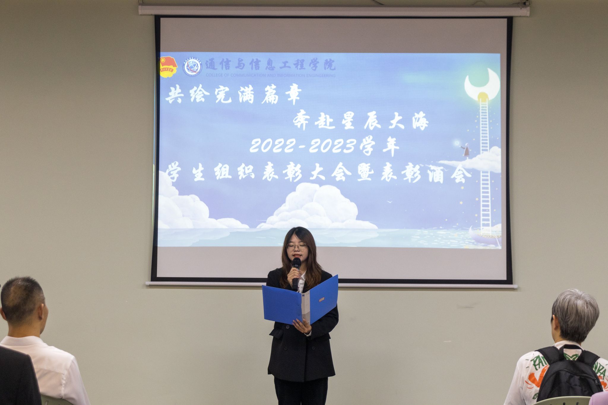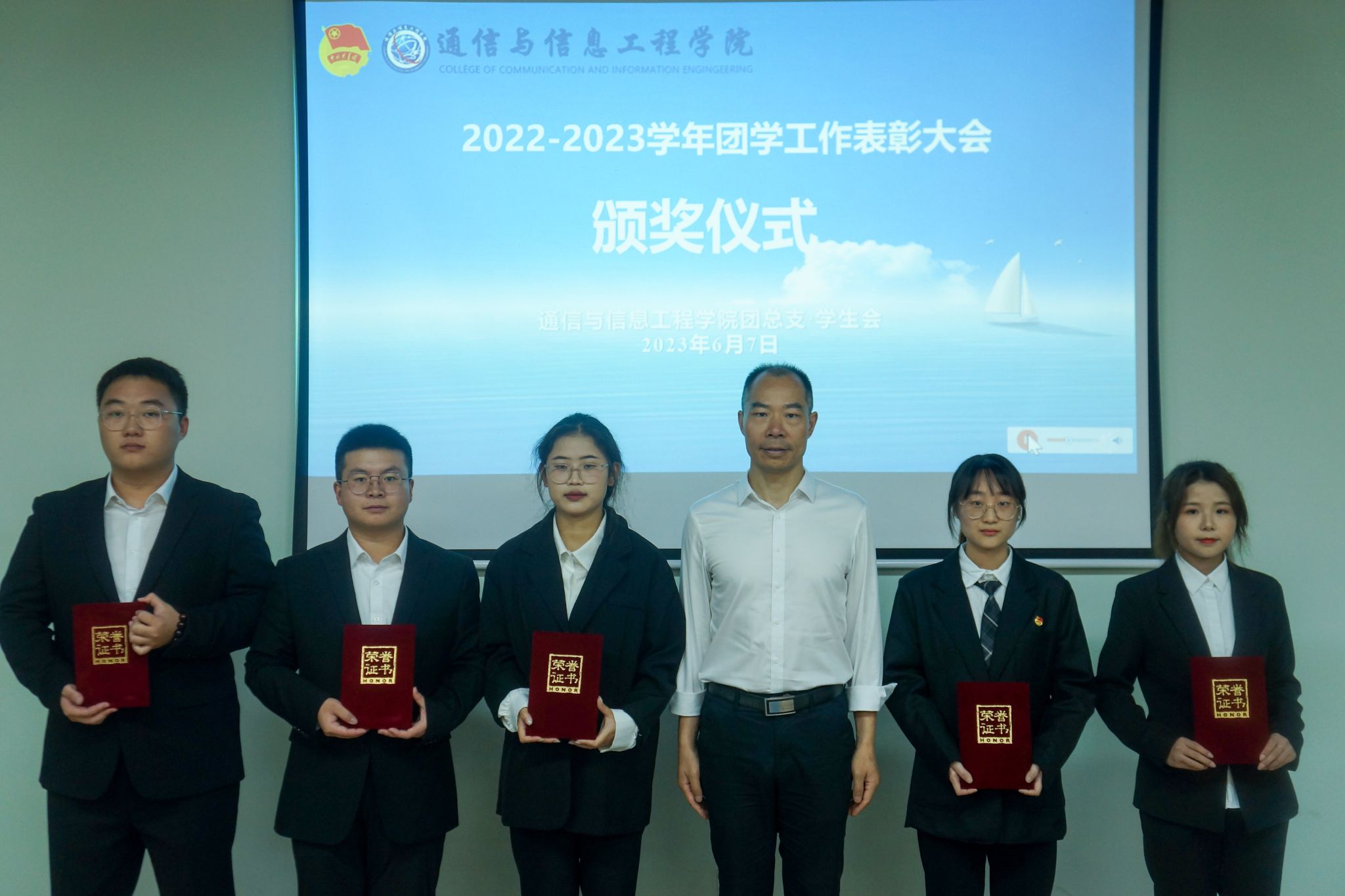 为总结交流本学年团学工作经验,表彰在工作中表现优秀的团学干部和干事,有效调动团学工作的积极性,以及衷心感谢大家在过去一年的辛勤付出。2023年6月7日18:00,通信与信息工程学院学生组织表彰大会暨表彰酒会在横山书院中庭和知物·多功能活动室顺利进行。通信与信息工程学院副院长王国树老师、学工办主任周俊老师、团总支书记田海燕老师、专任教师田凌燕老师和莫文中老师以及我院全体辅导员和学生代表出席本次大会。