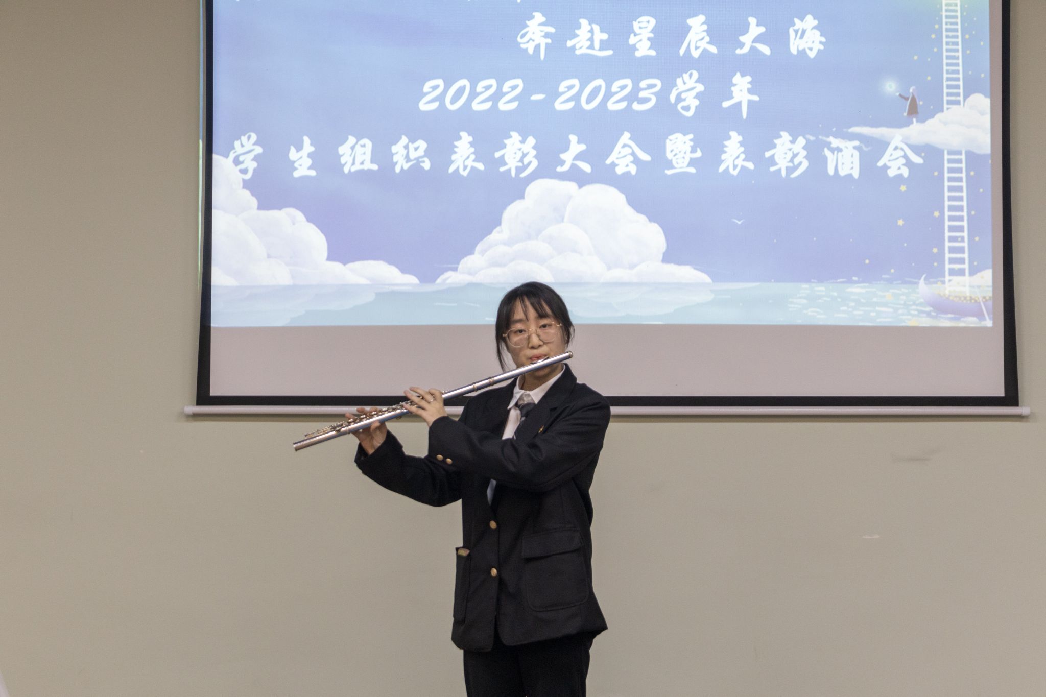 视频的片段承载着大家从相识到相知,勾起了大家满满的回忆。紧接着石思瑞同学给大家带来长笛演奏《刻在我心底的名字》。一曲终,大家都沉醉于古典悠扬的笛音。而后,艺术团的同学又给大家带来了歌曲《岁月神偷》和《危险派对》。