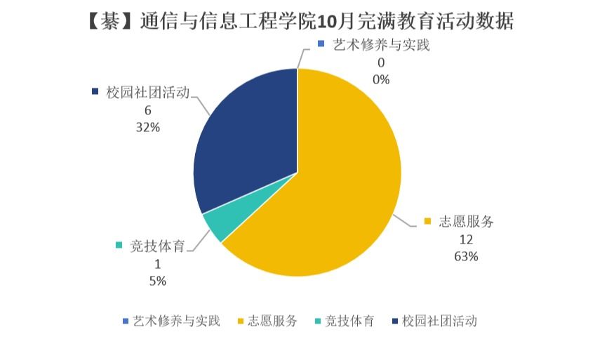 通信过程与信息工程学院完满教育APP管理小组对本院十月的完满教育数据进行统计和分析,通信与信息工程学院(綦江校区)十月份共推19场完满教育特色活动,其中校园社团活动6场,艺术修养与实践0场,志愿服务12场,竞技体育1场,覆盖人数9139人次。