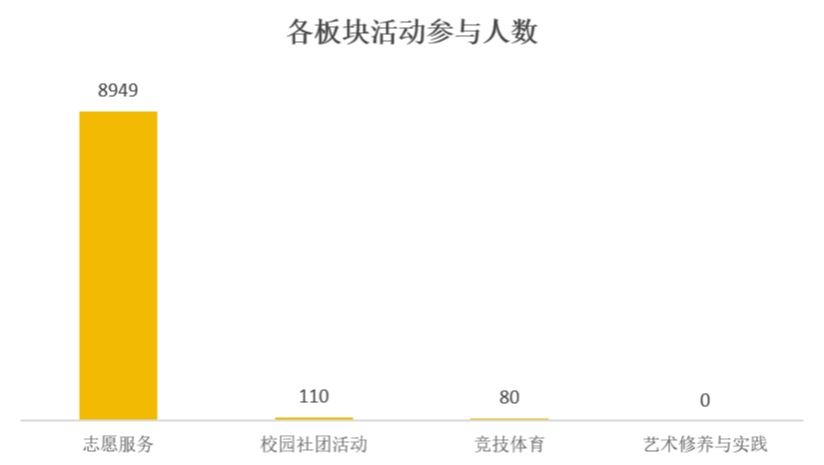 从十月的活动数据可观察出,本月的完满教育活动中,志愿服务活动板块参与人数最高,达到8949人,艺术修养与实践活动板块参与人数最少,为0人。
