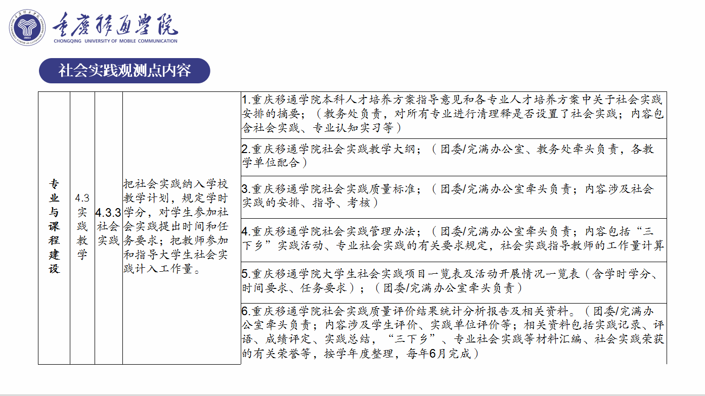 肖琳老师首先就社会实践观测点进行详细解读,她表示,学校已把社会实践纳入教学计划,规定学时学分,对学生参加社会实践提出时间和任务要求;把教师参加和指导大学生社会实践计入工作量,希望大家都能够引起重视。