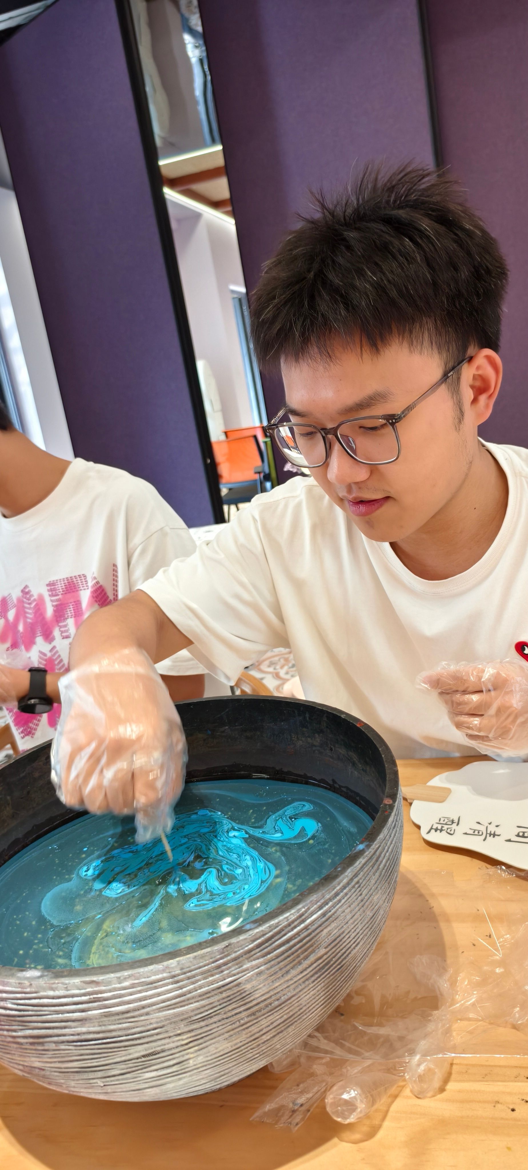 通过汪鑫老师的细致介绍后,同学们纷纷从校园景观、各书院主题色中汲取灵感,投入到漆扇制作当中。校园里的美丽风景和书院的独特主题色为同学们提供了丰富的创作素材。有的同学以校园中的花朵为图案,用大漆精心描绘出娇艳的色彩;有的则从书院的主题色中获得启发,设计出简洁而富有现代感的扇面。在制作过程中,同学们全神贯注,一笔一划都凝聚着他们对青春的感悟和对美的追求。