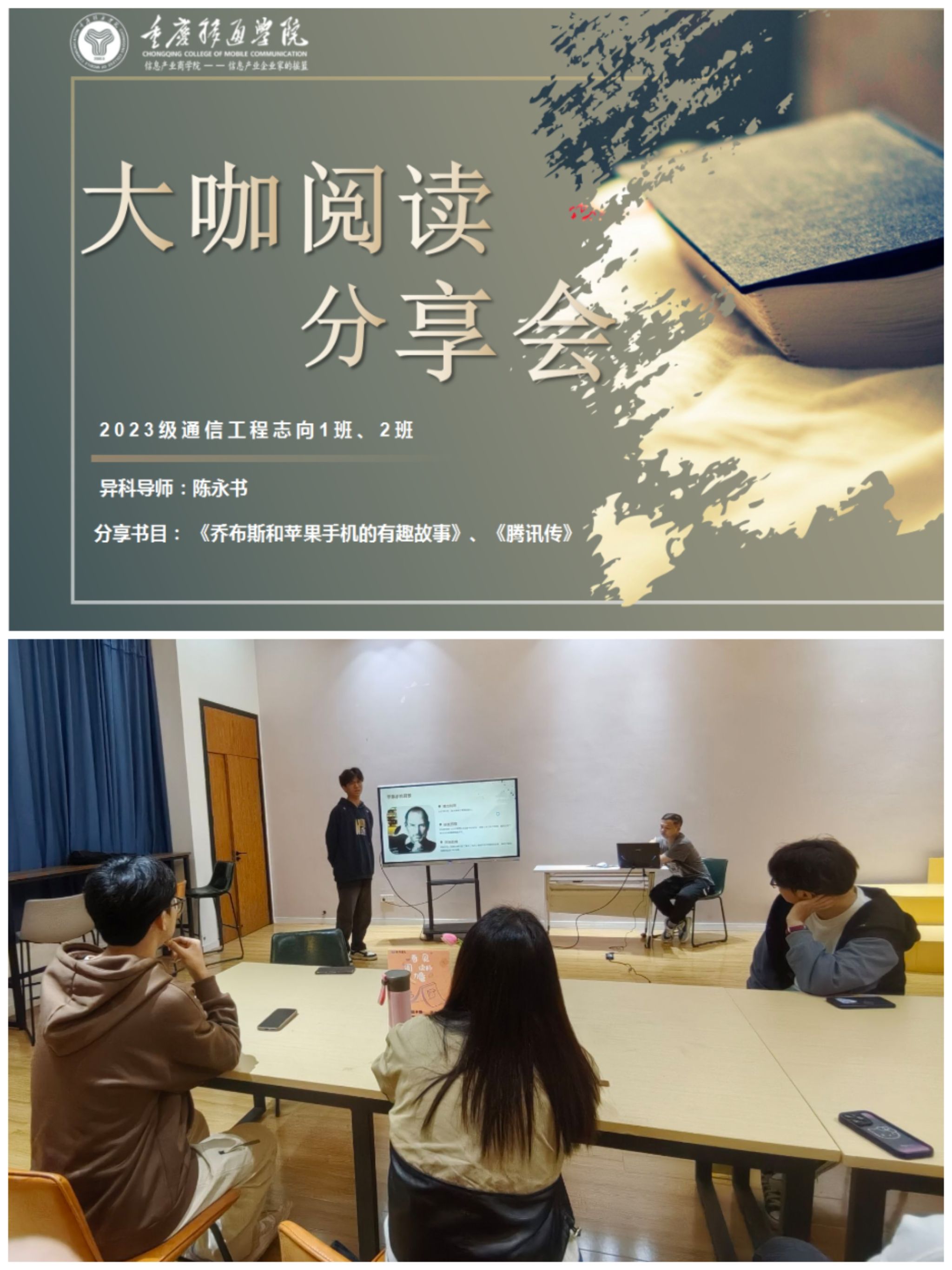 读大咖传记,同智者对话。乔布斯曾说:"我深信,成功的创业者与不成功的创业者之间的差距,大约有一半是纯粹的毅力"。马化腾曾说:“有时候不辛苦但是压力大,有时候是辛苦但是压力不大”。十一月的大咖阅读分享会在秋意绵绵的日子里如约举行。2024年11月13日中午,2023级通信与信息工程学院通信工程志向1班、2班异科班在綦河书院昭明·大咖阅读中心开展了11月的大咖阅读分享会。本次读书分享会有第 组承办,于11月13日中午12点半在綦河书院二号楼昭明大咖阅读室成功举办,同学们通过PPT讲解分享阅读收获。