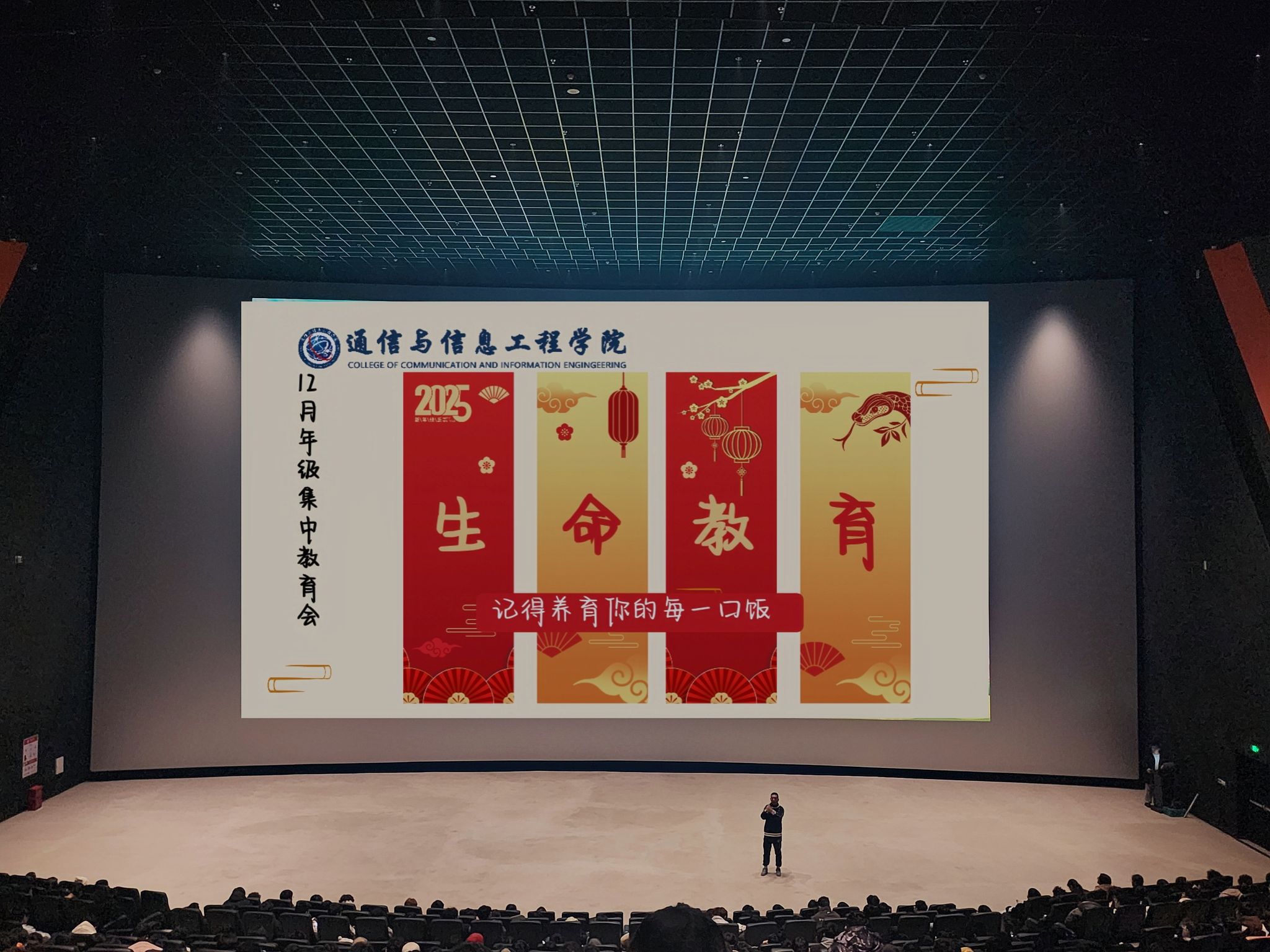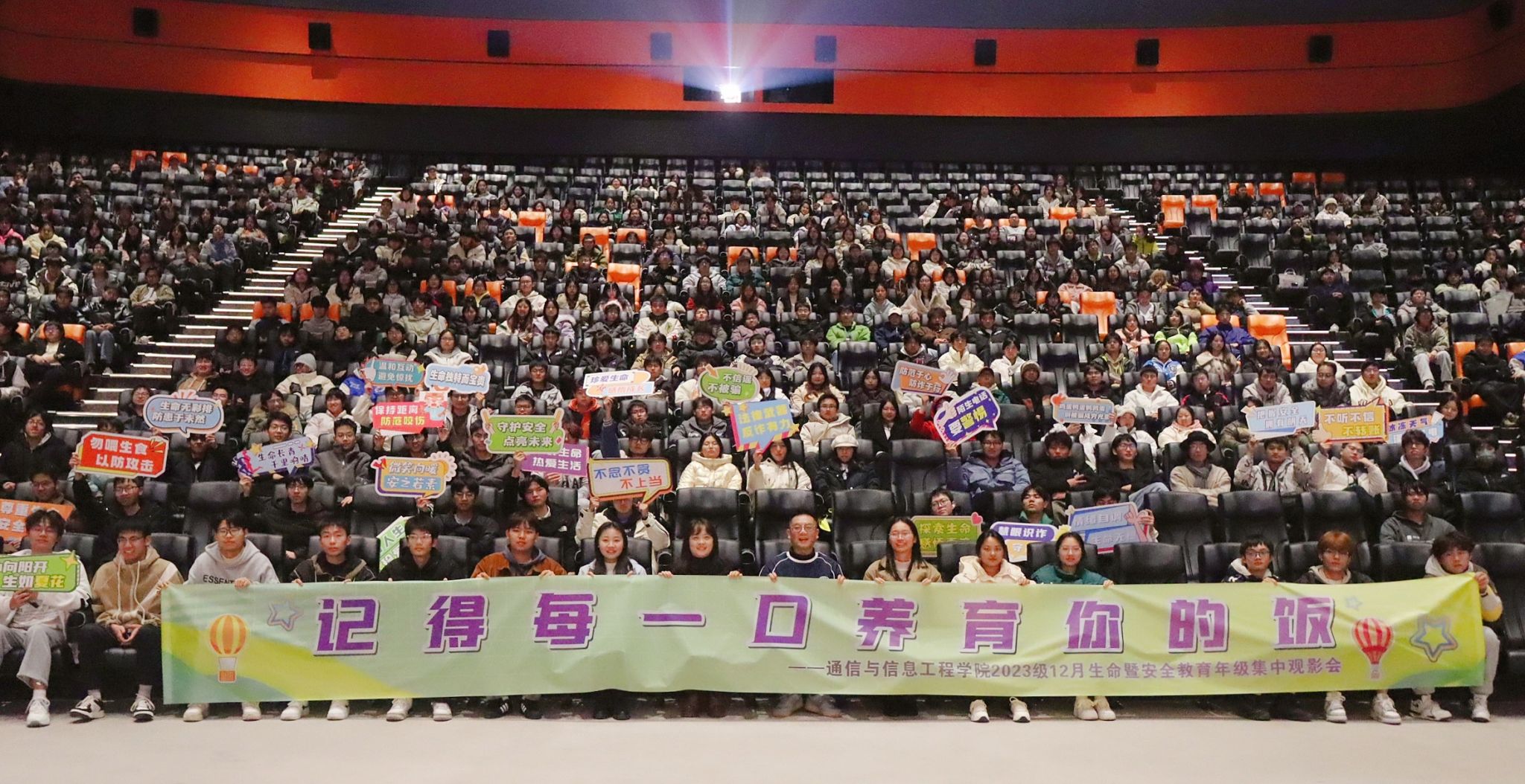 为了进一步加强生命教育、安全教育,引导学生树立珍爱生命,幸福生活的理念,通信与信息工程学院于2024年12月11日在万画影城1号巨幕厅,开启了一场以“记得养育你的每一口饭”为主题的2023级12月生命教育暨安全教育集中教育观影会,学院辅导员田海燕、胡戈立、翁焰、程希老师共同为通信学子开展了一场撼动心扉的生命教育,覆盖学院全体2023级学生。