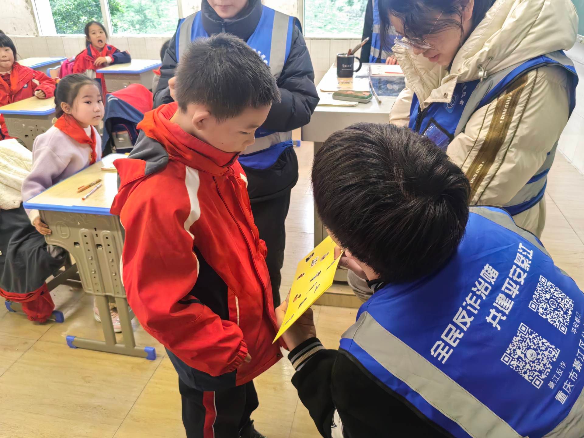 当今,拐卖儿童的现象依旧是社会难以根除的顽疾,此类案件仍间歇性出现。为了切实提高儿童的自我防范意识,降低儿童被拐的风险,保障儿童能够健康无忧地成长,通信与信息工程学院飞鹰反诈宣传专项支队携手大数据学院青年志愿者协会联合通信与信息工程学院通信工程07团支部于2024年12月9日下午走进綦江区登瀛小学开展了“智破诈骗迷局,共筑安全防线”儿童防拐宣传进校园活动。此次活动参与人数共计19人,受益人数共计50人。