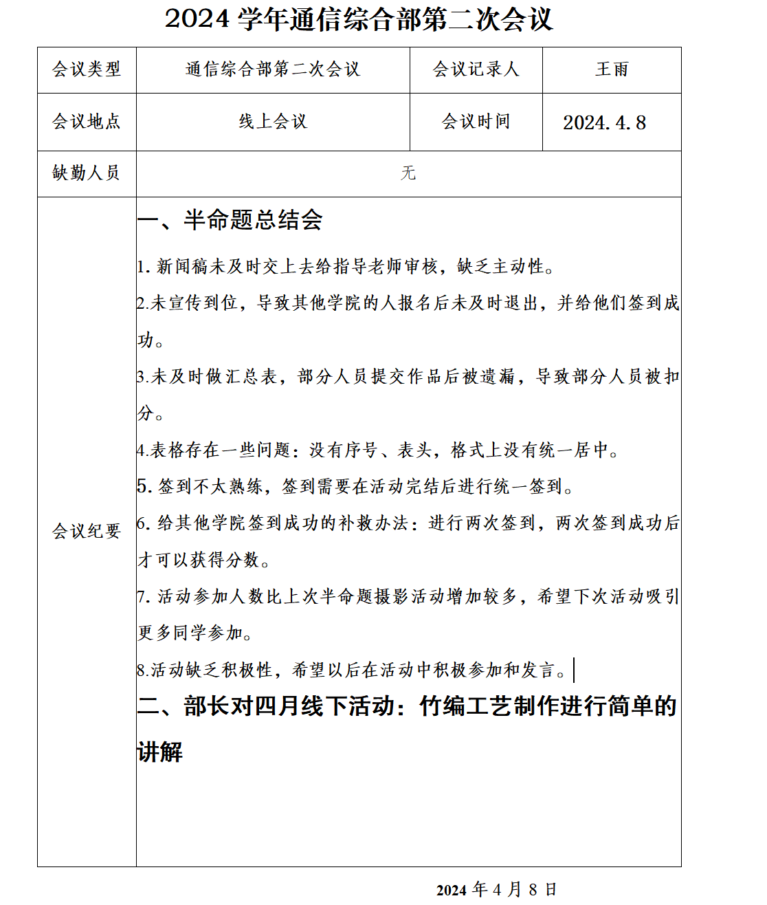 针对汇总表格式问题,会议决定由专人负责表格的设计与审核,确保数据完整、格式统一。此外,评分环节将引入双重核查机制,避免作品遗漏或评分不公的情况发生。