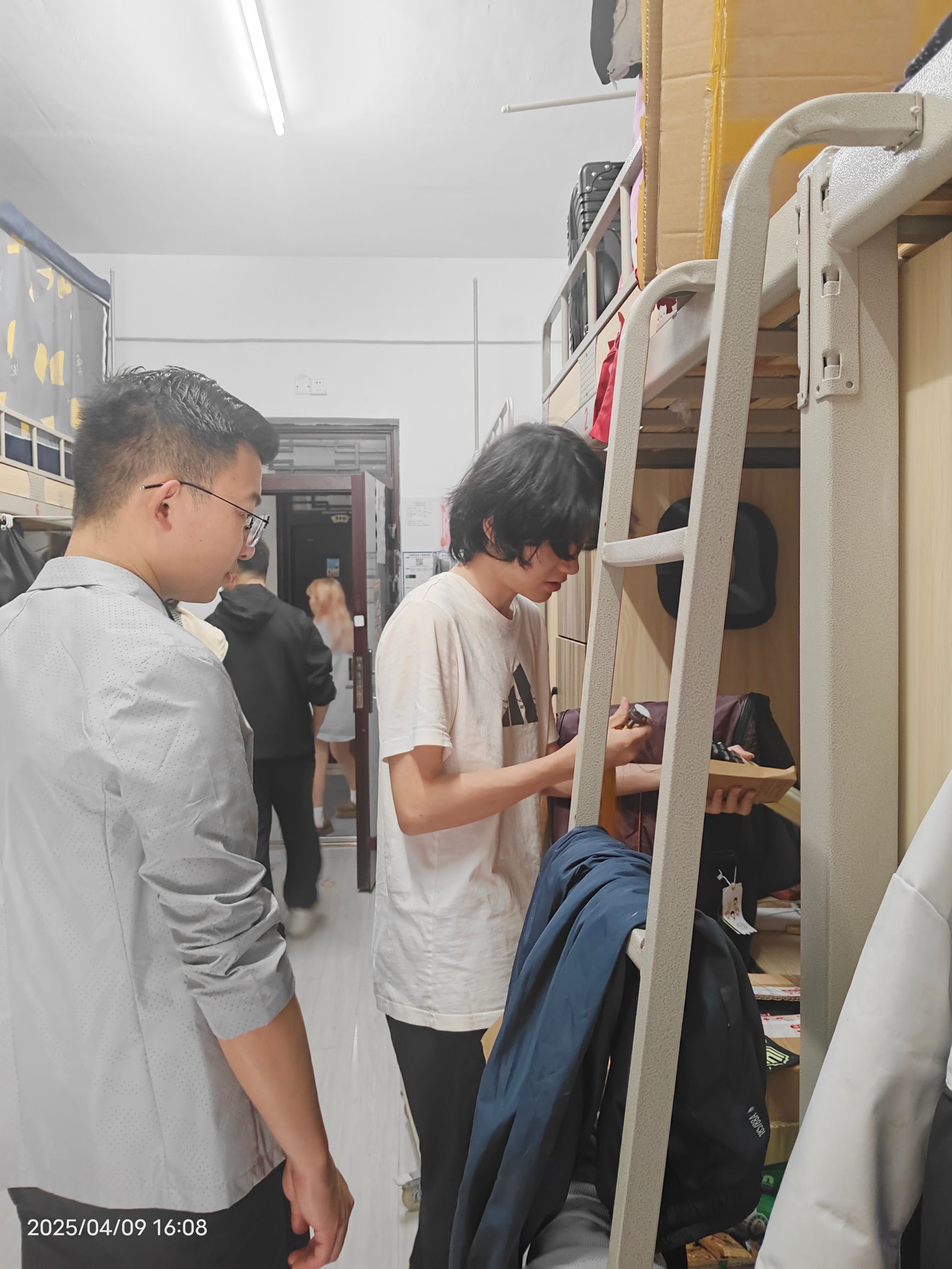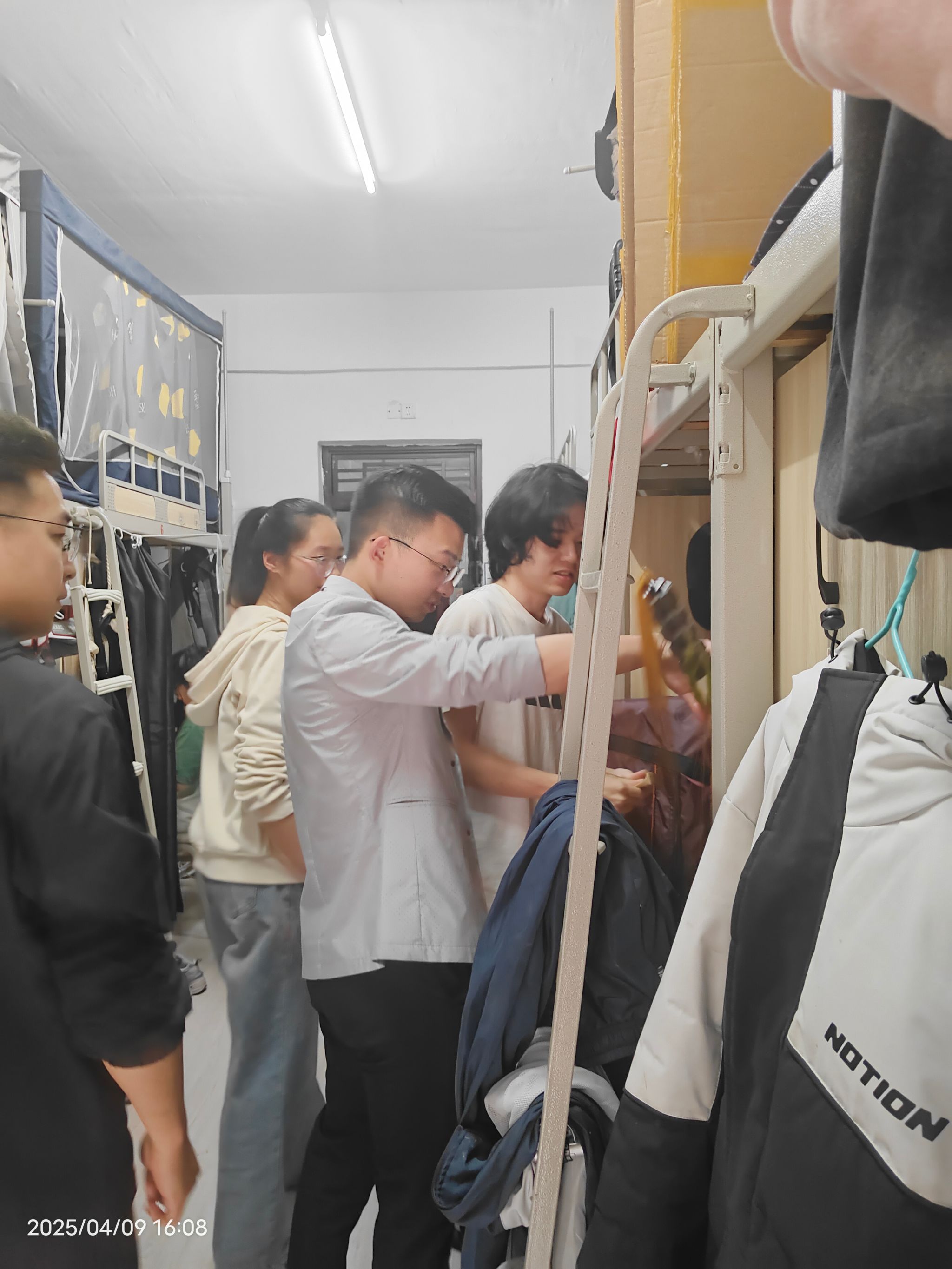 温宗航老师与程希老师重点检查了寝室用电安全与卫生环境。温老师化身“生活安全员”,逐一排查插线板使用情况,并幽默提醒:“‘热得快’可不能‘热’出隐患啊!”针对部分凌乱的桌面,他亲自示范收纳技巧,用“分区归类法”让书本和日用品各归其位。程希老师则关注床铺安全,提醒学生加固护栏、注意防滑,引得学生直呼“程妈式关怀”。