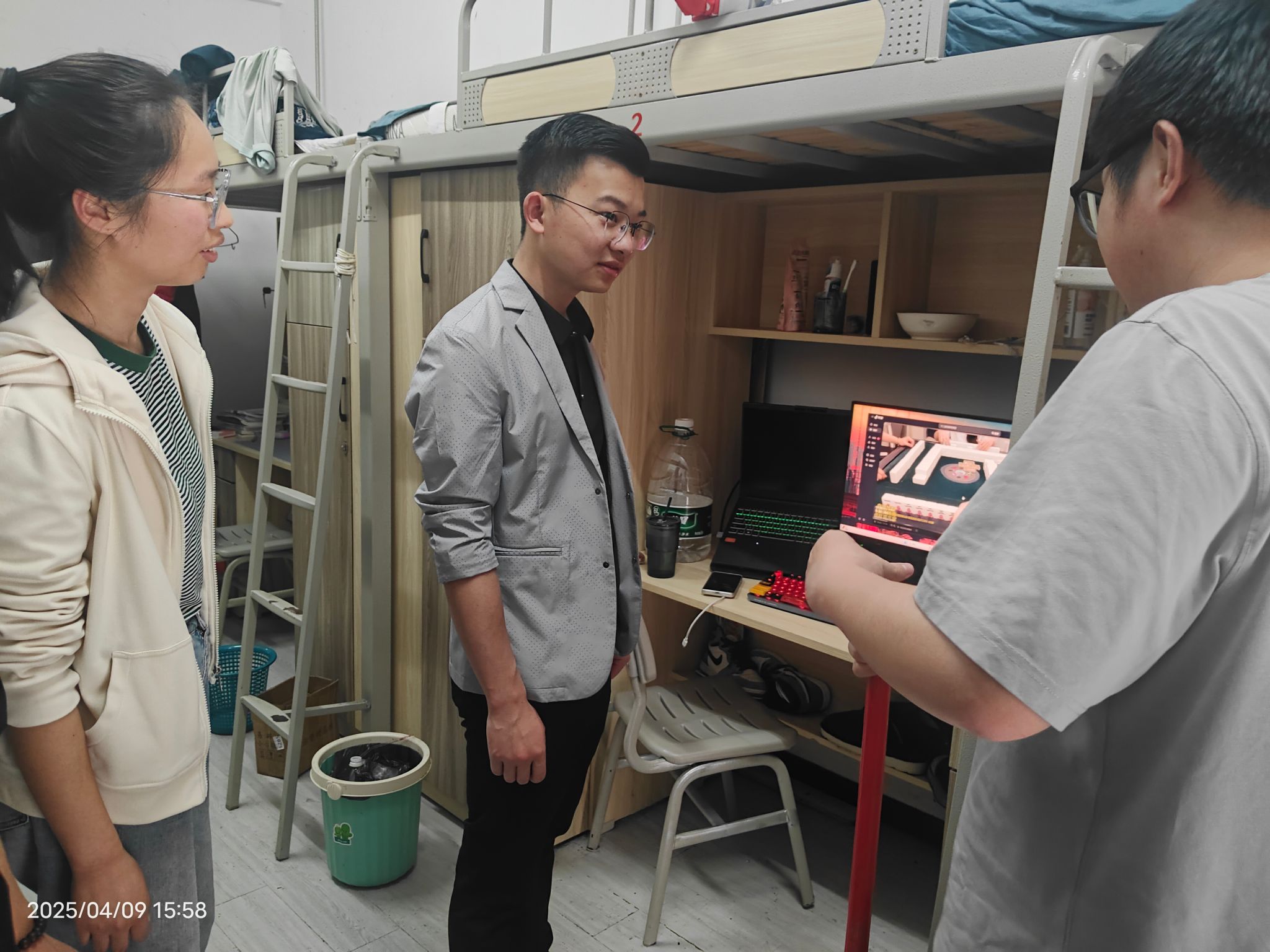 在走访中,温宗航老师结合人工智能行业动态,与学生们展开“职业生涯微讲堂”。他在翻阅专业书籍时感慨:“编程语言迭代快,但底层逻辑是相通的。就像寝室收纳要有框架,职业规划也要有主线。”程希老师则从学业角度支招,针对同学们的竞赛困惑,现场连线学院科创团队负责人安排“一对一帮扶”。