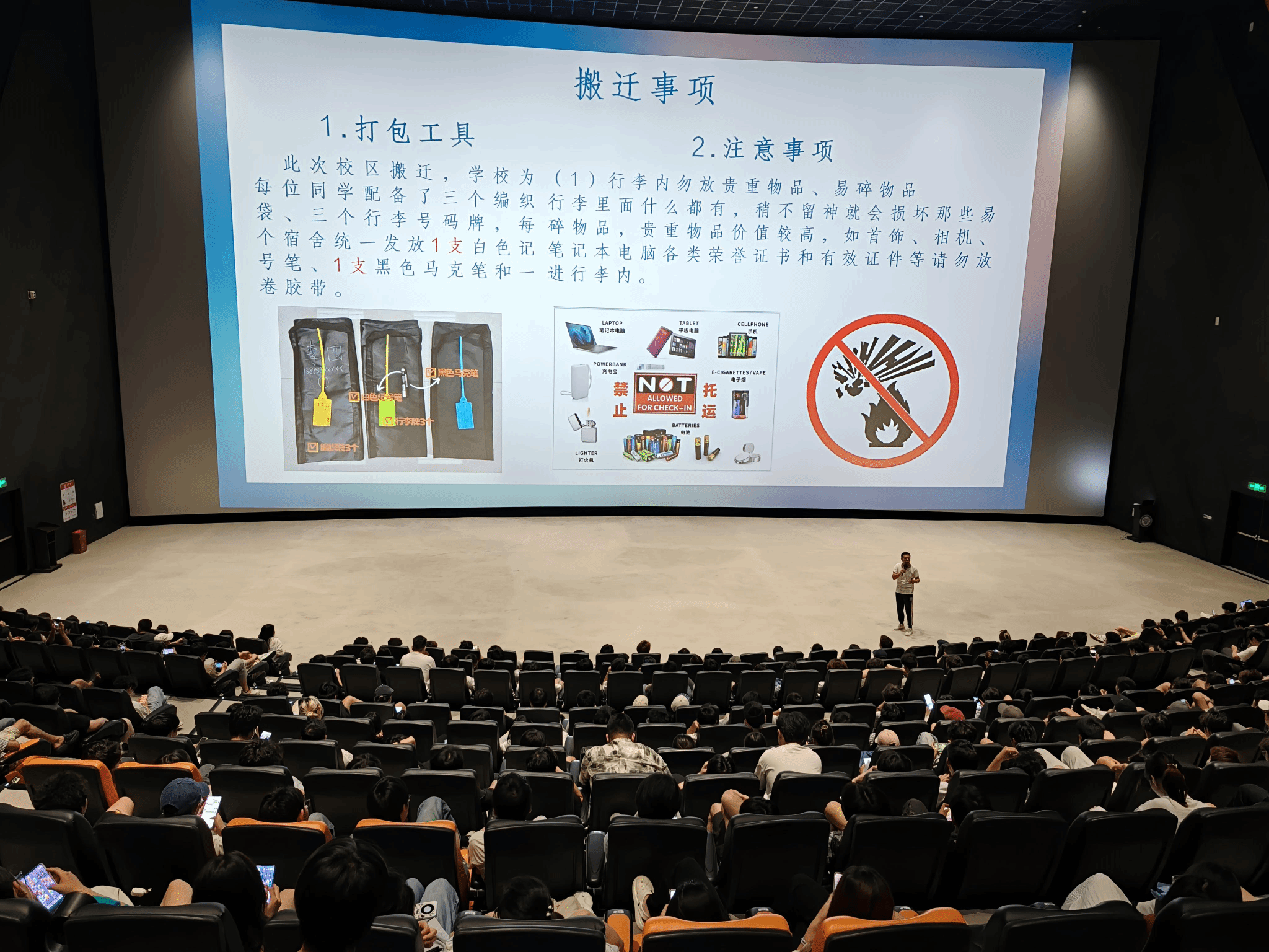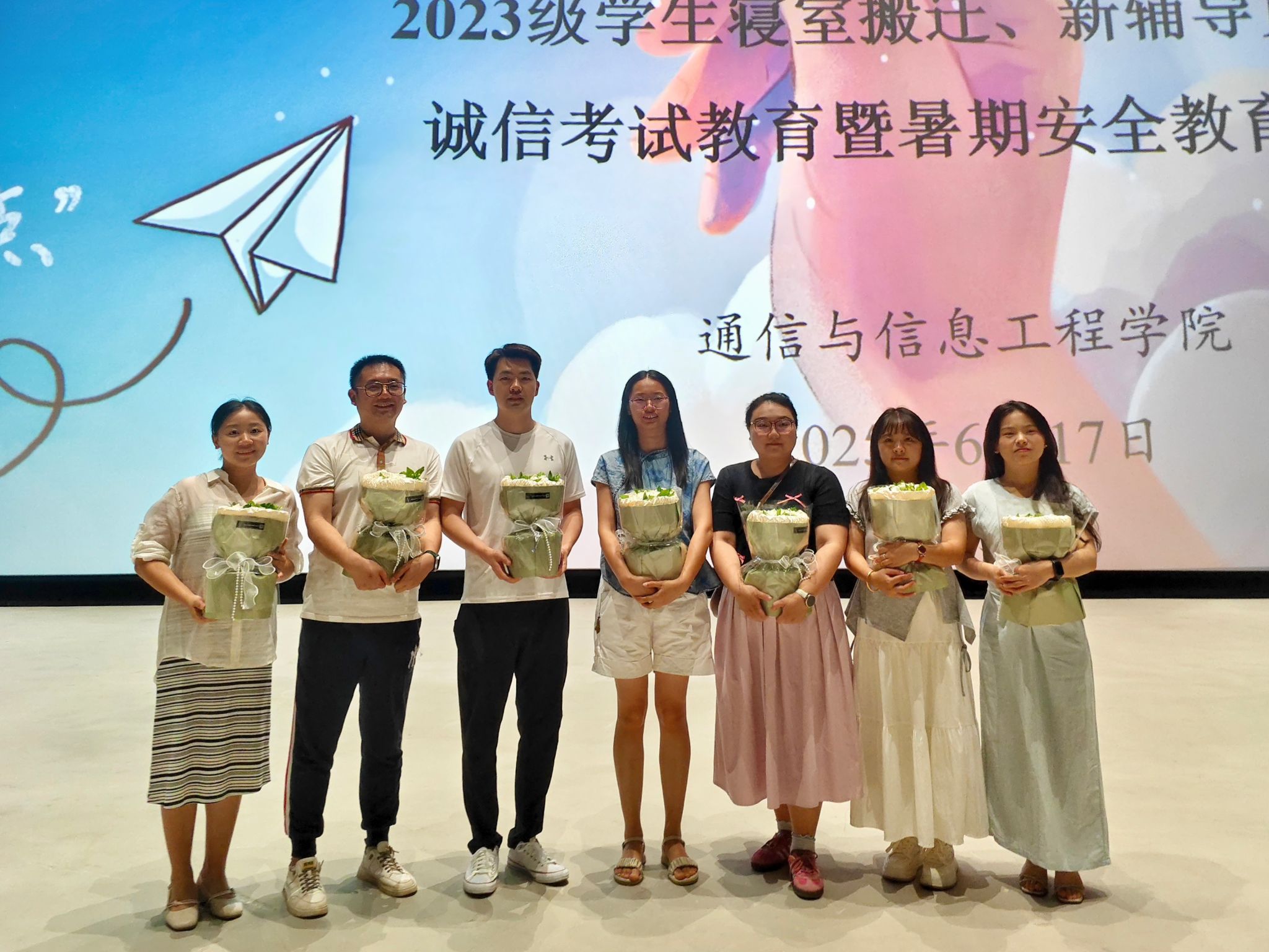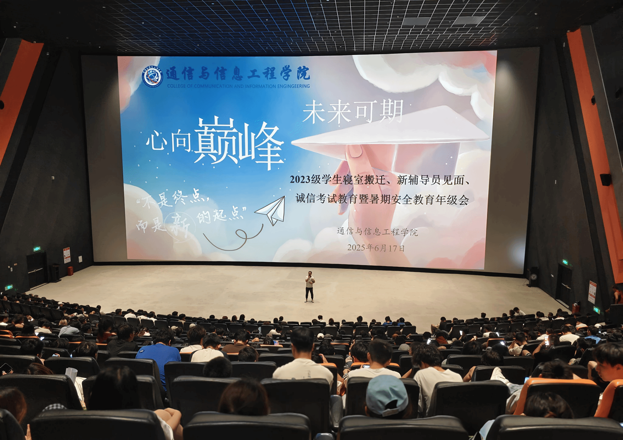 2025年6月17日中午,通信与信息工程学院在万画影城1号厅成功举办2023级学生寝室搬迁、新辅导员见面、诚信考试教育暨暑期安全教育年级会。本次会议内容涵盖寝室搬迁安排、新辅导员见面会、诚信考试教育及暑期安全教育四大主题,为即将升入合川校区的学生们提供全面的指导。