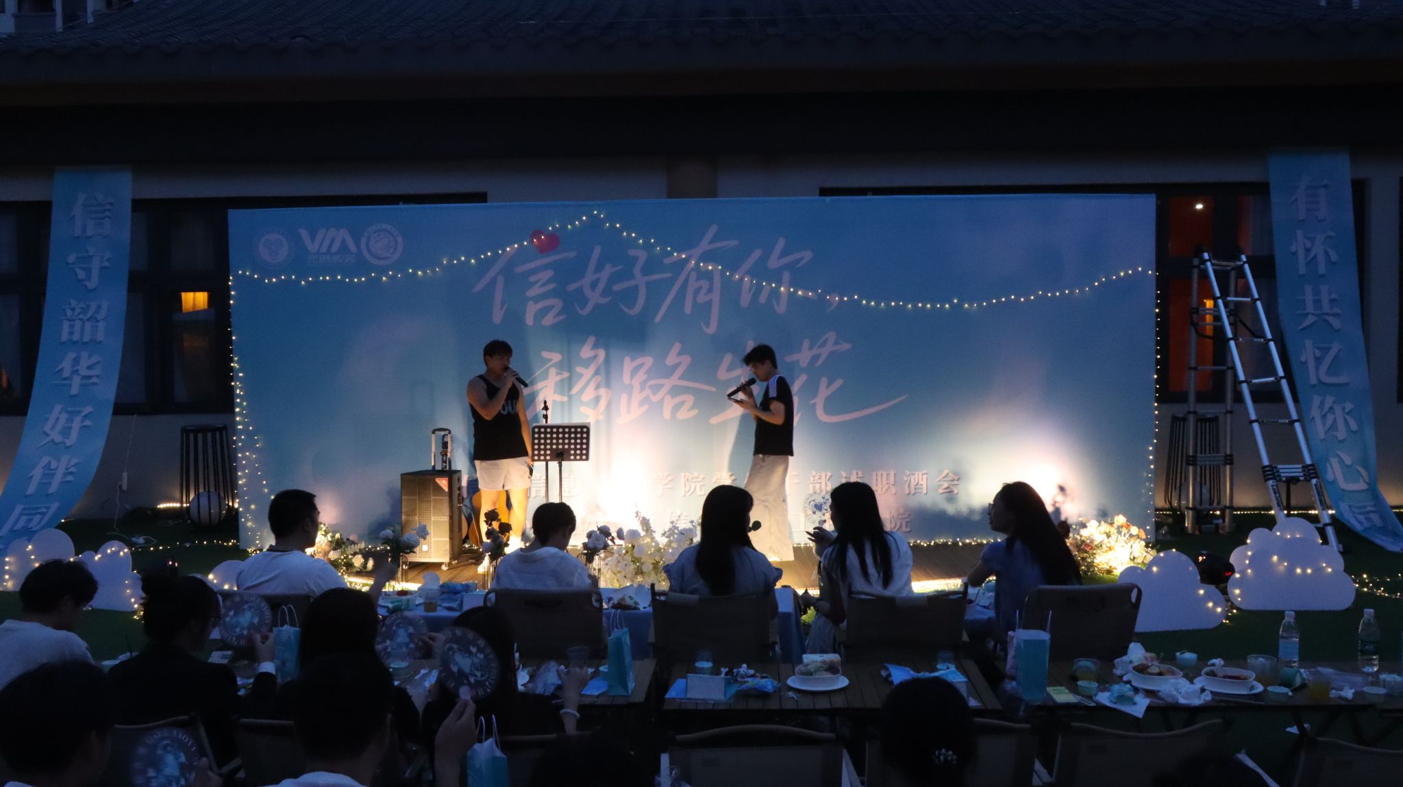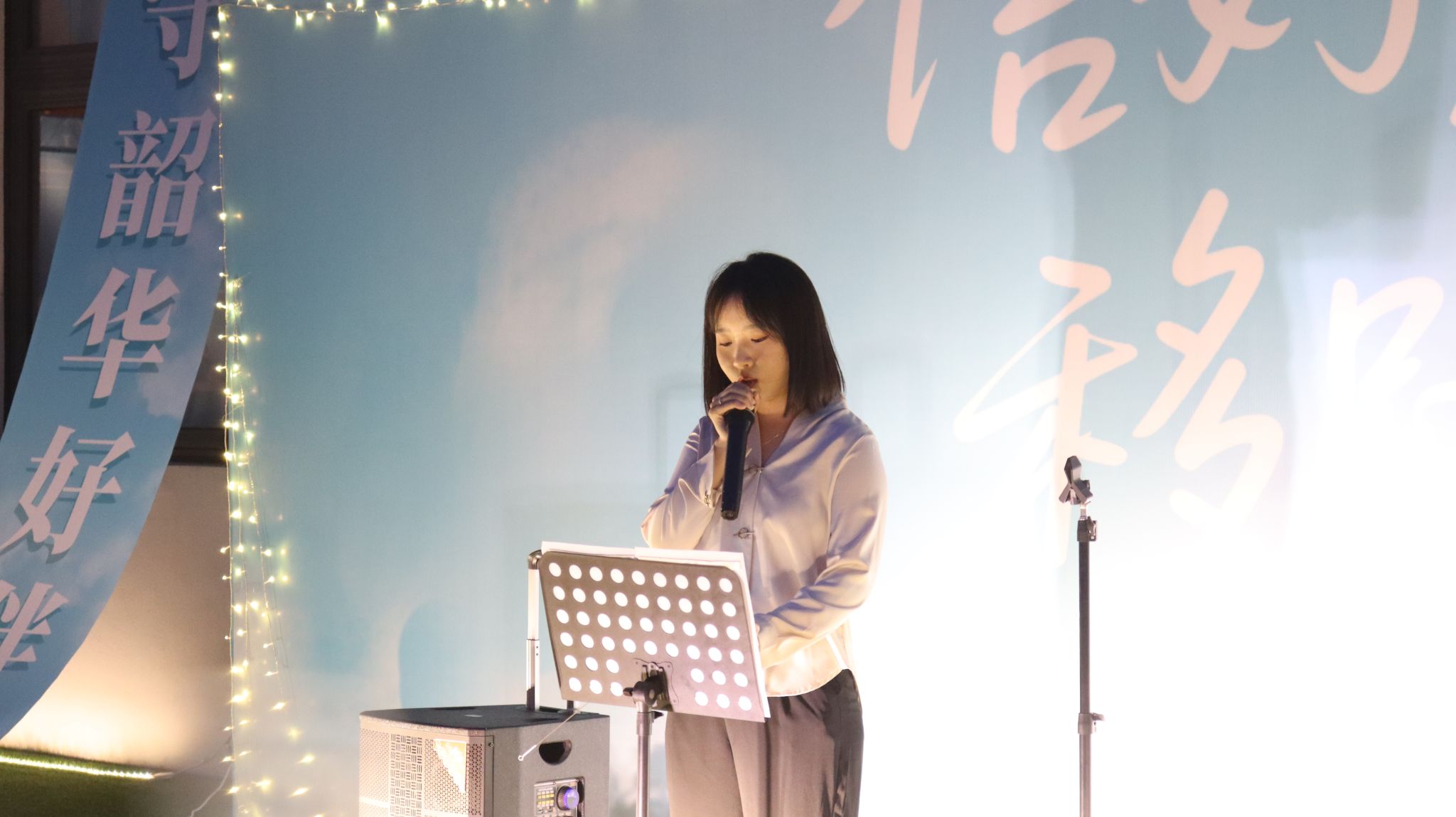 交流会于晚上7点正式拉开帷幕,主持人赖枫灵以热情洋溢的开场白点燃现场氛围。随后,吉他社成员用动人的旋律为现场增添了一抹文艺色彩。崔启威同学率先登场,以一首《活着》展现精湛的吉他技艺;李支圆与秦雨馨合唱的《等你下课》引发全场共鸣;李支圆独唱的《瘦子》更是将气氛推向高潮。老师们和同学们也纷纷展示才艺为晚会助兴。同学们手持扇子随节奏摇摆,为离别前夕的夜晚留下难忘的音乐记忆。