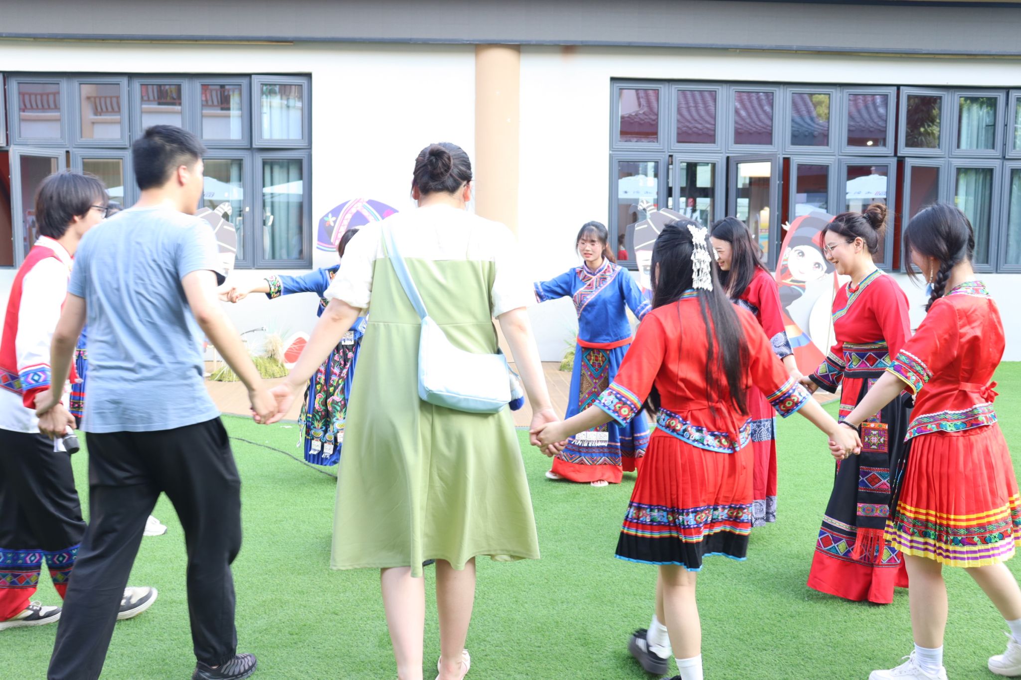 第四个环节是参赛者们手拉手围成圈共同跟随富有节奏的云南山歌进行打跳,同学们边唱边跳,动作潇洒自如,展现民族风采,活动现场洋溢着欢乐和活力。