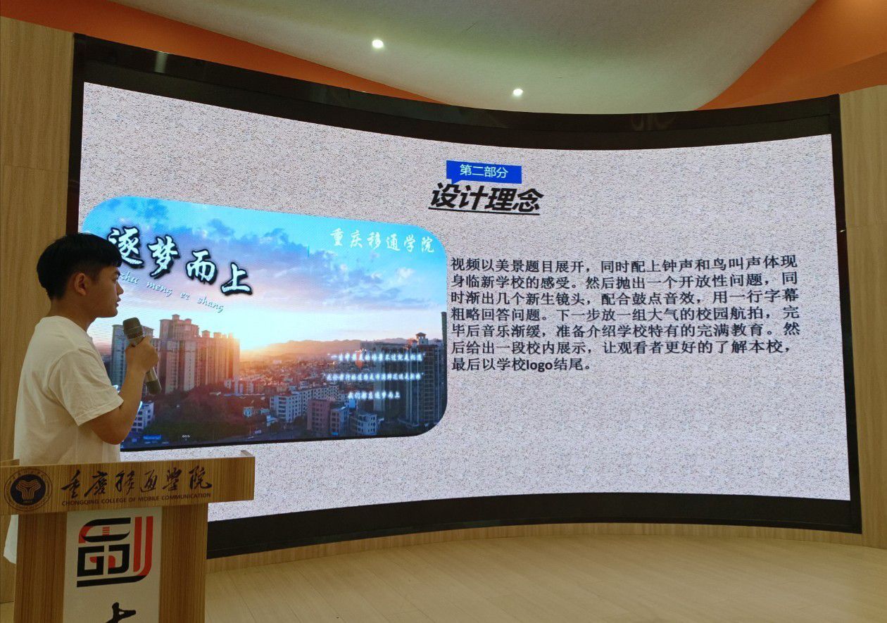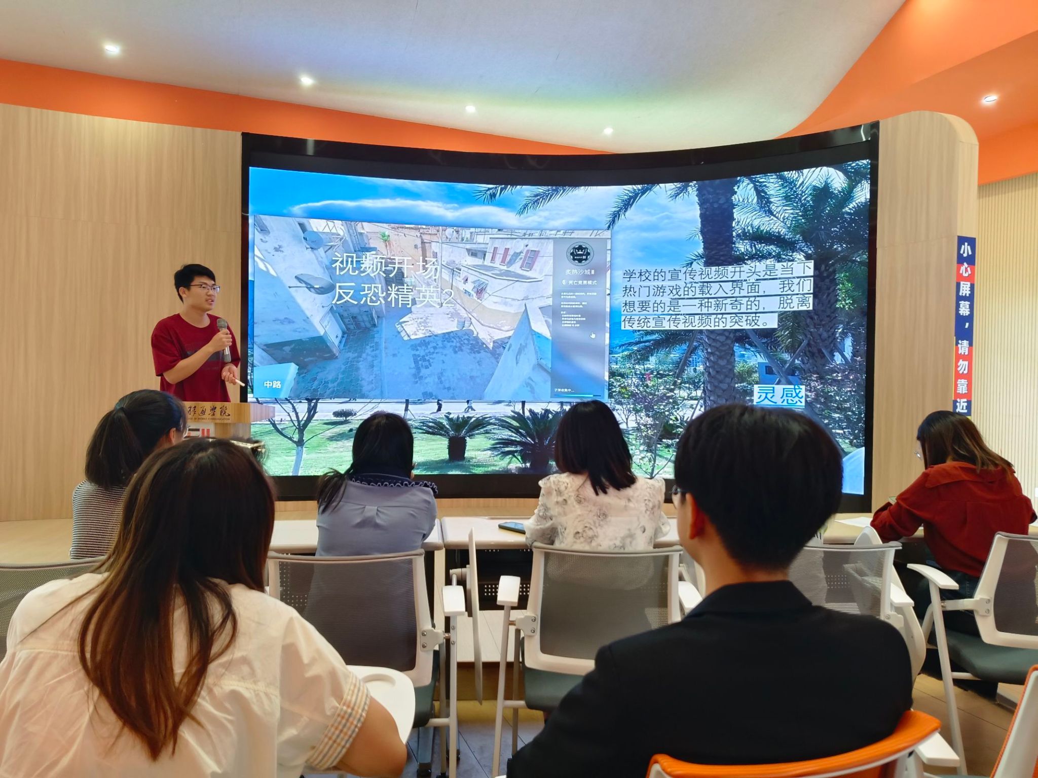 紧接着,七位选手依次上台,展示他们小组的招生广告创意设计。每个小组的创意都独具匠心,其中不乏以视频和动画为载体的作品。有的选手以银行卡为媒介,将学校的风景印于其上,展示了学校的环境之美;有的则介绍了本校的“四位一体双院制+特色课程”的人才培养模式,以及“乐教、乐学、创造、创业”的校训精神,充分展示了本校的教育资源优势,每个小组的创意设计都别具一格,生动地呈现了学校的特色教育和生活特色。